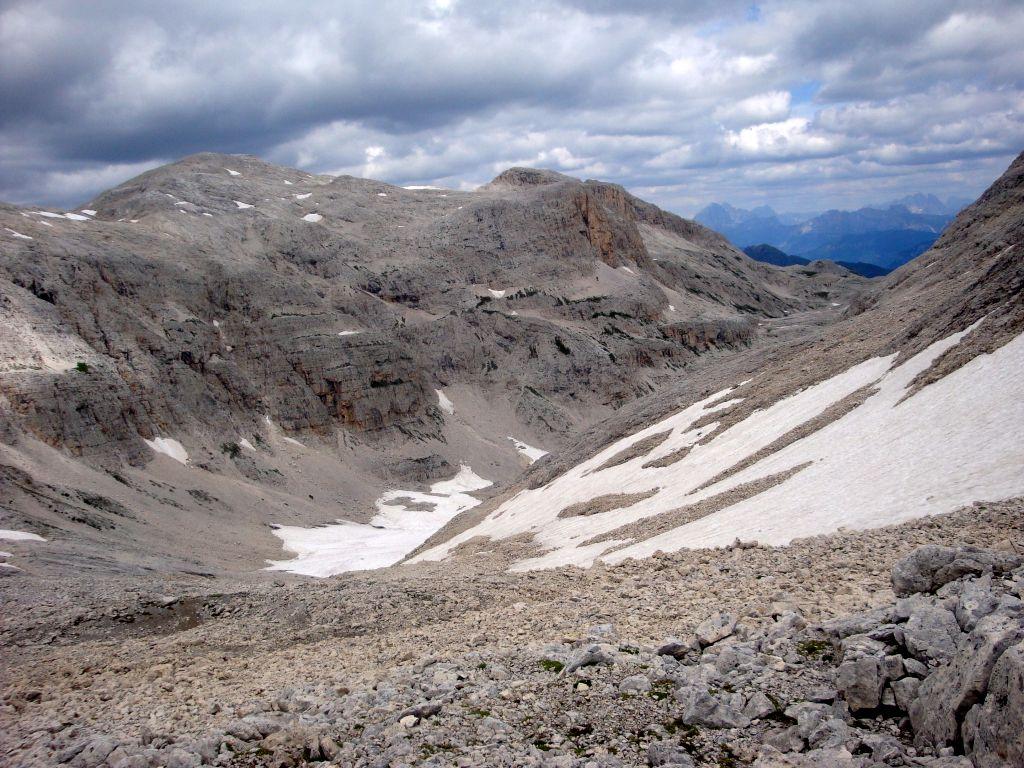 Arrivati alla sella risalire a sinistra per traccia con segni rossi il faticoso ghiaione di grossi sassi e rocce che porta alla Forc. Manstorna (2746 m) ormai ben visibile. Dalla forcella si apre la vista sulla Cima Lastei e su alcuni pinnacoli e torrioni che la precedono. Giunti sulla forcella spostarsi a sinistra (ometti) e risalire il breve muretto di roccia (I+) oltre il quale per sassi e roccette si sale ad una antecima (ometto in cima). Scendere senza traccia per sassi e ghiaie verso sinistra al sottostante avvallamento, mantenendosi in traversata in alto a destra per non perdere troppa quota. Con un arco per il terreno roccioso si giunge ad un pianoro e da qui si risale in obliquo verso sinistra, senza percorso obbligato, per banali gradoni ricoperti di sassi e ghiaie, raggiungendo l’ampia cresta di detriti.