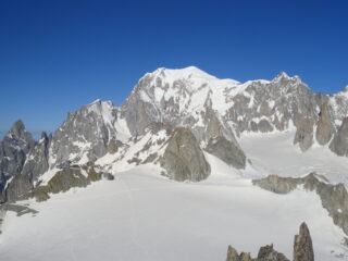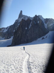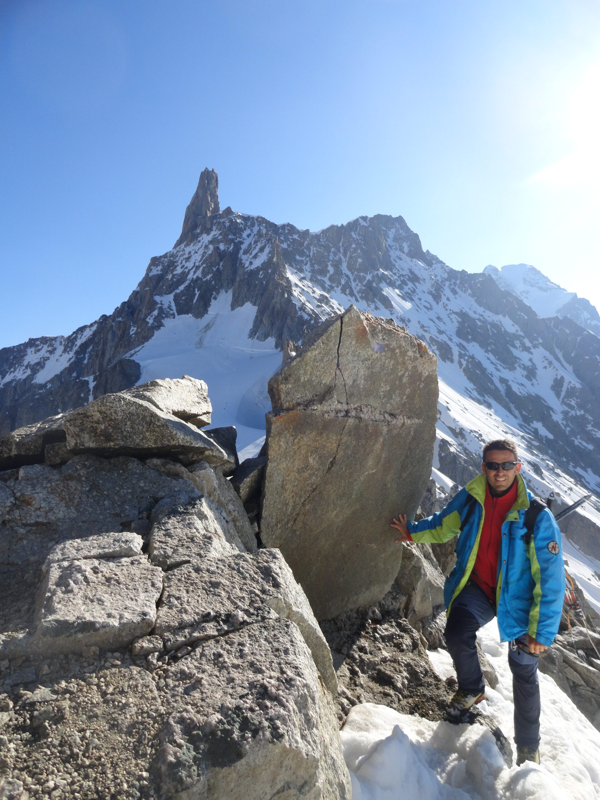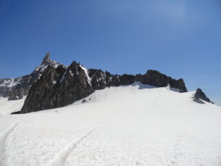 Qualche cordata lungo la cresta, ma tutti sparsi senza creare tappi. Dopo aver raggiunto la Punta N, abbiamo percorso la cresta integrale, scendendo su ghiacciaio dopo la Punta S. Cresta divertente, la cui parte più difficile risulta essere l’accesso alla “pala” finale della Punta Sud; nel traverso sulla sx (esposto) ci sono un paio di spit che risultano molto utili, e poi la fessura verticale. Proseguendo una decina di metri dopo la Punta Sud si presenta un salto (calata attrezzata) che deposita in un canalino terroso girato verso est; successivamente per massi e rocce si giunge a un canale di sfasciumi che conduce sul ghiacciaio.