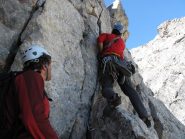 7)Spostandosi un poco a sinistra, si attacca un diedro che si risale uscendone in obliquo a destra su placche piuttosto lisce (V) poi, superando un gradino a sinistra, si raggiunge una terrazza e si sosta subito sopra su spuntone. 45 m