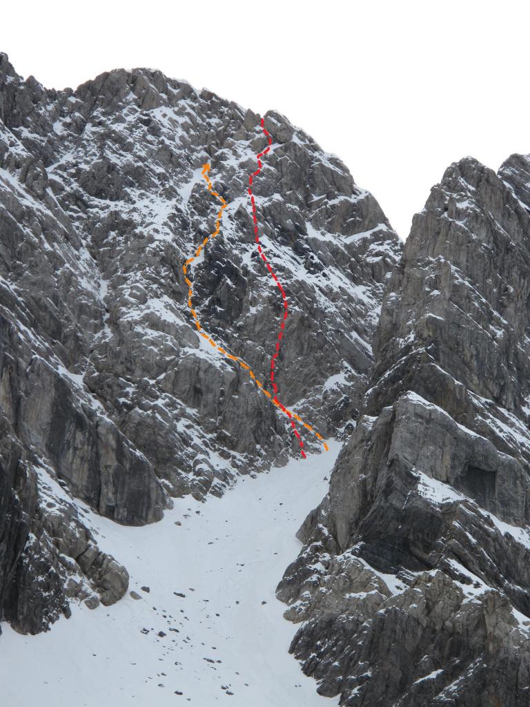 1) Si sale direttamente per 10-15 metri per rocce articolate (III) fino alla grande cengia che si segue a sinistra per una ventina di metri. Dove la cengia diventa rampa di rocce lisce cosparse di detriti, la si rimonta ancora per pochi metri, poi si va a destra per gradini fino ai piedi di una evidente fessura. 35 m