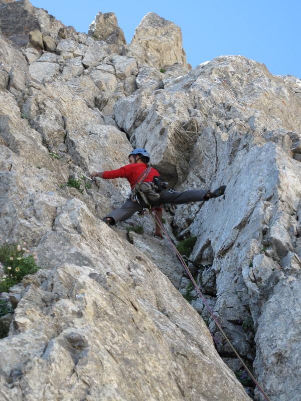 6) Si sale direttamente per una serie di risalti, sfruttando fessure e costoloni (IV e IV+, blocchi instabili), fino ad una grande cengia dove si sosta alla base di un muro compatto. 45 m