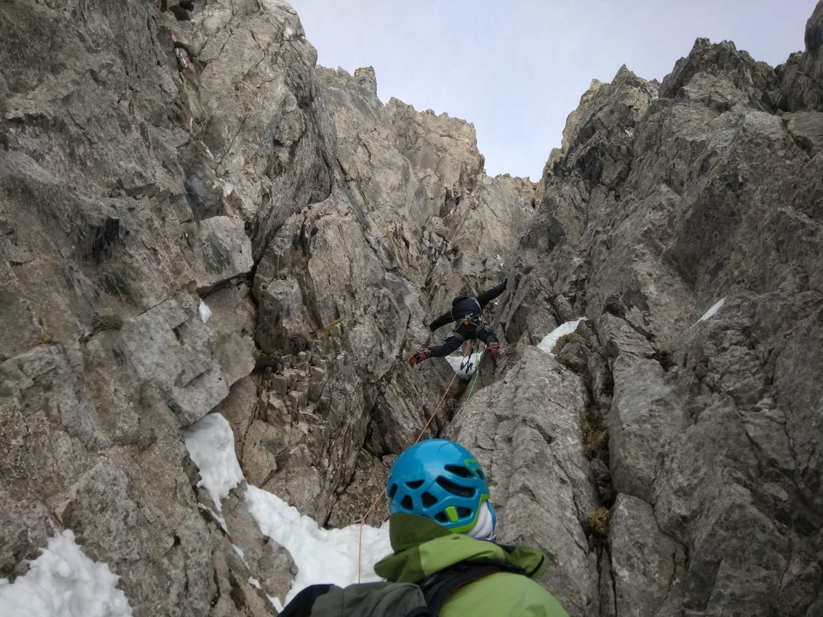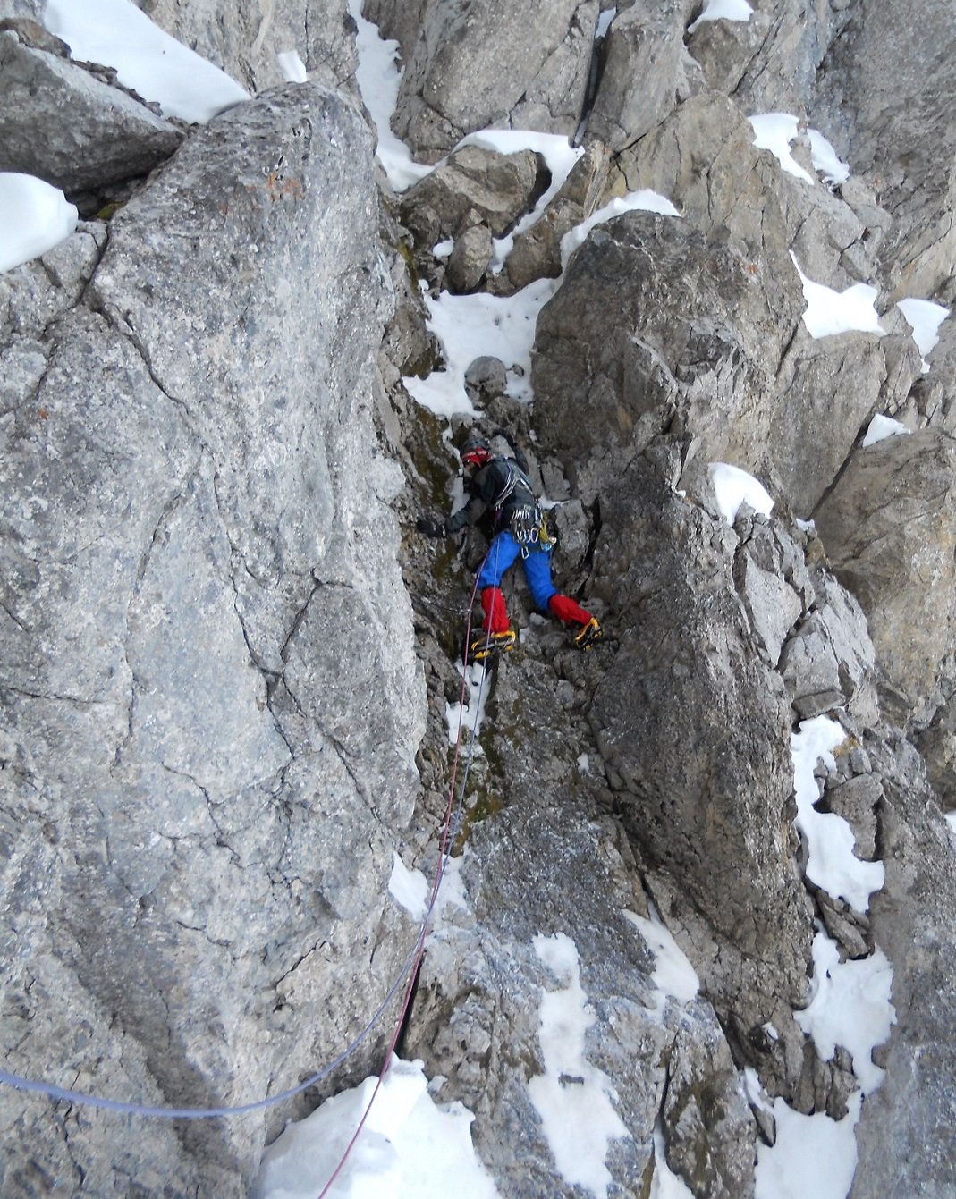 Si risale il canale fino alla cengia Garibaldi (2200m)e dopo 60m di traverso verso sinistra, si è all'attacco. 3h30 circa.