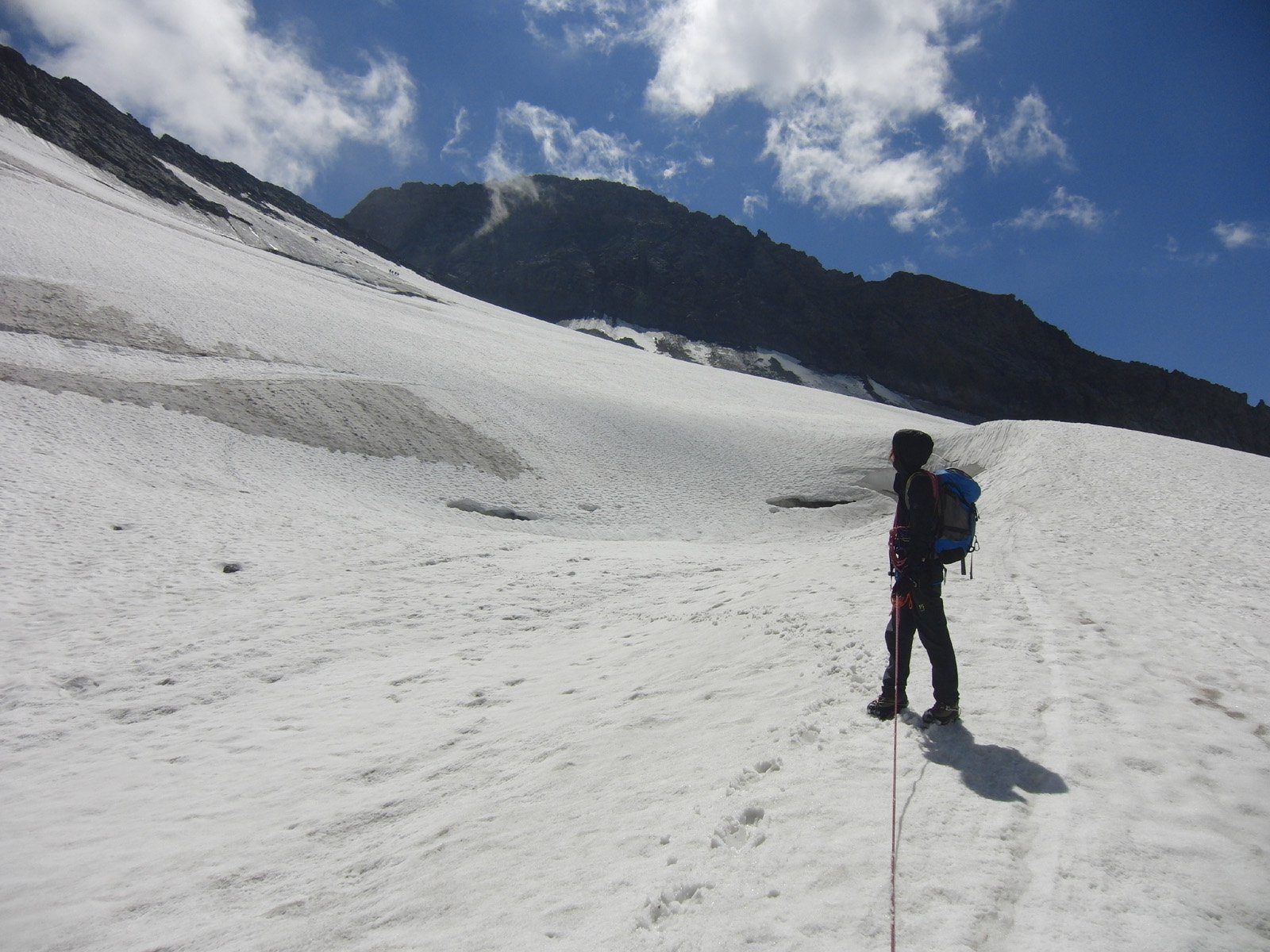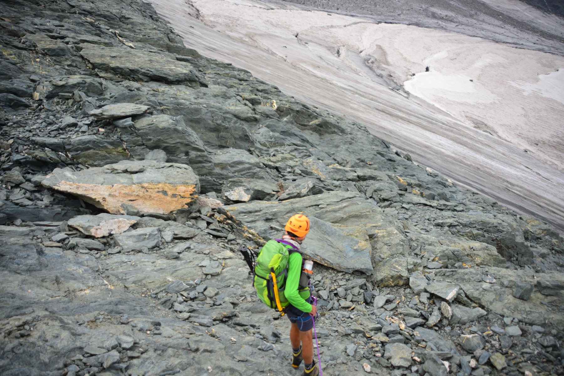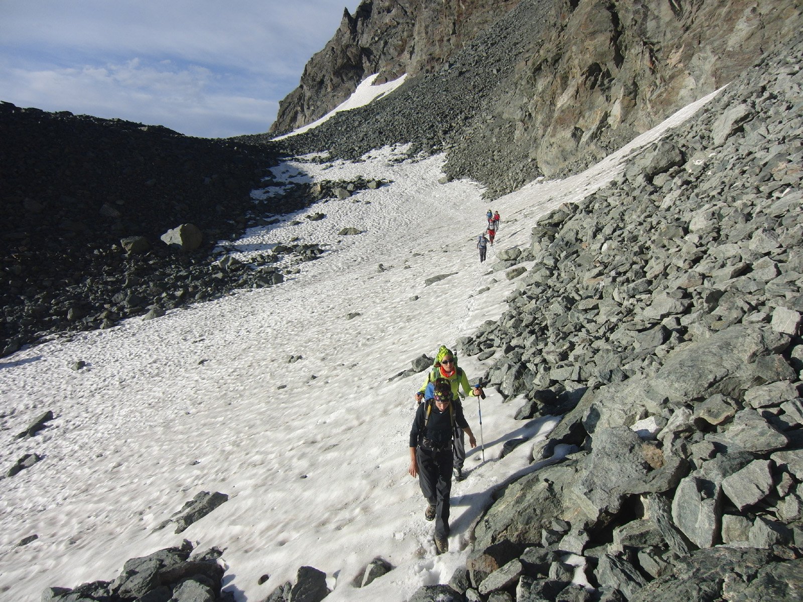 Per il ritorno proseguire scendere di pochi metri su roccia e quindi mettere piede sul ghiacciaio, fare un largo giro di aggiramento dei crepacci e riportarsi successivamente in direzione del colle d’Arnas, che si raggiunge risalendo una ripido pendio di sfasciumi di una cinquantina di metri.