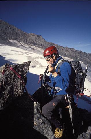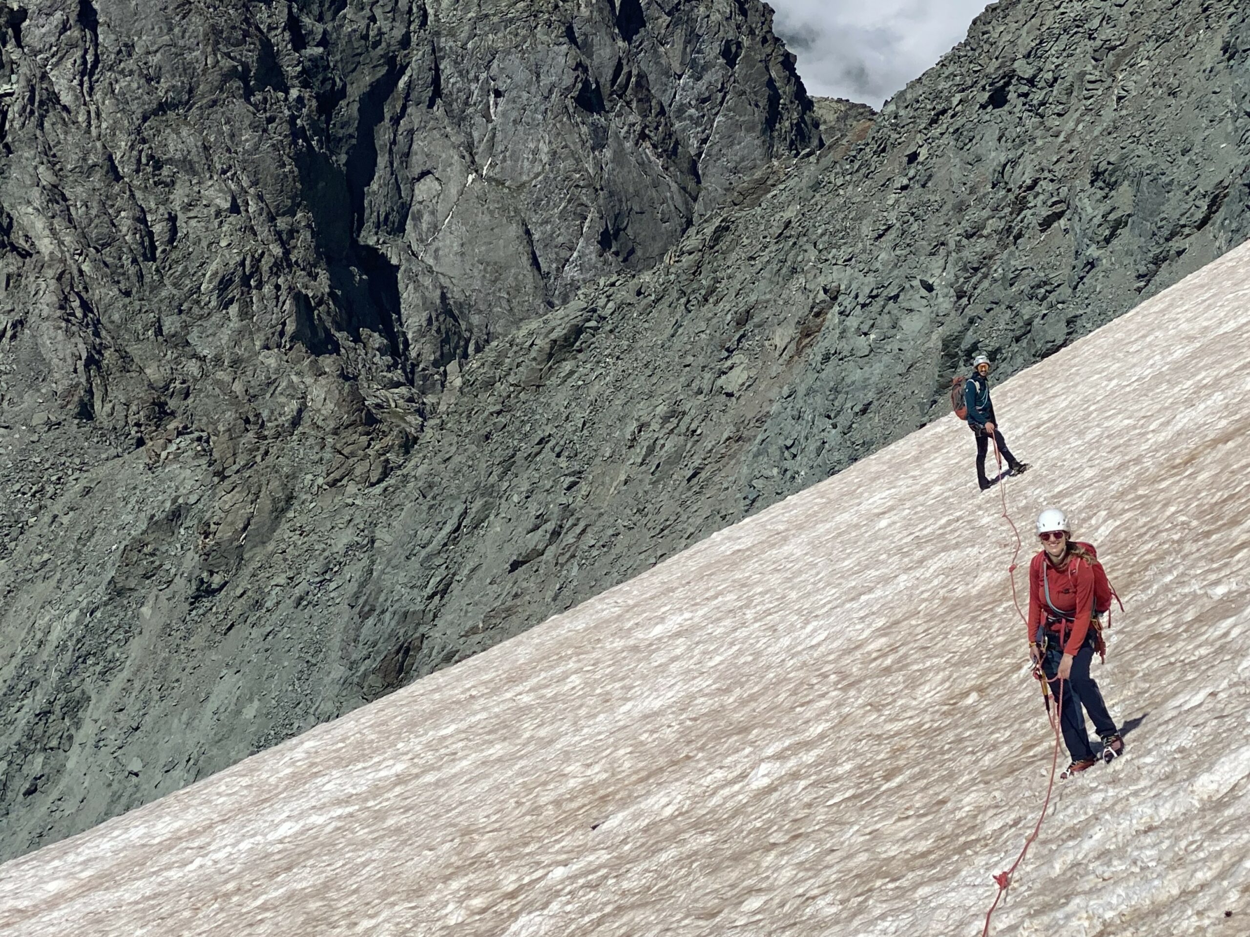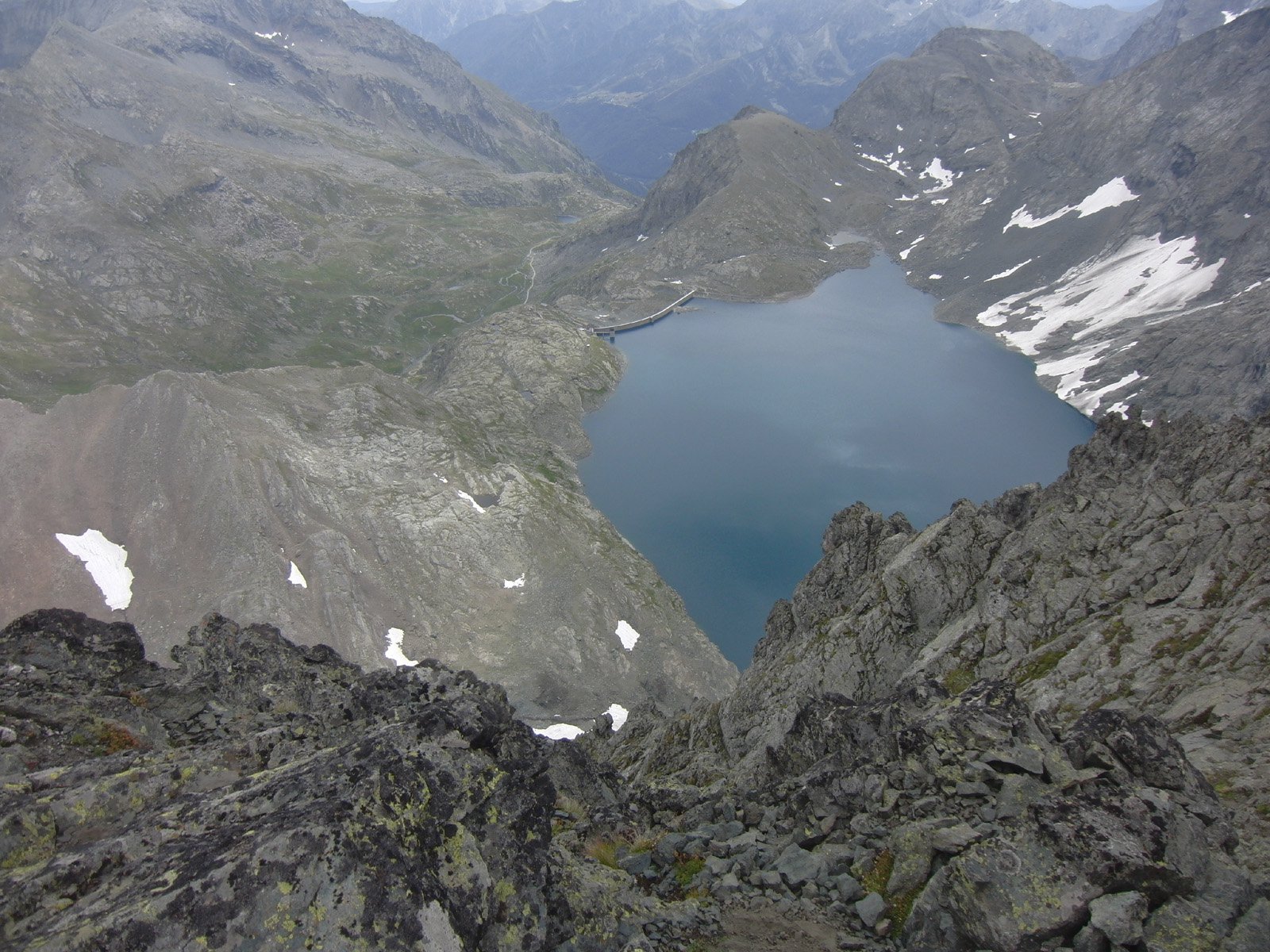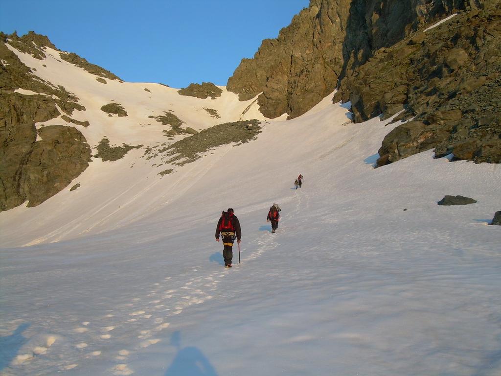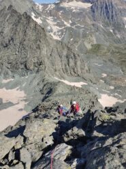 Per il ritorno proseguire scendere di pochi metri su roccia e quindi mettere piede sul ghiacciaio, fare un largo giro di aggiramento dei crepacci e riportarsi successivamente in direzione del colle d’Arnas, che si raggiunge risalendo una ripido pendio di sfasciumi di una cinquantina di metri.