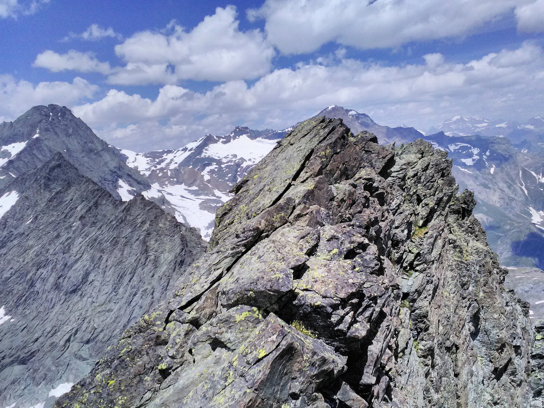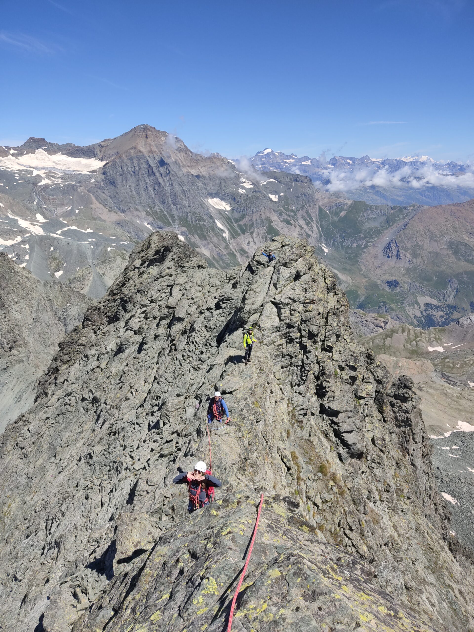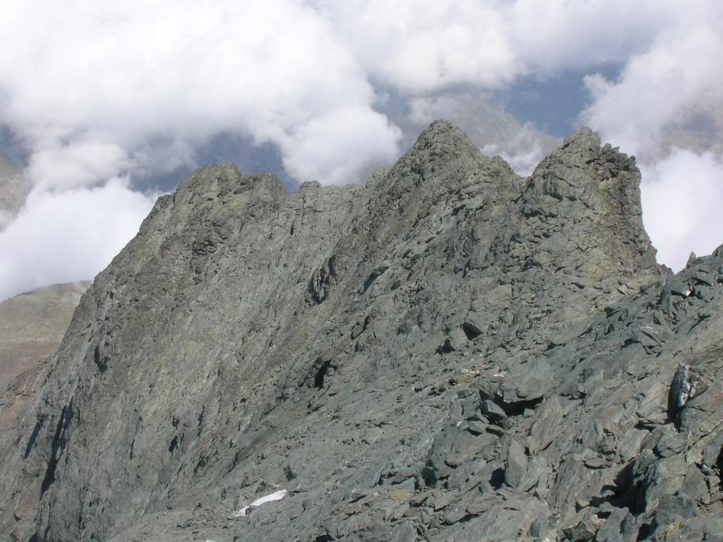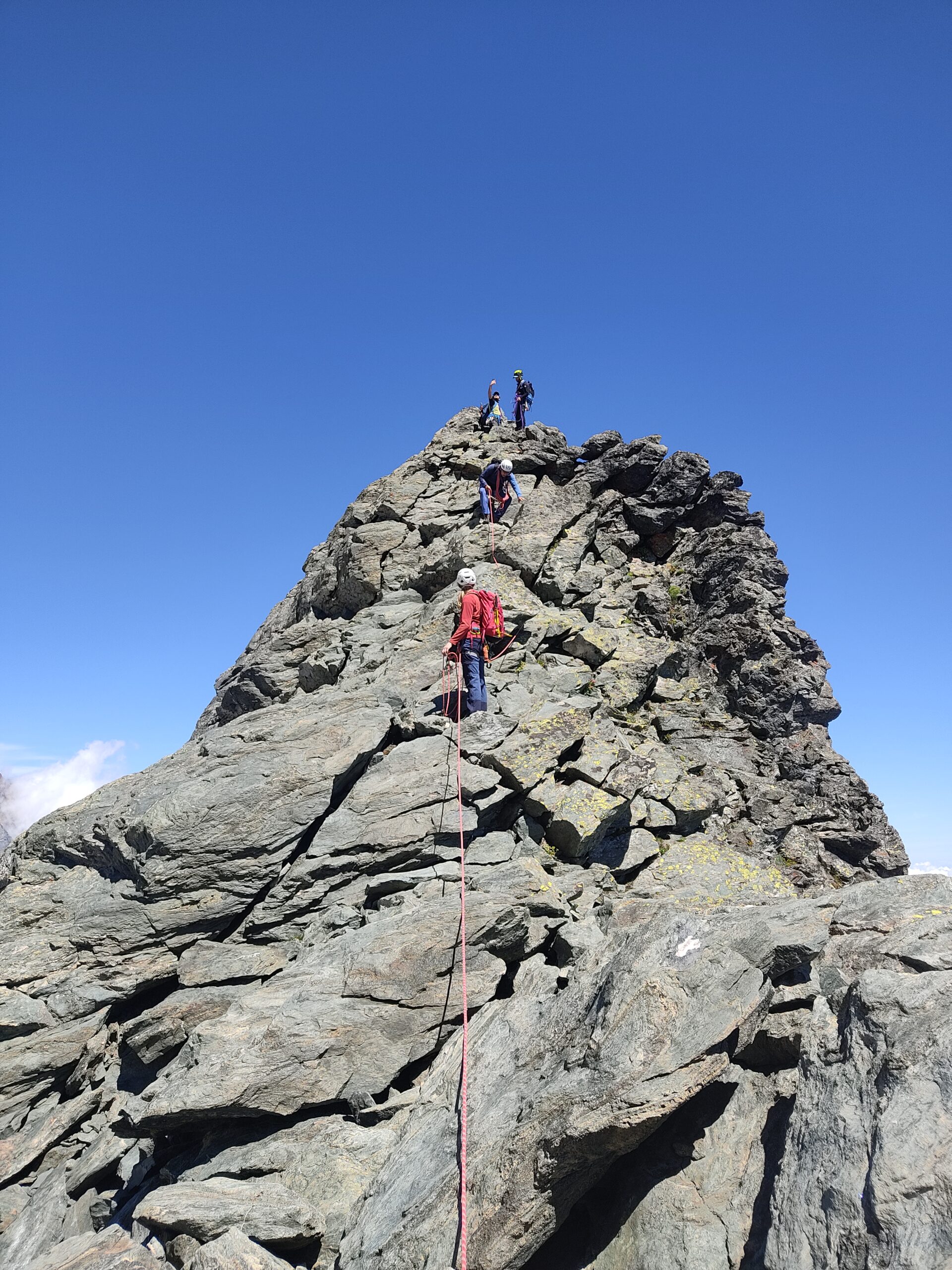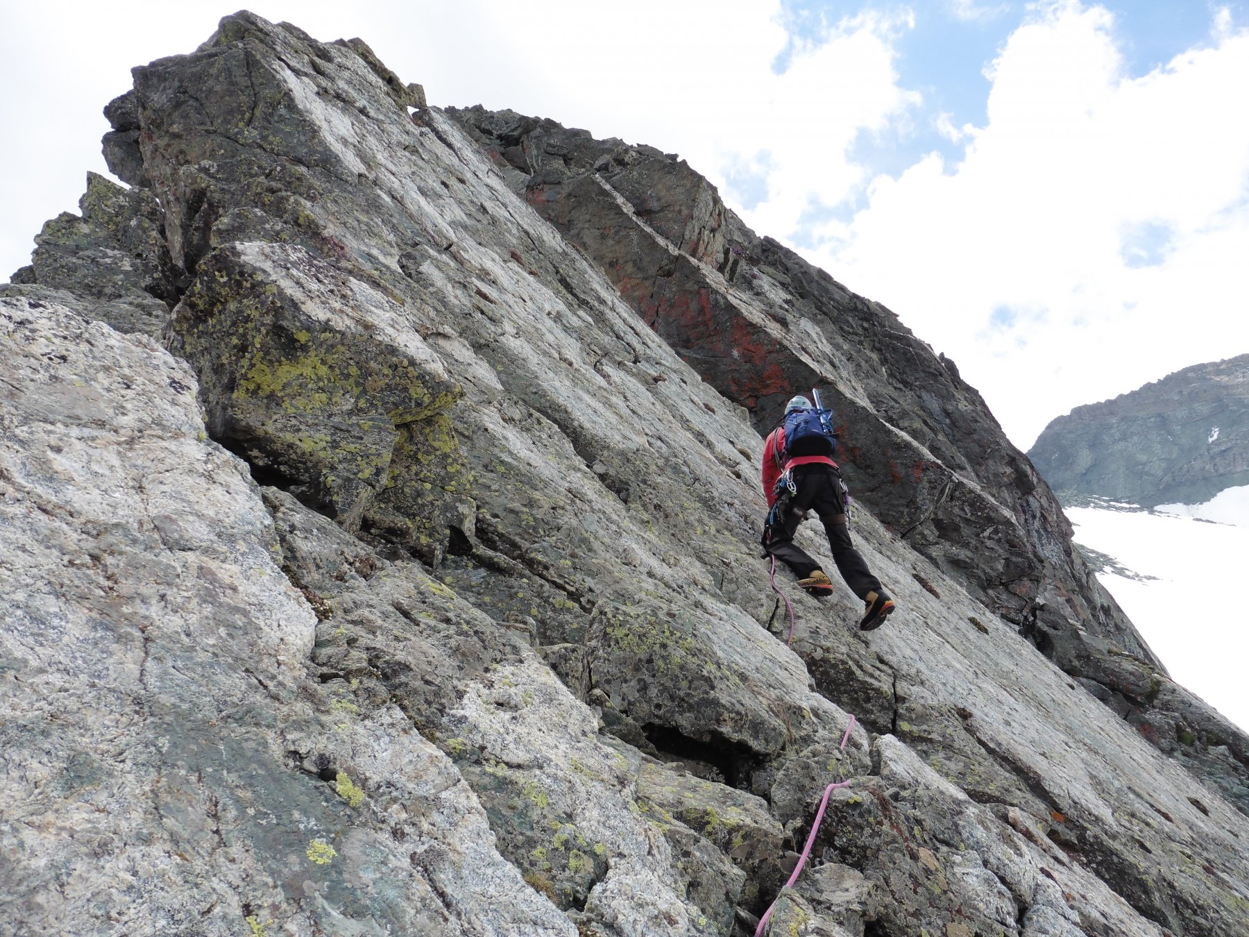 Da questa portarsi brevemente sul versante italiano e salire per un camino che riporta in cresta fattasi molto più affilata, la si segue interamente per il filo fino alla vetta con croce (è anche possibile aggirare le difficoltà).