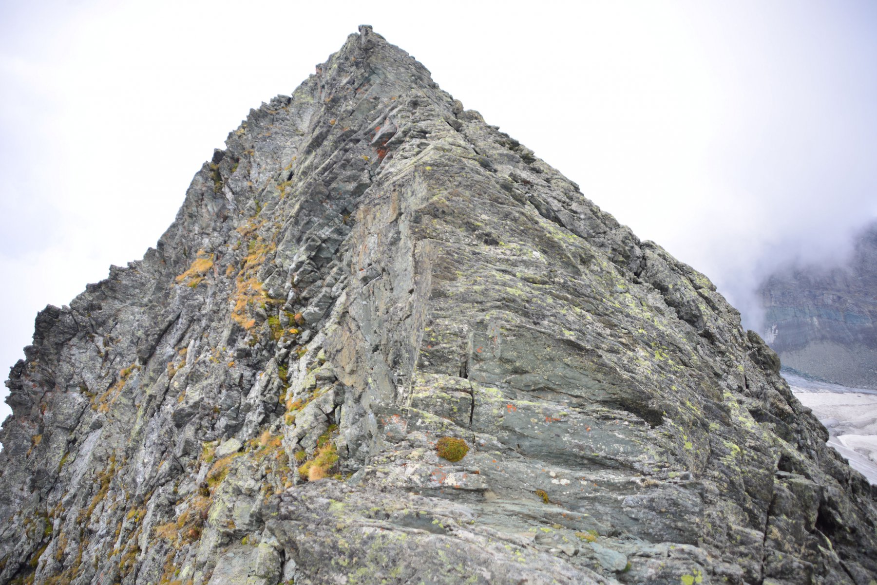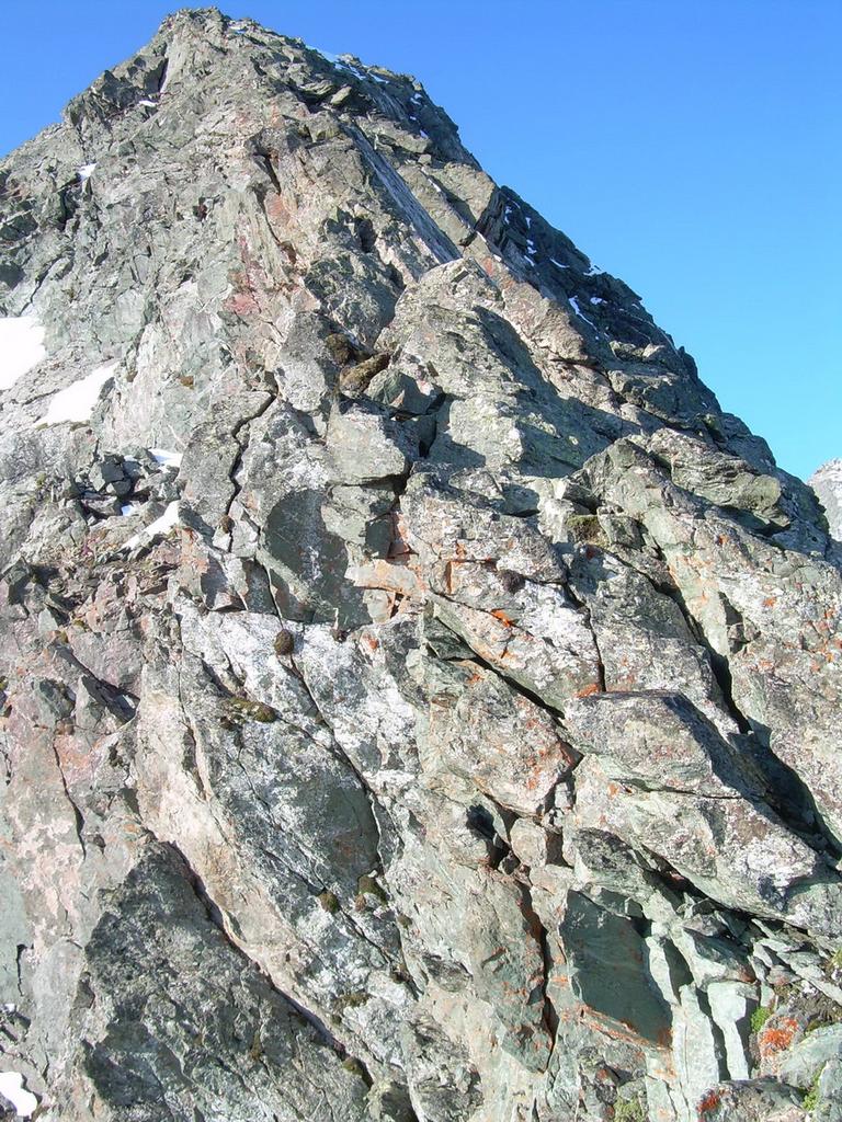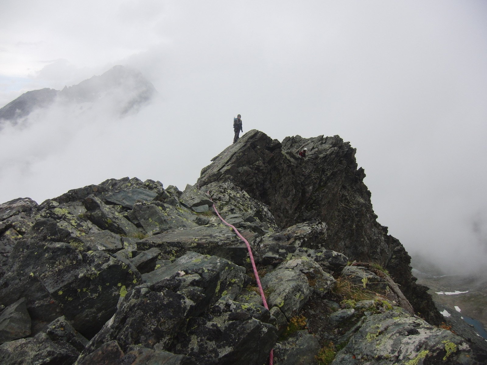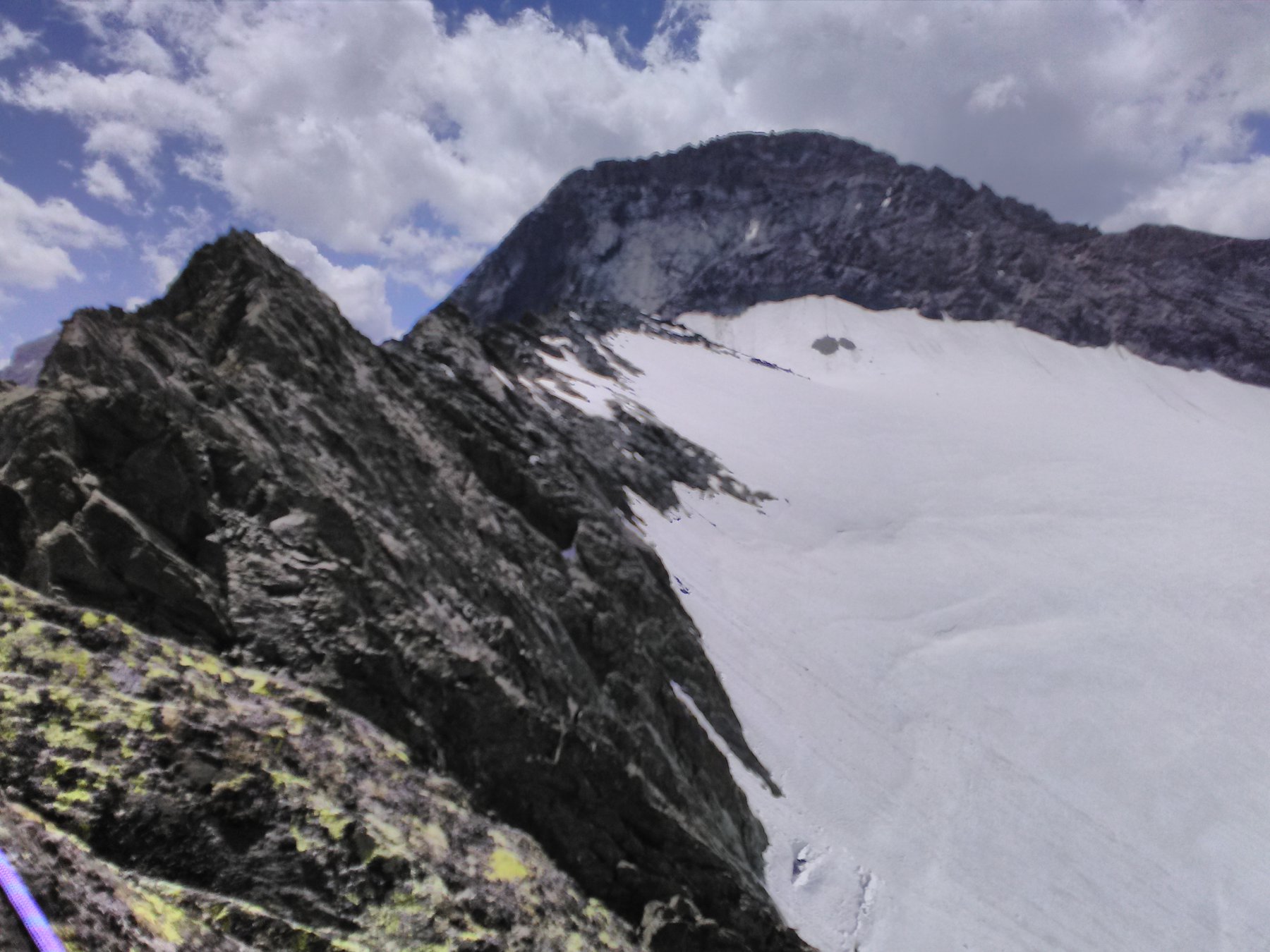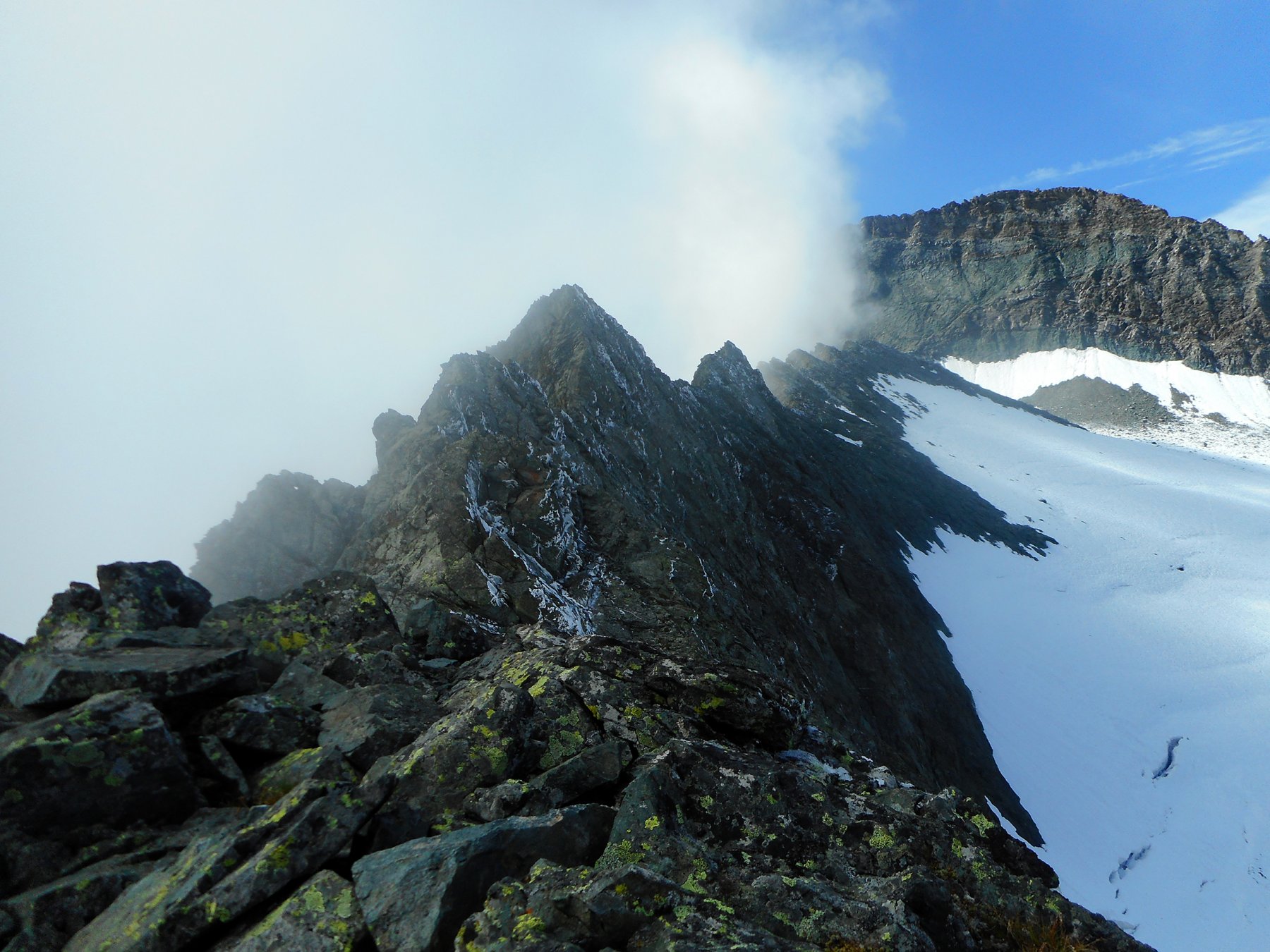 Da questa portarsi brevemente sul versante italiano e salire per un camino che riporta in cresta fattasi molto più affilata, la si segue interamente per il filo fino alla vetta con croce (è anche possibile aggirare le difficoltà).