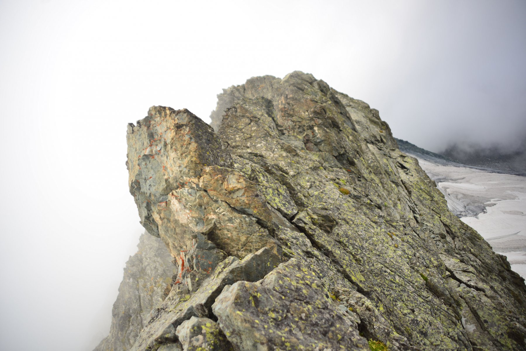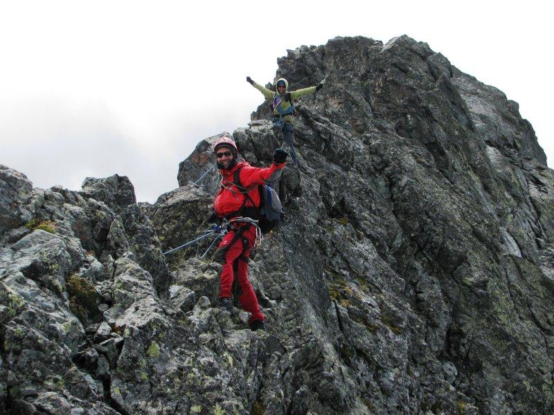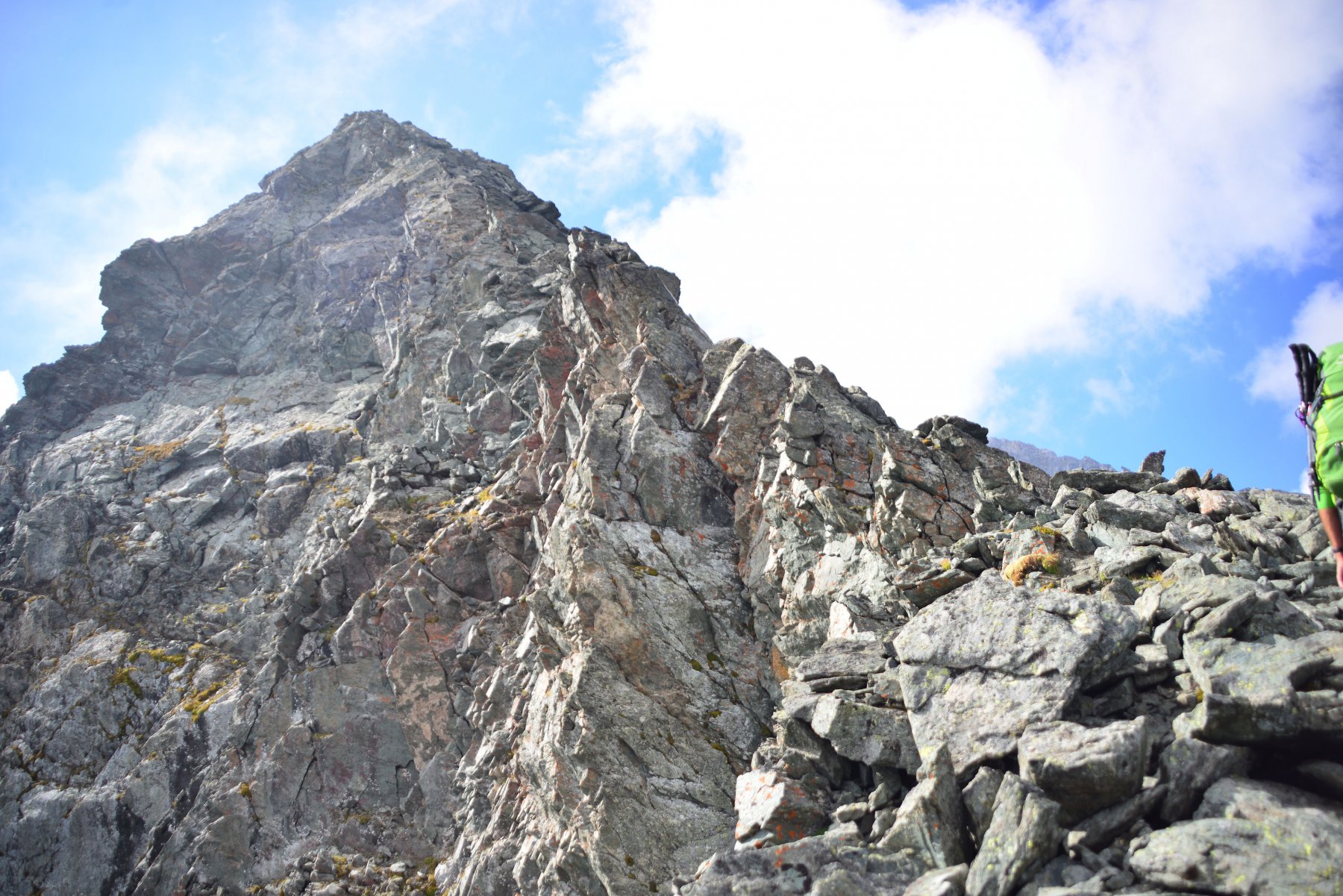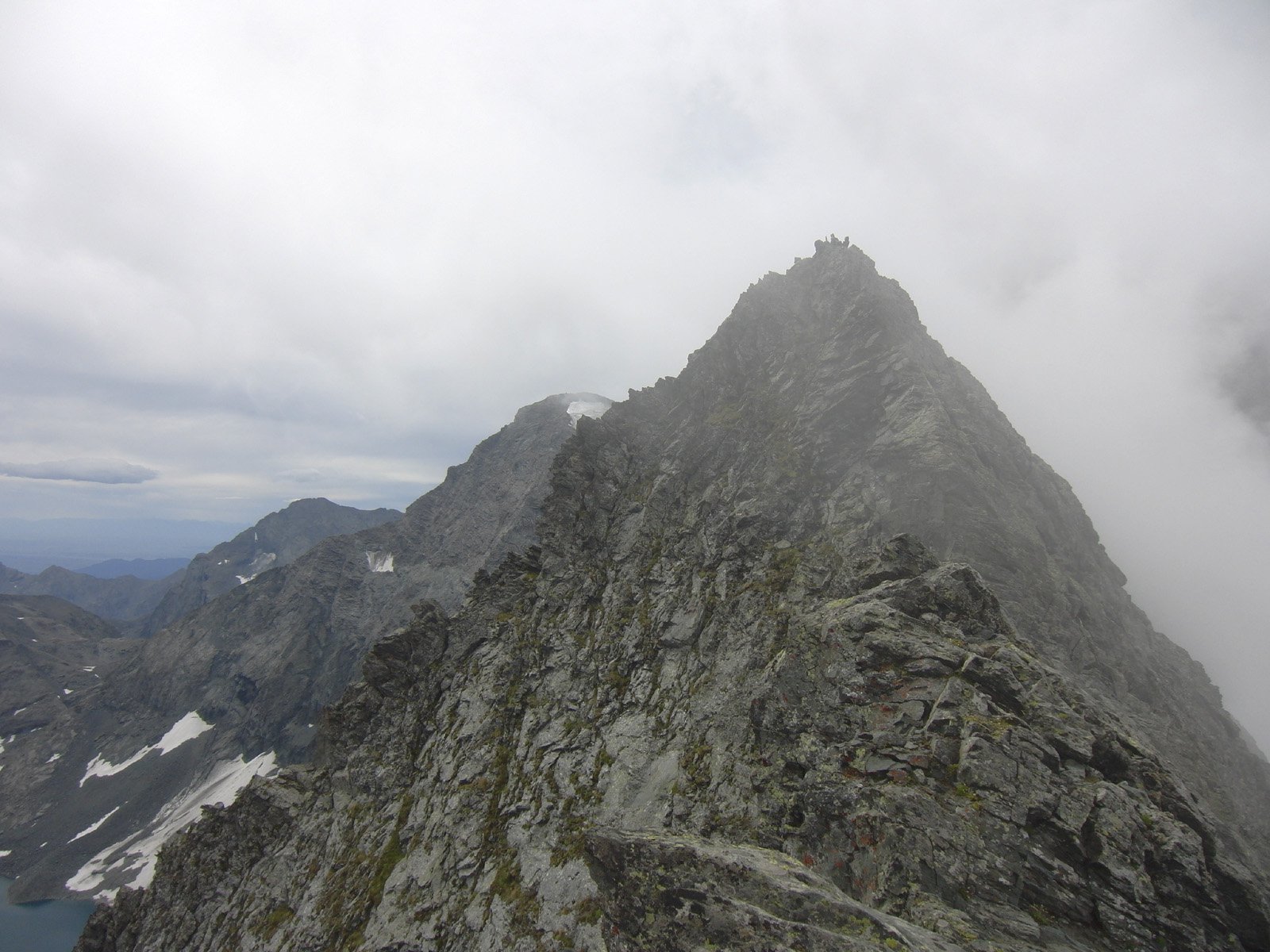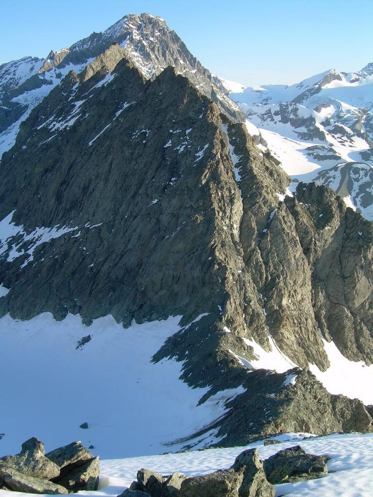 Da questa portarsi brevemente sul versante italiano e salire per un camino che riporta in cresta fattasi molto più affilata, la si segue interamente per il filo fino alla vetta con croce (è anche possibile aggirare le difficoltà).