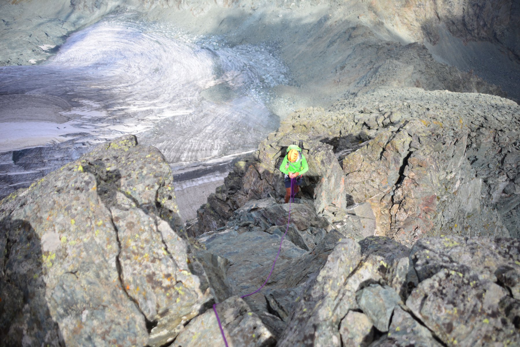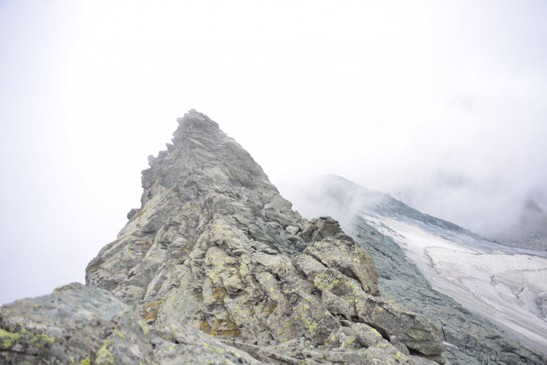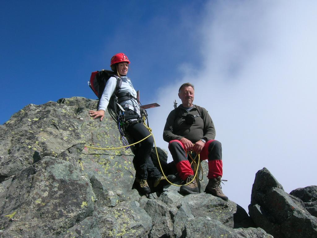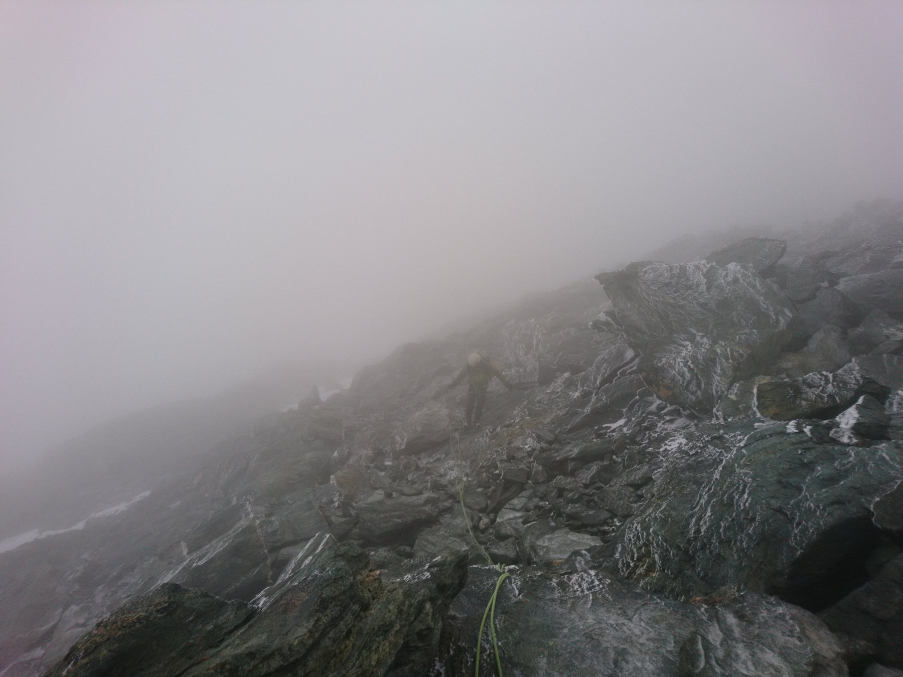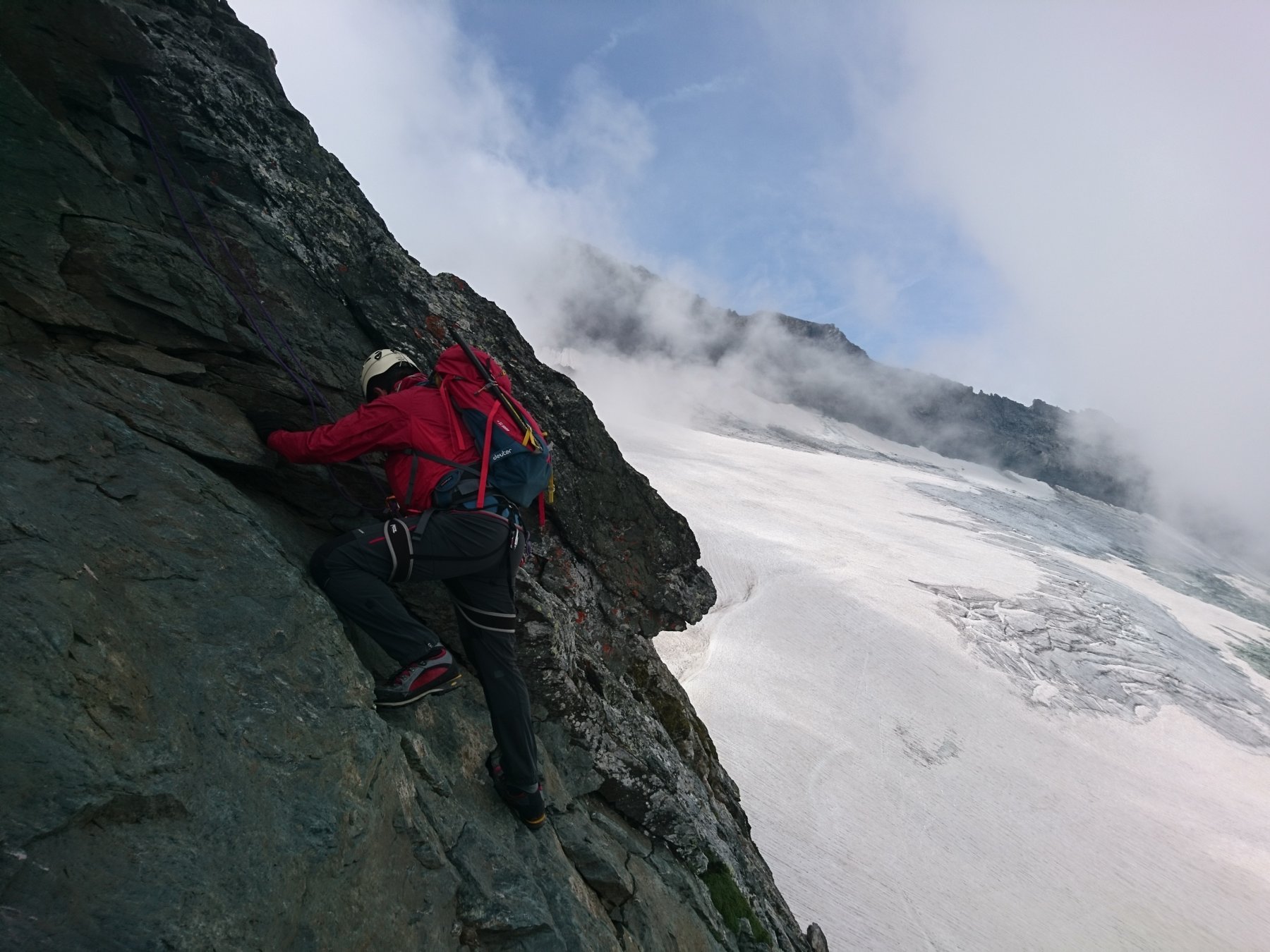 Da questa portarsi brevemente sul versante italiano e salire per un camino che riporta in cresta fattasi molto più affilata, la si segue interamente per il filo fino alla vetta con croce (è anche possibile aggirare le difficoltà).