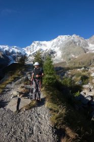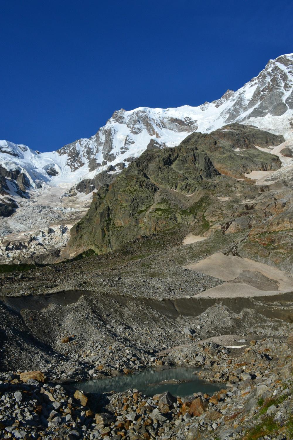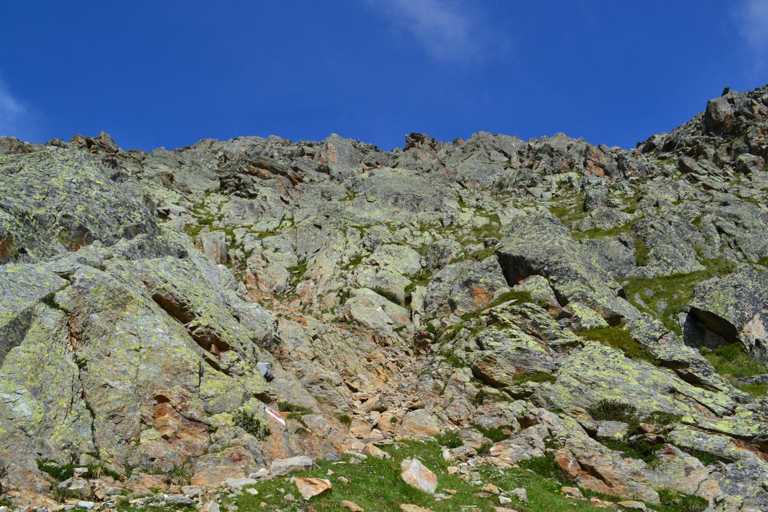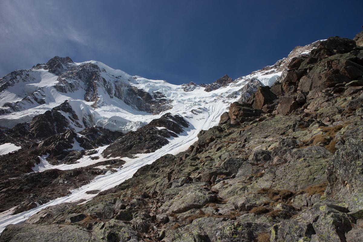 Si prosegue lungo il ghiacciaio su sfasciumi e dopo circa 30 min. si raggiunge il vecchio sentiero; a questo punto si sale lungo una traccia che si fa man mano più ripida, ma che non presenta alcuna difficoltà, avendo a destra la seraccata basale del ghiacciaio della Norden e a sinistra le rocce rossastre del Crestone Marinelli.
