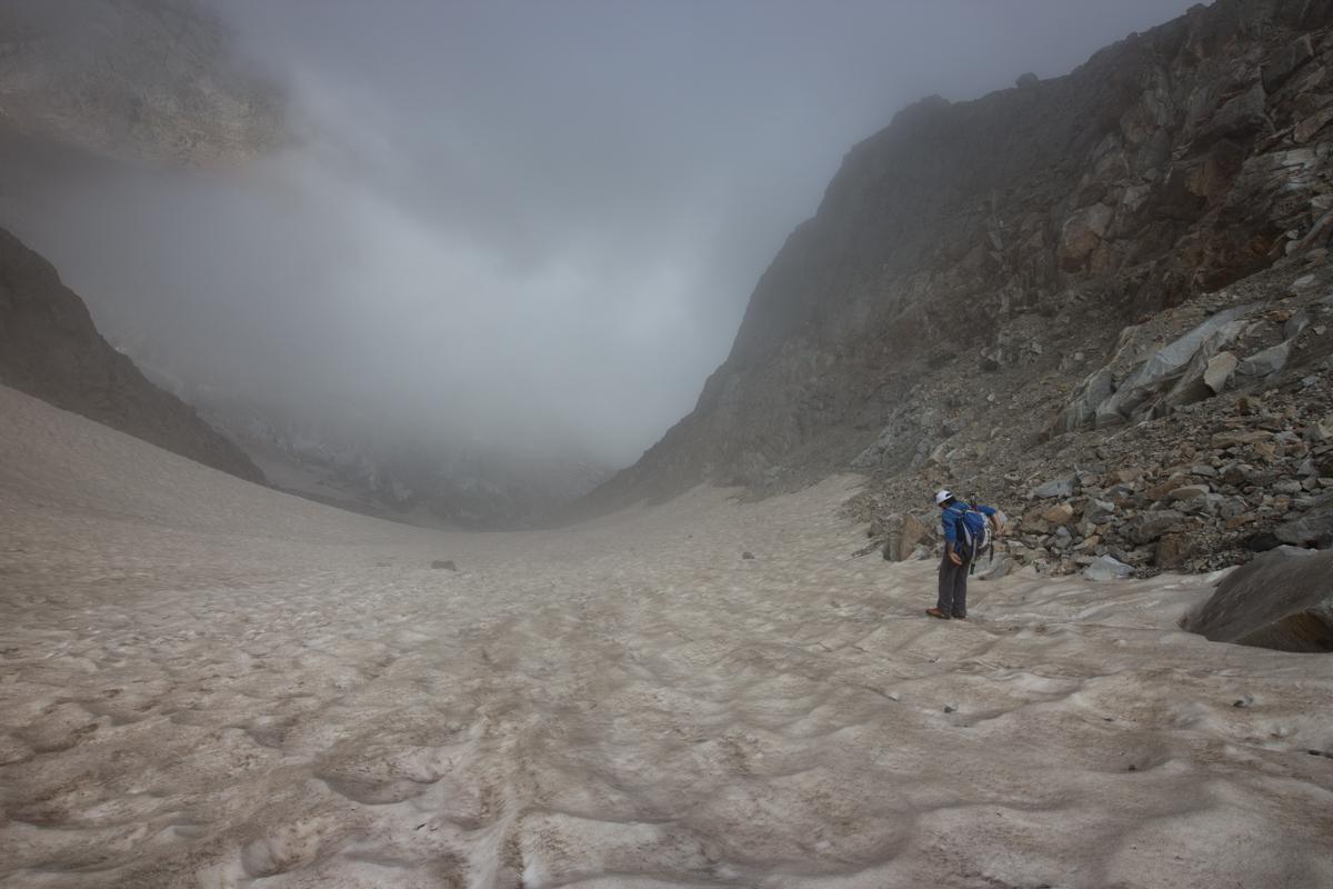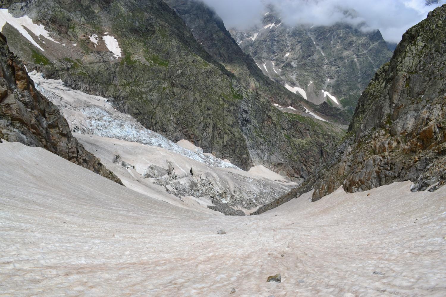 Il terreno di salita diventa, ad un certo punto, insidioso e composto da sfasciumi instabili; alla propria sinistra compare un ramo nevoso che va percorso in salita, sino a sbucare sulla Sella del Cacciatore, colletto divisorio fra il Canalone Marinelli e la fascia nevosa che si è appena percorsa.