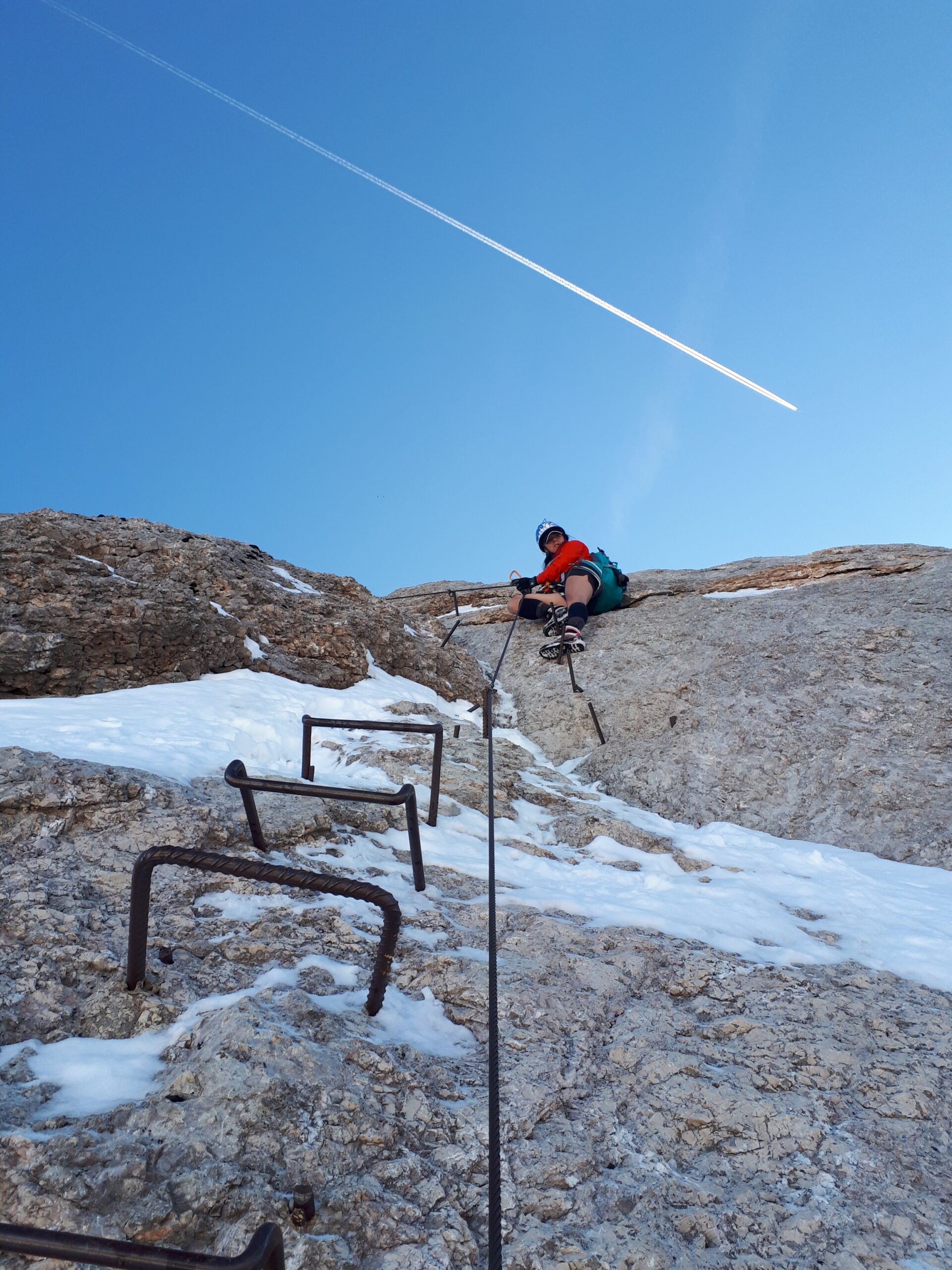 Alla forcella inizia ad esserci un pò di neve. La ferrata segue il filo di cresta, tenendosi sul lato nord, tutto innevato fino ai 2500m circa.