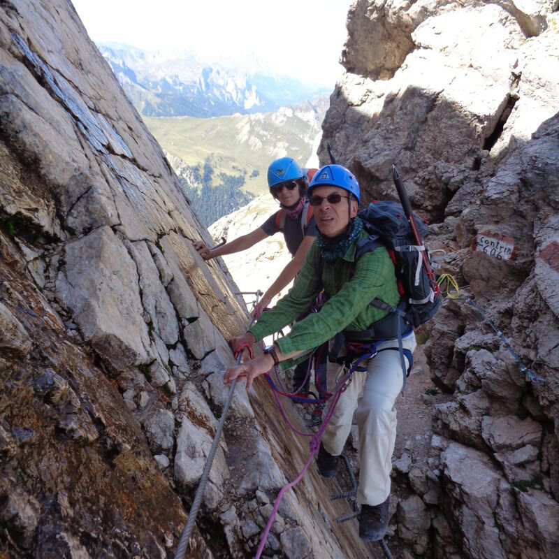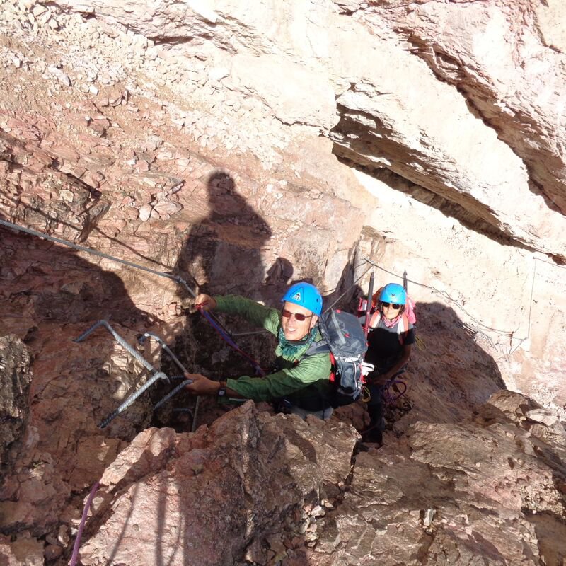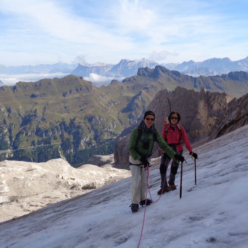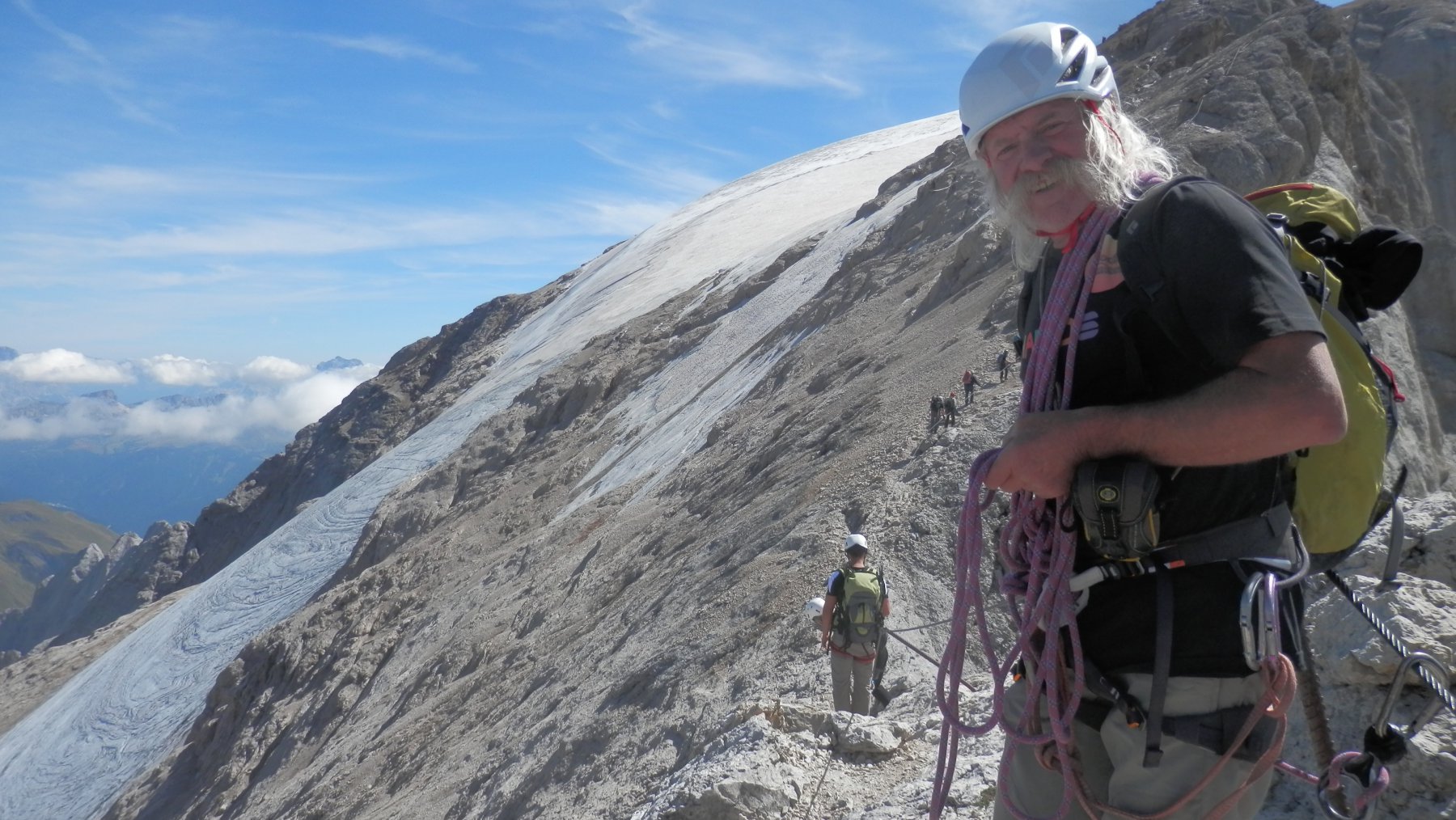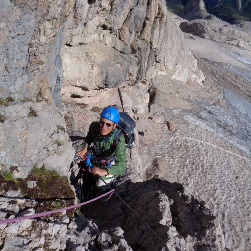 Saliti per la ferrata e discesi per la via normale su ghiacciaio. Per raggiugere il vallone da dove parte la ferrata, bisogna perdere quasi 200 metri di dislivello. Rispetto alla prima volta di 10 anni fa, allora saliti e scesi per la via normale, il ghiacciaio si è notevolmente ridotto, specialmente sotto la cima. Molto bella ed area la ferrata, per raggiungerla tratti di ghiaccio vivo ed altrettanti null’ultimo tratto di discesa. In compagnia del simpaticissimo bergfuhrer Olindo in una bellissima giornata con panorami spaziali.