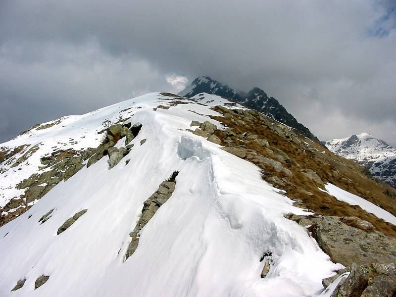 strada fino al lago Vargno, dove, volendo, si può tagliare a sinistra tra alcune case, seguendo il sentiero estivo, oppure si prosegue sulla strada. Ripresa la strada sopra le case, si continua a seguirla puntando decisamente a nord, fino alle baite Marmontana, dove la strada finisce. Puntare sempre a nord verso l’evidente colle Marmontana, tra l’omonima cima e la più imponente Pietra Bianca. Al colle salire a sinistra per facili pendii in punta.