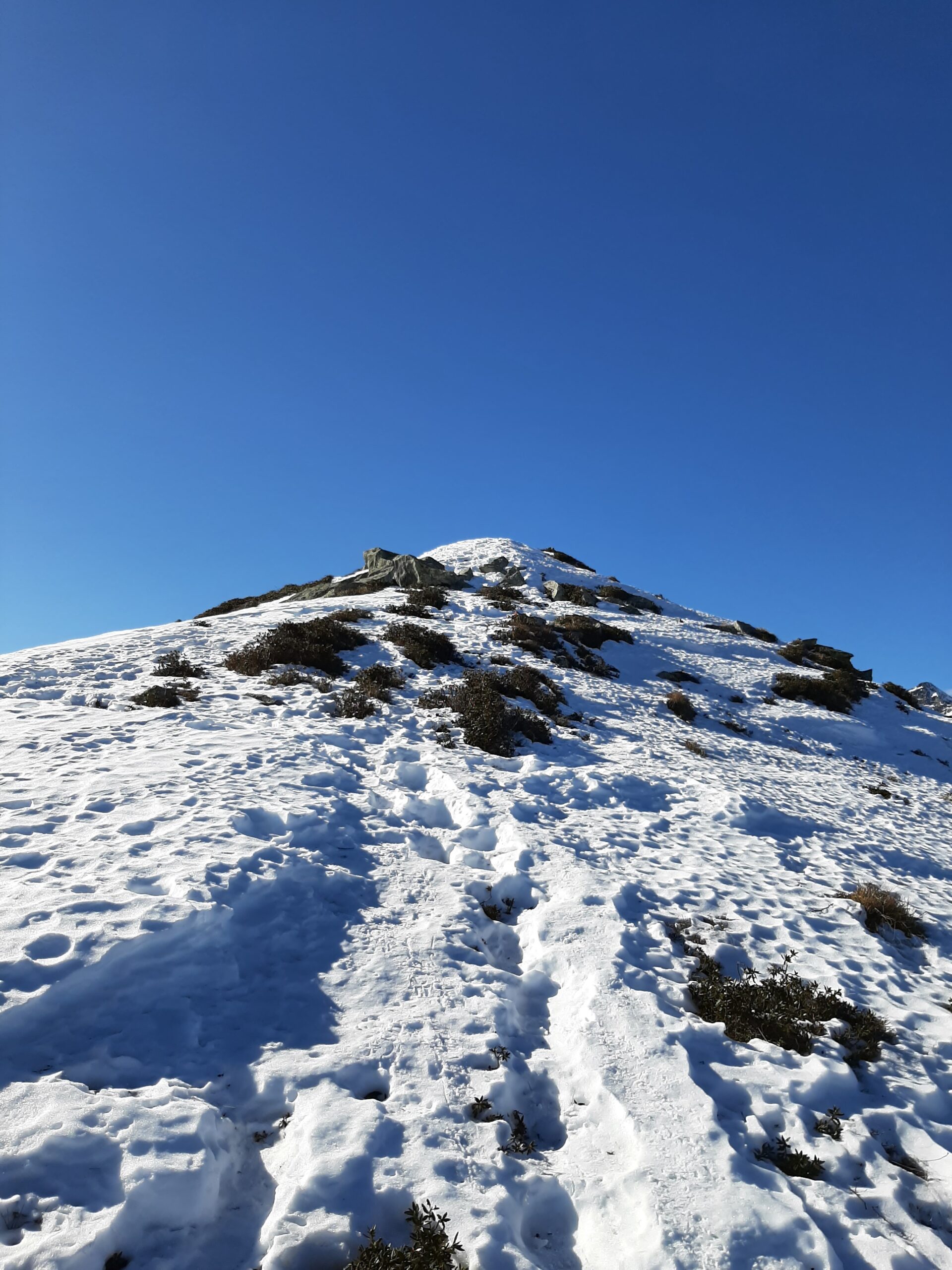 Seguito la strada con alcuni tagli fino oltre il colle dove abbiamo messo i ramponi e abbiamo seguito la traccia fino in vetta.Neve presente dal colle . La cresta continua con traccia pulita e pezzi innevati. Anche oggi niente freddo.