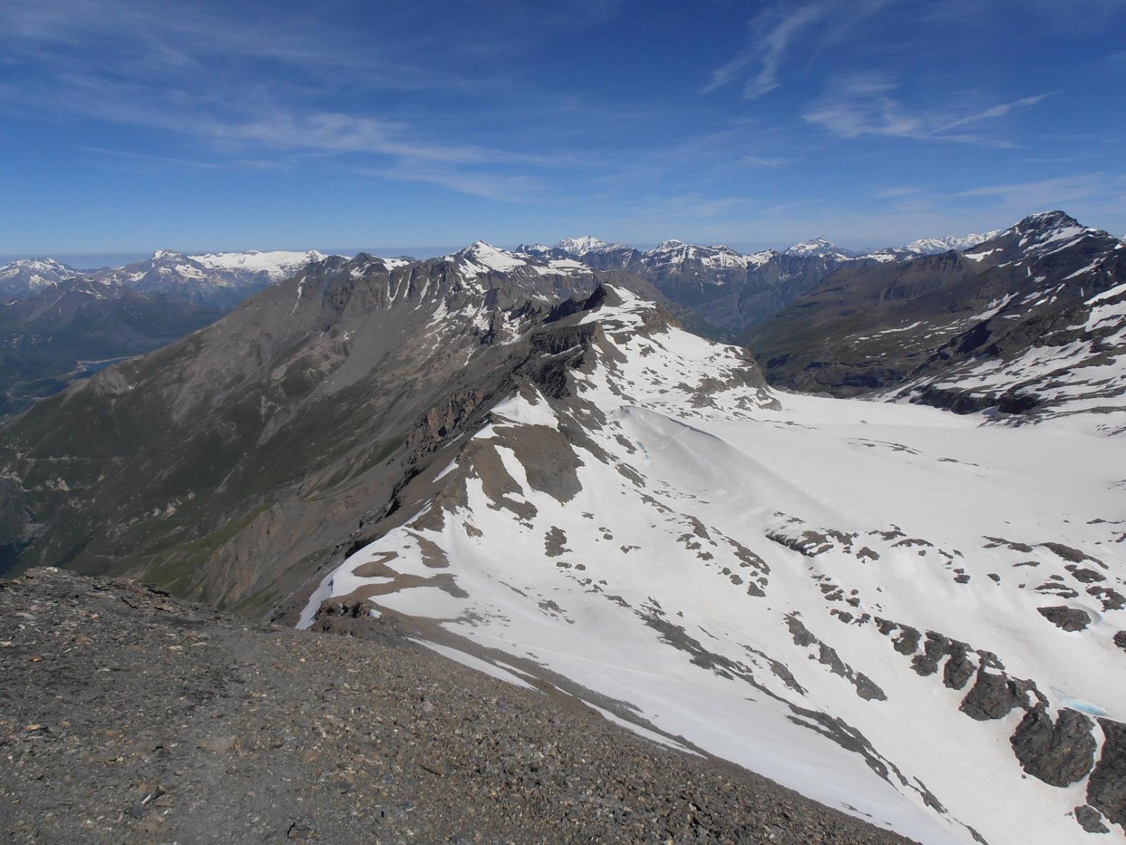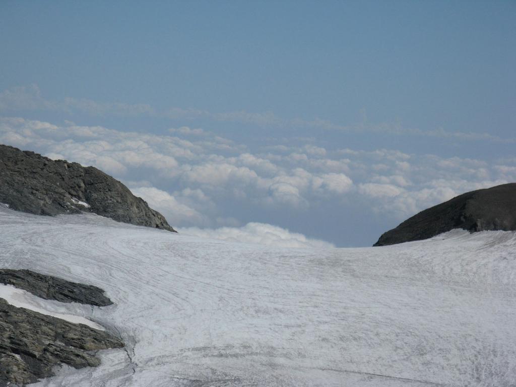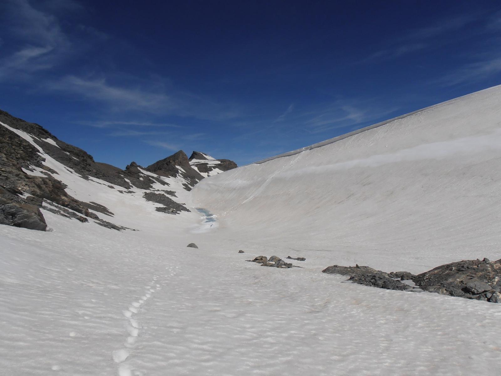 Si raggiunge così il ghiacciaio. Lo si attraversa puntando al passo di Novalesa. Evitare assolutamente di perdere quota, poichè la parte mediana del Glacier de Rochemelon, al di sotto di alcune fasce rocciose che spuntano dalla superficie glaciale, presenta numerosi crepacci nel senso di marcia.