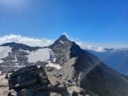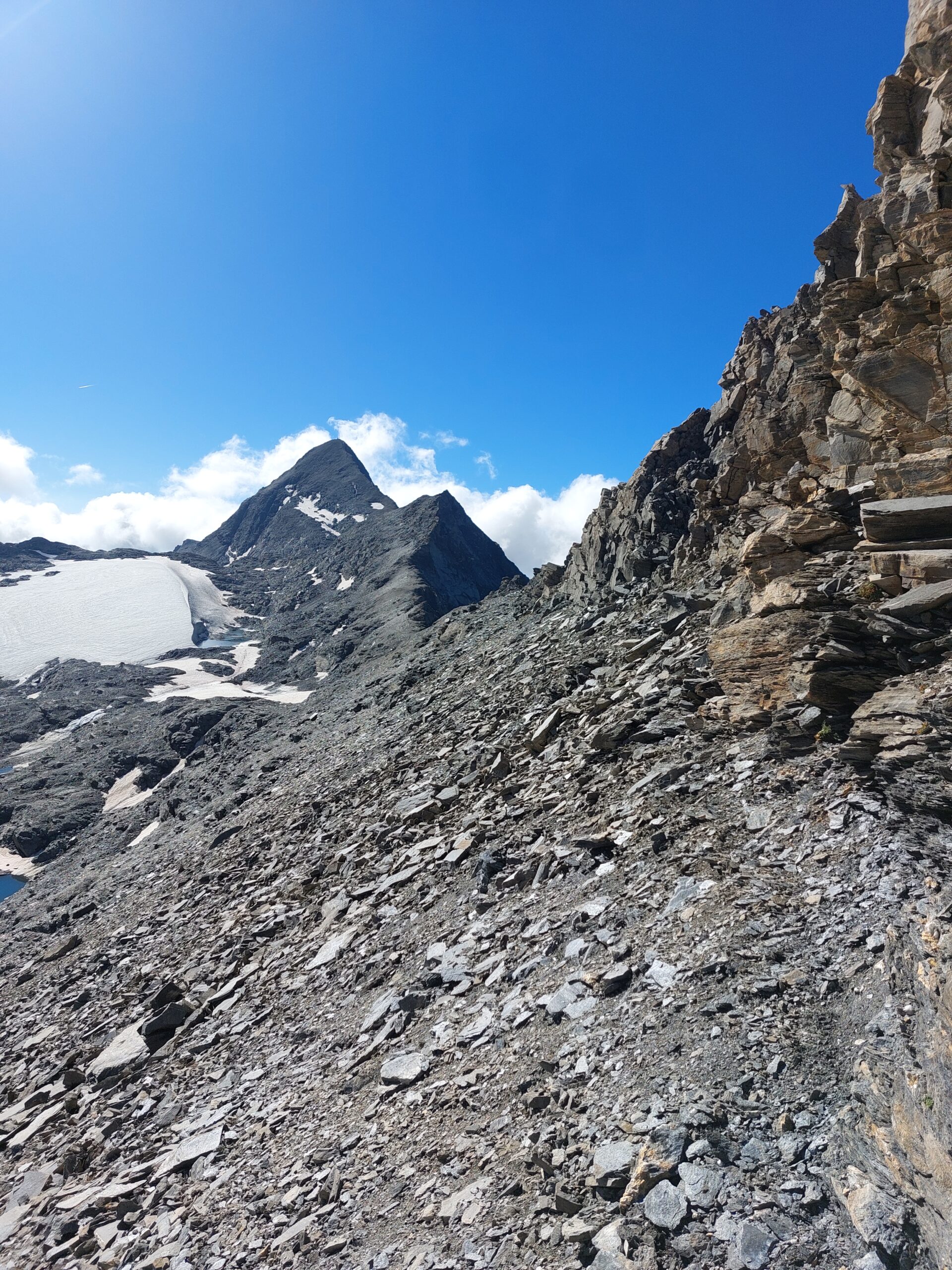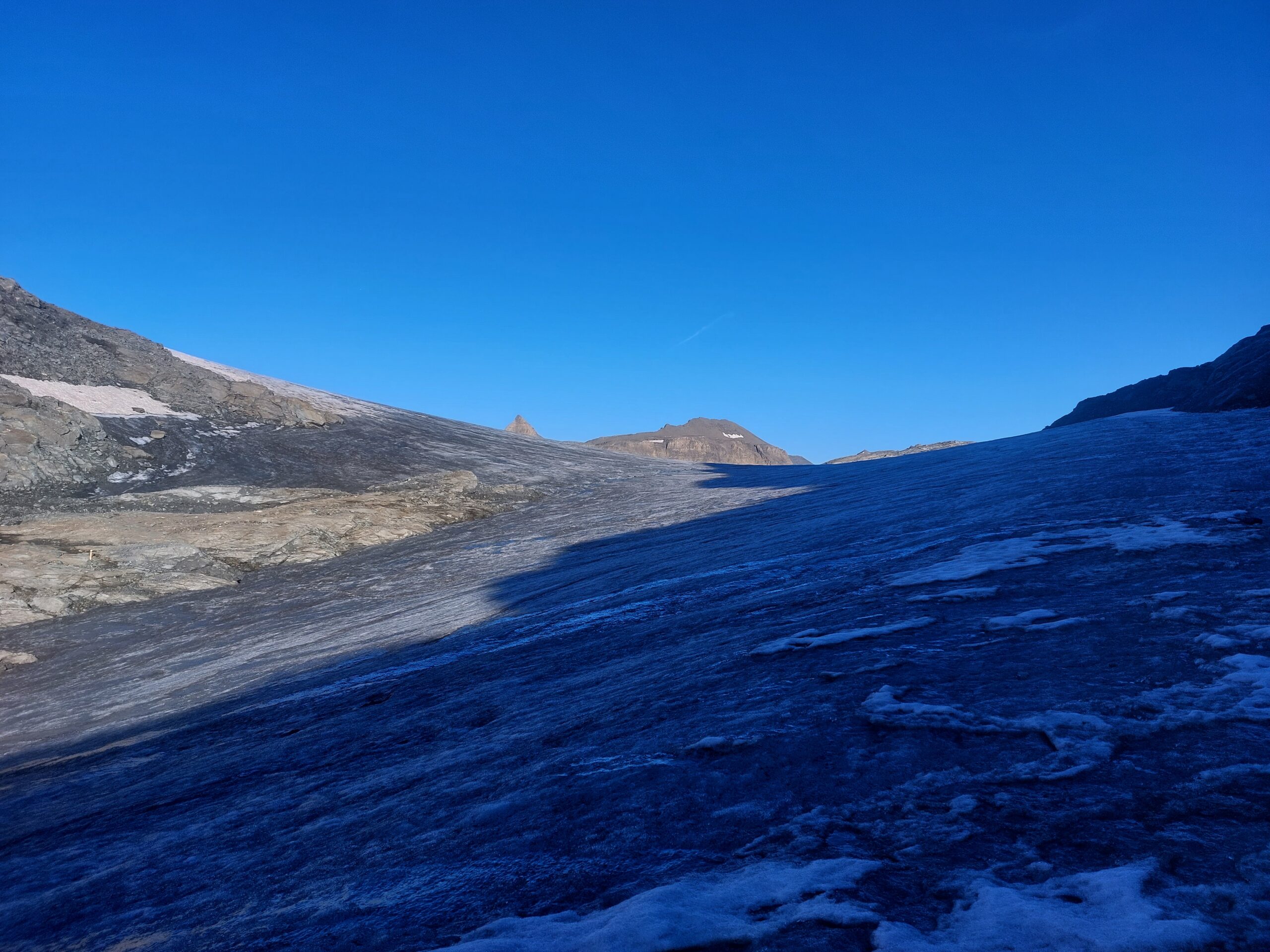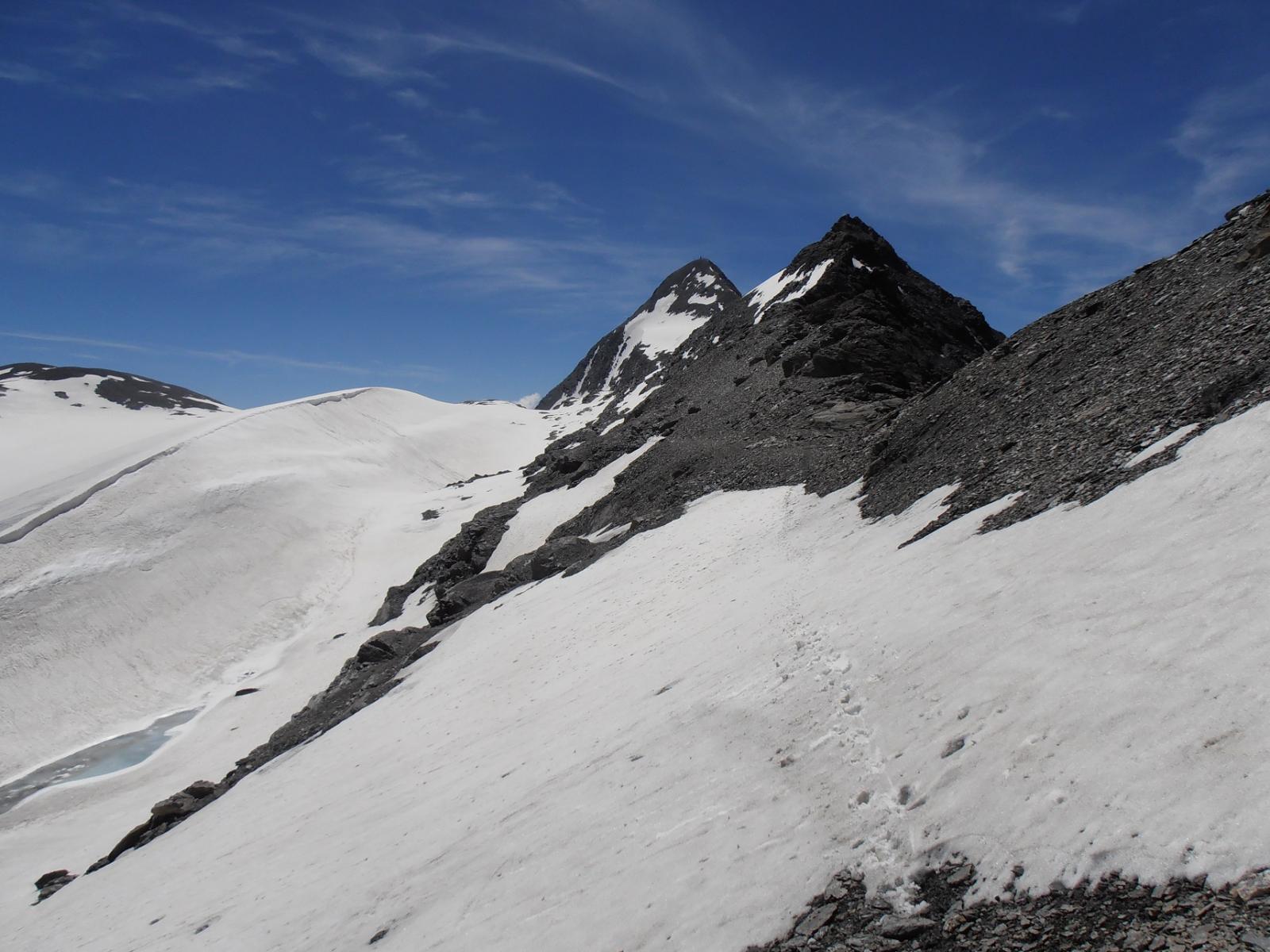 Si raggiunge così il ghiacciaio. Lo si attraversa puntando al passo di Novalesa. Evitare assolutamente di perdere quota, poichè la parte mediana del Glacier de Rochemelon, al di sotto di alcune fasce rocciose che spuntano dalla superficie glaciale, presenta numerosi crepacci nel senso di marcia.