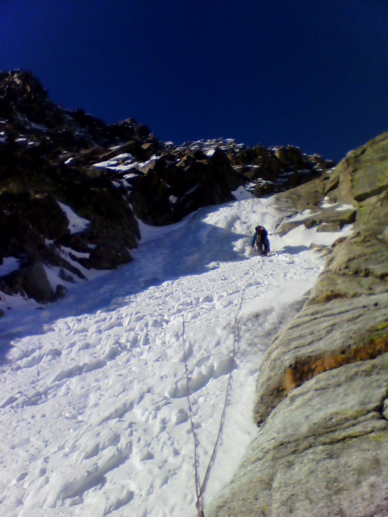 Discesa: dalla Sella scendere un pendio-canale per circa 100 m, dove vi è una biforcazione salire per circa 30 m (dx faccia a monte) e giungere su una spalla. Attraversare lungamente tutti i pendii a dx faccia a monte fino alla Sella di Groscavallo (tra la Dent d’Ecot e la Punta di Groscavallo). Scendere dalla sella (alcune doppie in posto – nell’ultimo tratto del canale girare a sx faccia a monte) fino a mettere piede sul ghiacciaio del Moulinet. Da qui arrivare a dove sorgeva il vecchio bivacco Rivero (resti), scendere dunque al Ferreri (difficoltà di reperire il tracciato se non si conosce e sono calate le tenebre). Quindi tornare al Daviso se si è lasciato del materiale (attenzione al sentiero, diversi tratti ghiacciati, molti incombenti sulle cascate sottostanti) oppure scendere direttamente dal Ferreri (sentiero disagevole e ghiacciato).