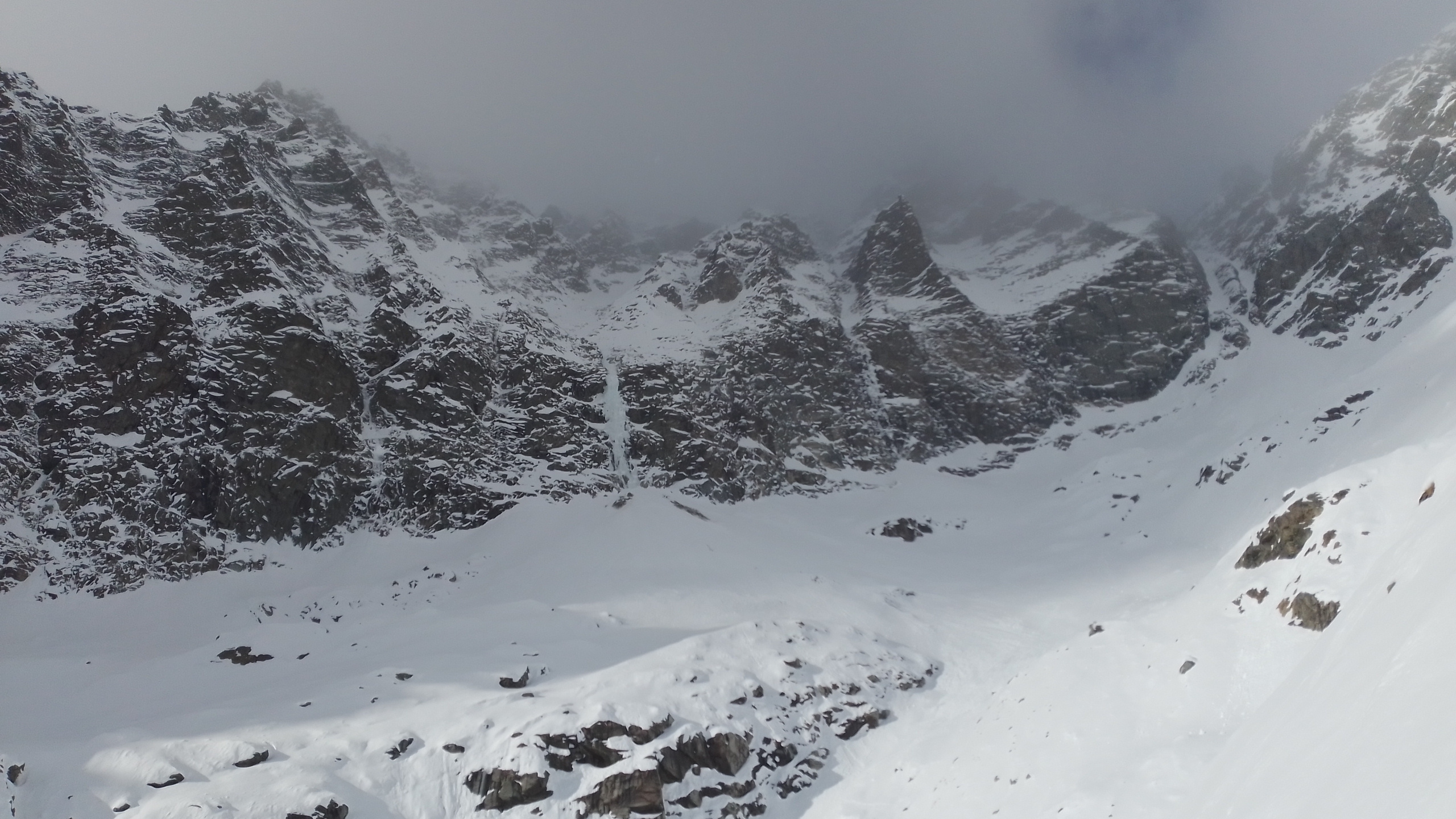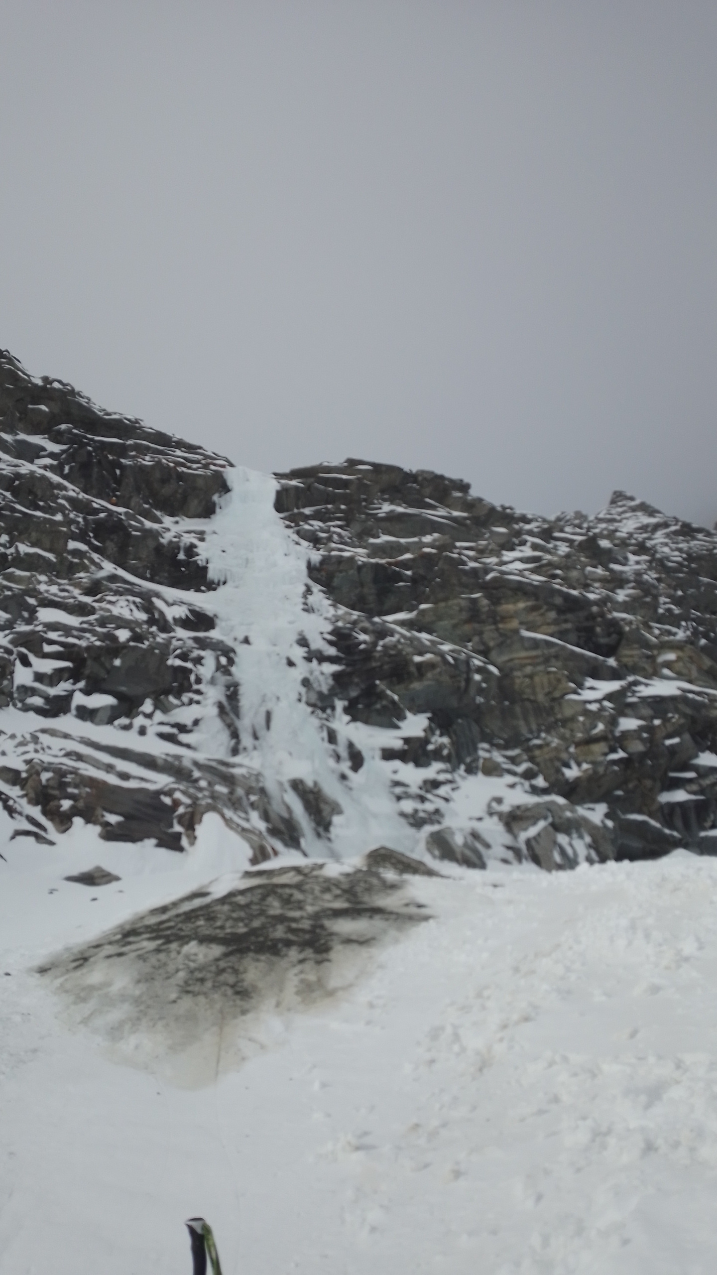 La cascata è quella con il catino innevato superiore, al centro della parete. A dx vi è la linea, raramente formata, di “O Sole Mio” sul couloir est del Dome du Moulinet.