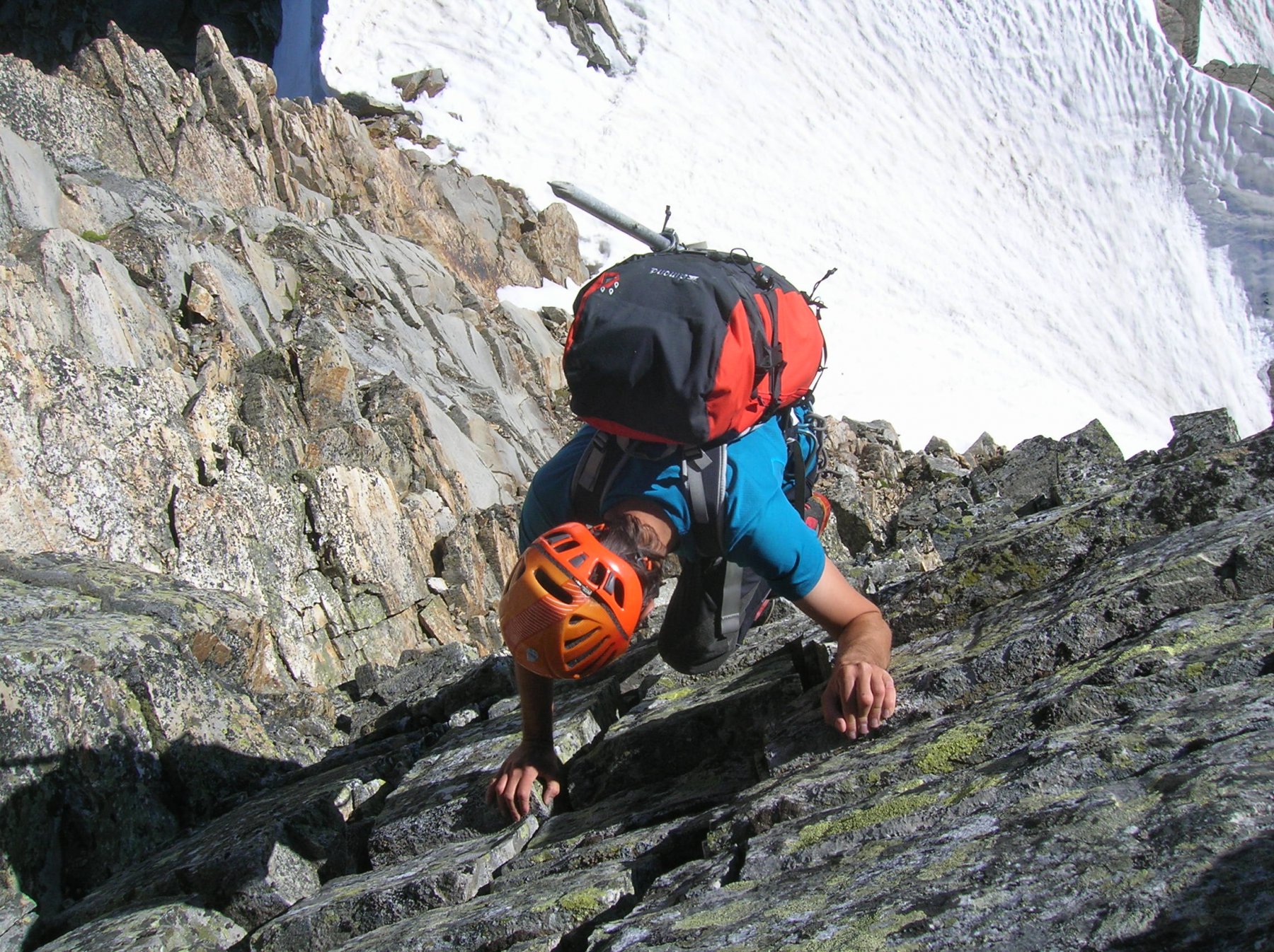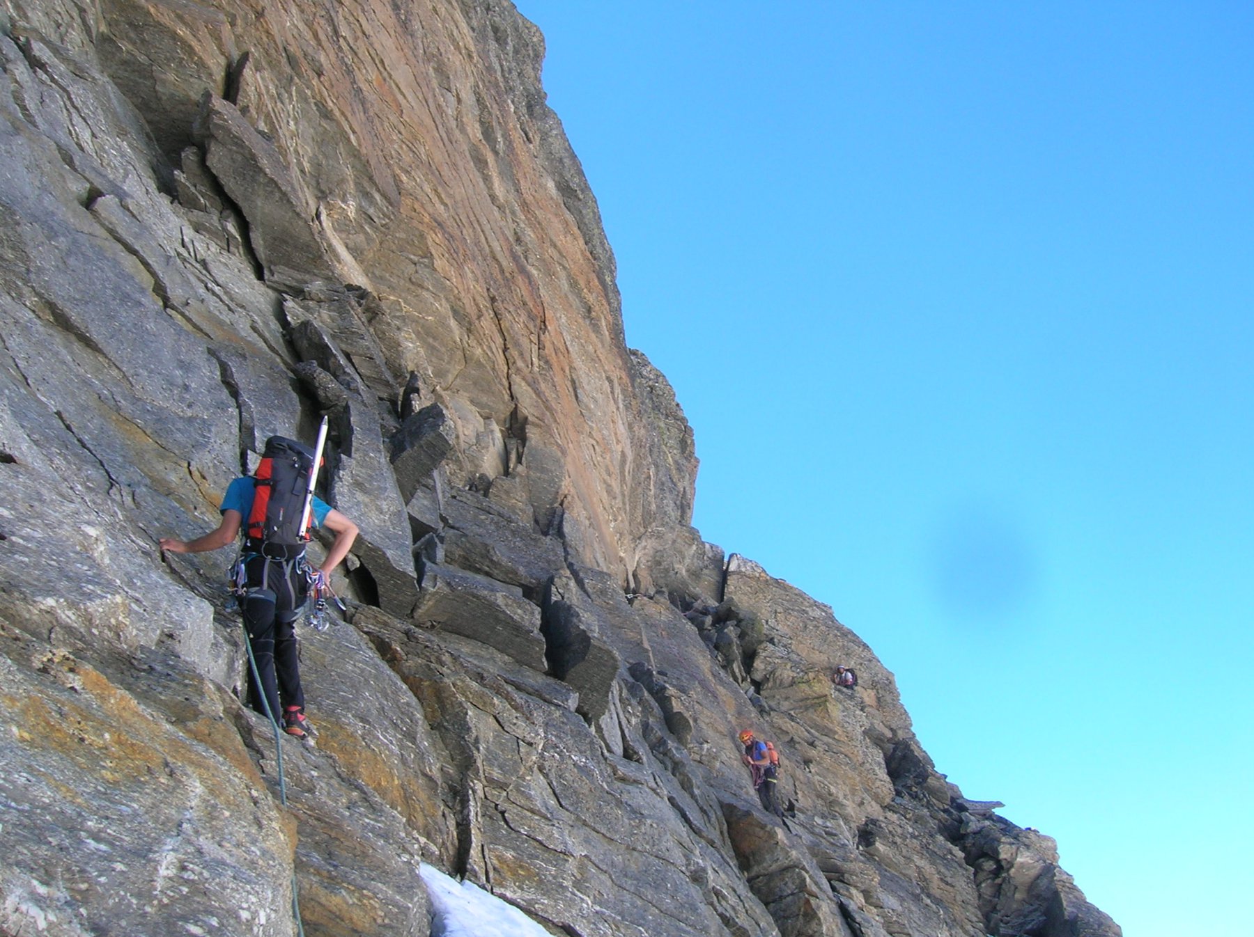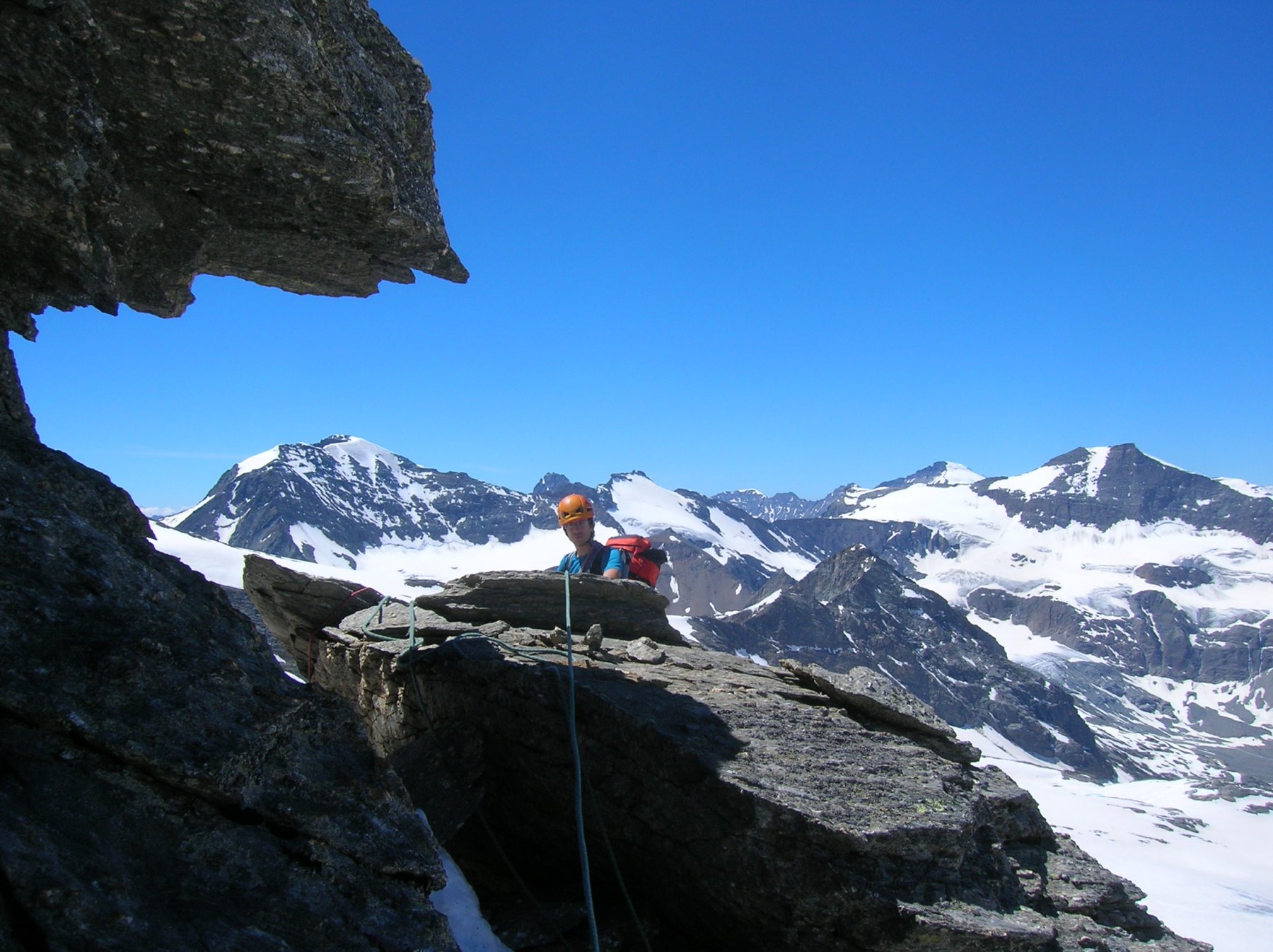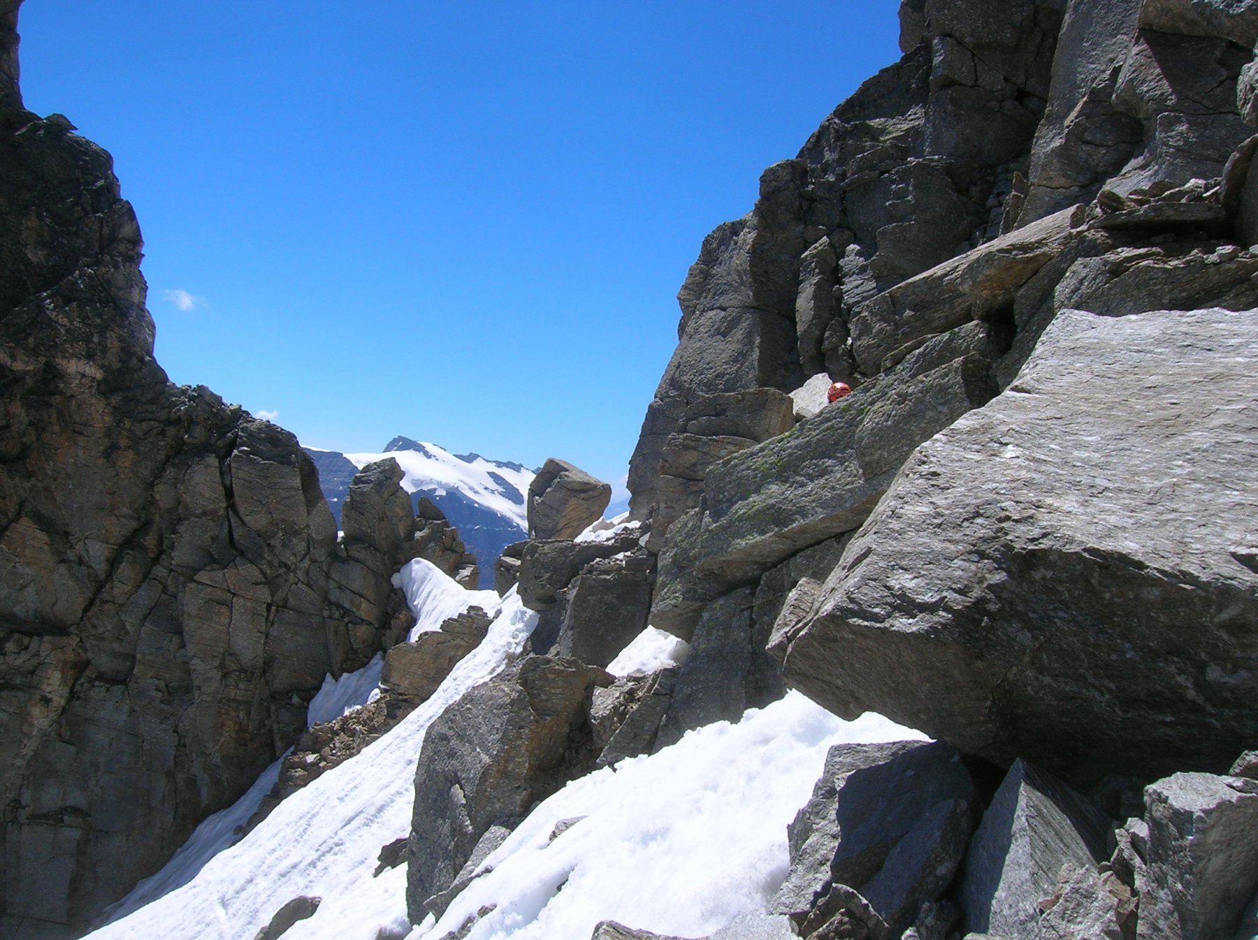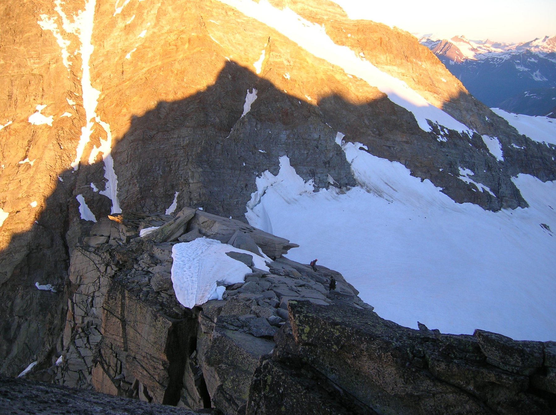 Ridiscendere la placca e abbassarsi sulla cresta fino a una spaccatura caratterizzata da una ripida lama di roccia ottima.