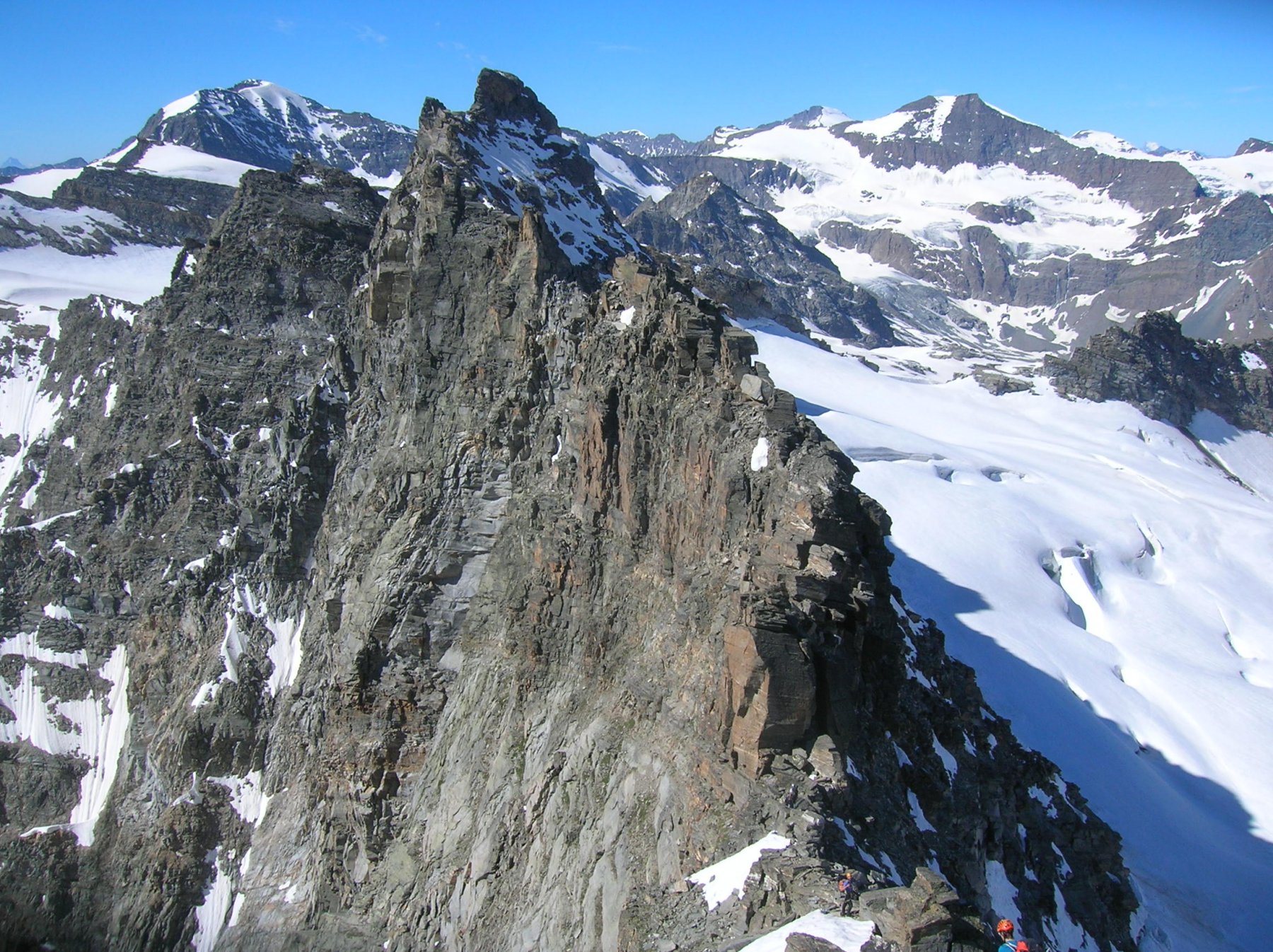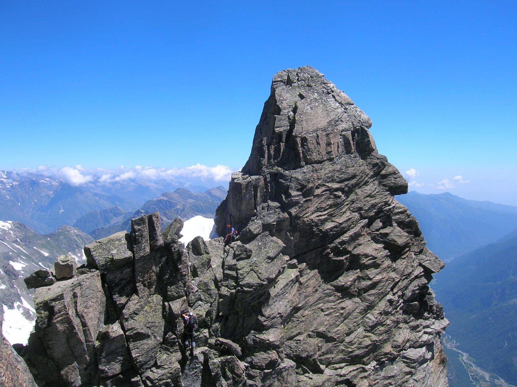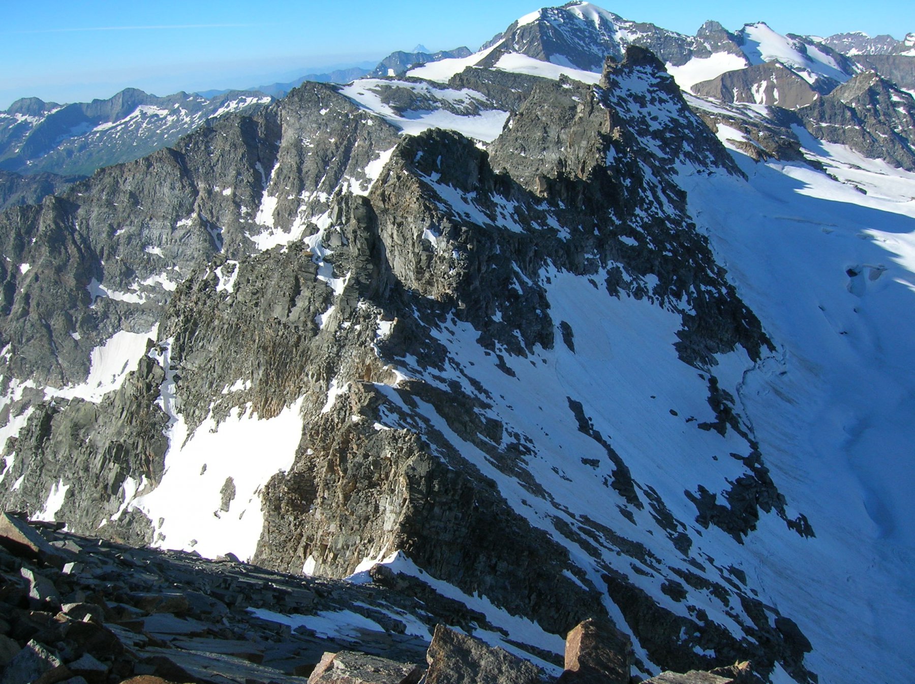 Salire quindi alla Punta di Groscavallo (3423m) da dove inizia la classica traversata della “Cresta di Mezzenile” in direzione N-S. Dalla Groscavallo scendere facilmente e poi iniziare la traversata per cresta toccando varie quote (iniziale 3352m , finale 3407) e con vari saliscendi, vincendo passaggi più o meno difficili con difficoltà di III-III+ (caratteristico il verticale camino subito dopo la Groscavallo).
