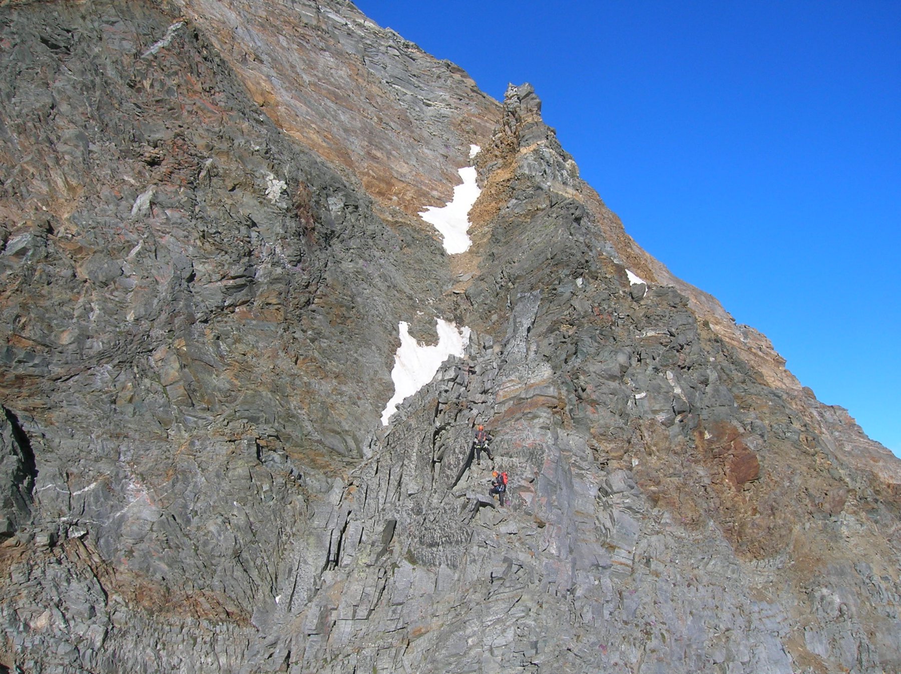 Alla fine della cresta traversare su terreno ripido (versante francese) verso il versante Sud della Punta di Mezzenile (3429m) e raggiungerne la vetta per una bella placca appoggiata incisa da una fessura gradinata.