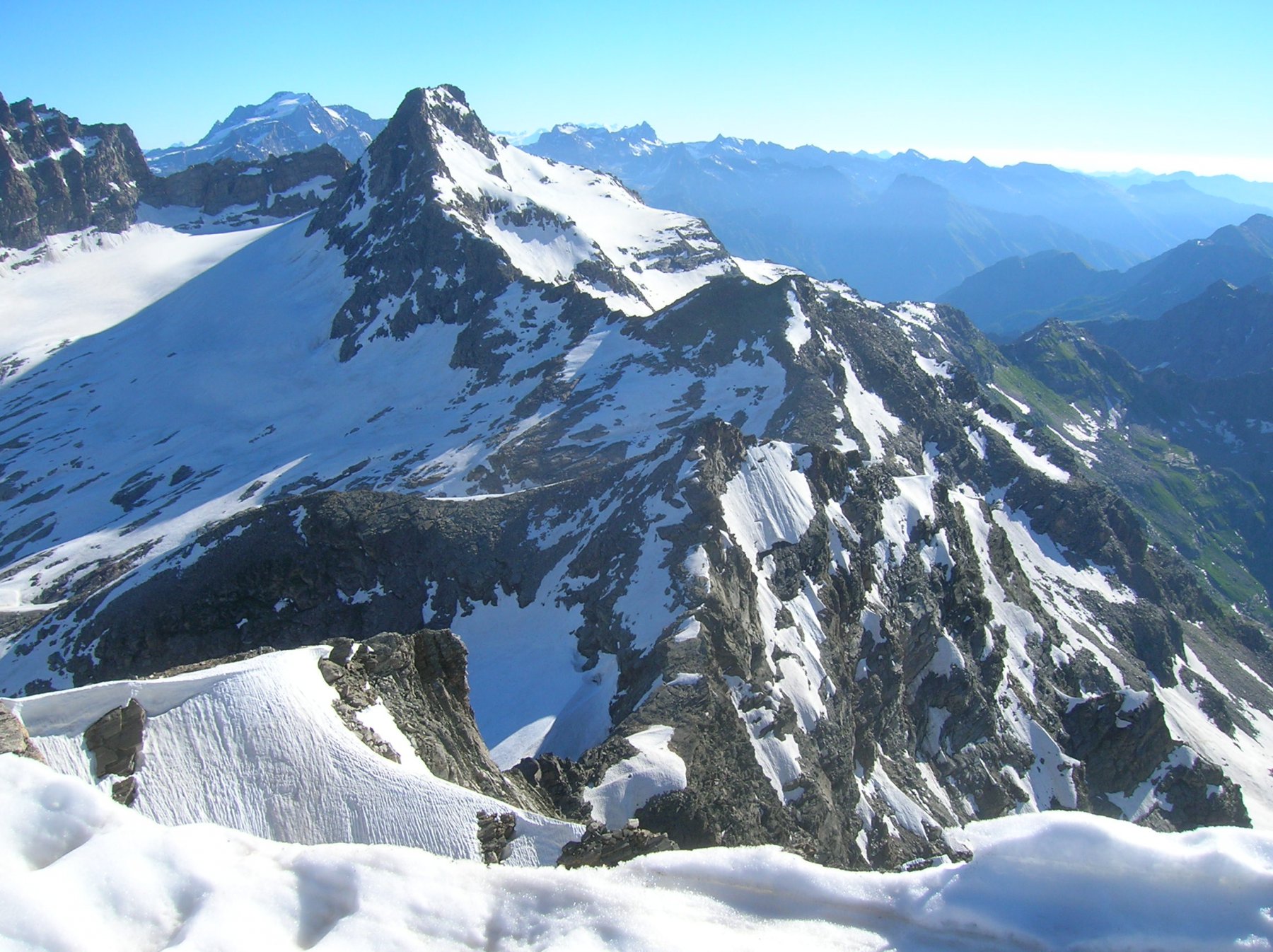 Più o meno alla sua base scavalcare a sx un colatoio e portarsi nel centro dell’imponente parete, formata da una successione di risalti, cenge e blocchi. Superarla senza grosse difficoltà toccando il crestone finale che in breve conduce in vetta al Dome Blanc du Mulinet (3387m).