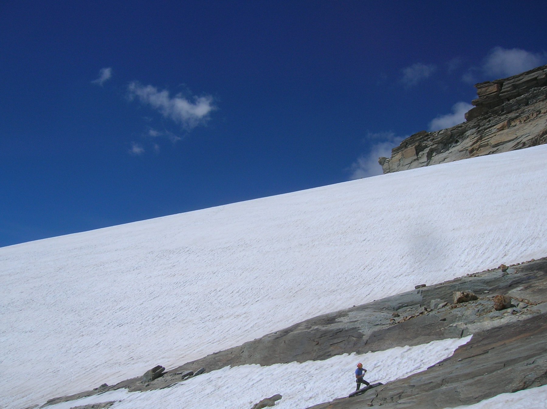 La prima è salire al Colle di Santo Stefano (3228m) e, scendendo sullo sperone centrale di roccia, raggiungere il ghiacciaio sud del Mulinet (quasi sempre utile una corda doppia per superare la terminale).