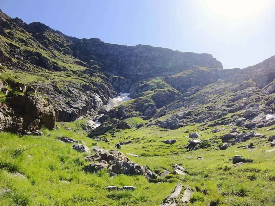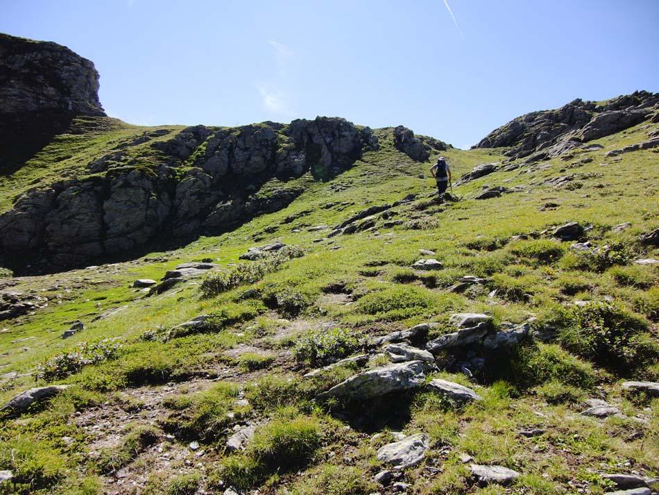 Seguire la mulattiera, passare per un altro alpeggio, attraversare il rio e risalire puntando al traliccio dell’alta tensione dove si ritrova il sentiero GTA che conduce in breve a Piamprato (ore 2.30 circa dalla cima).