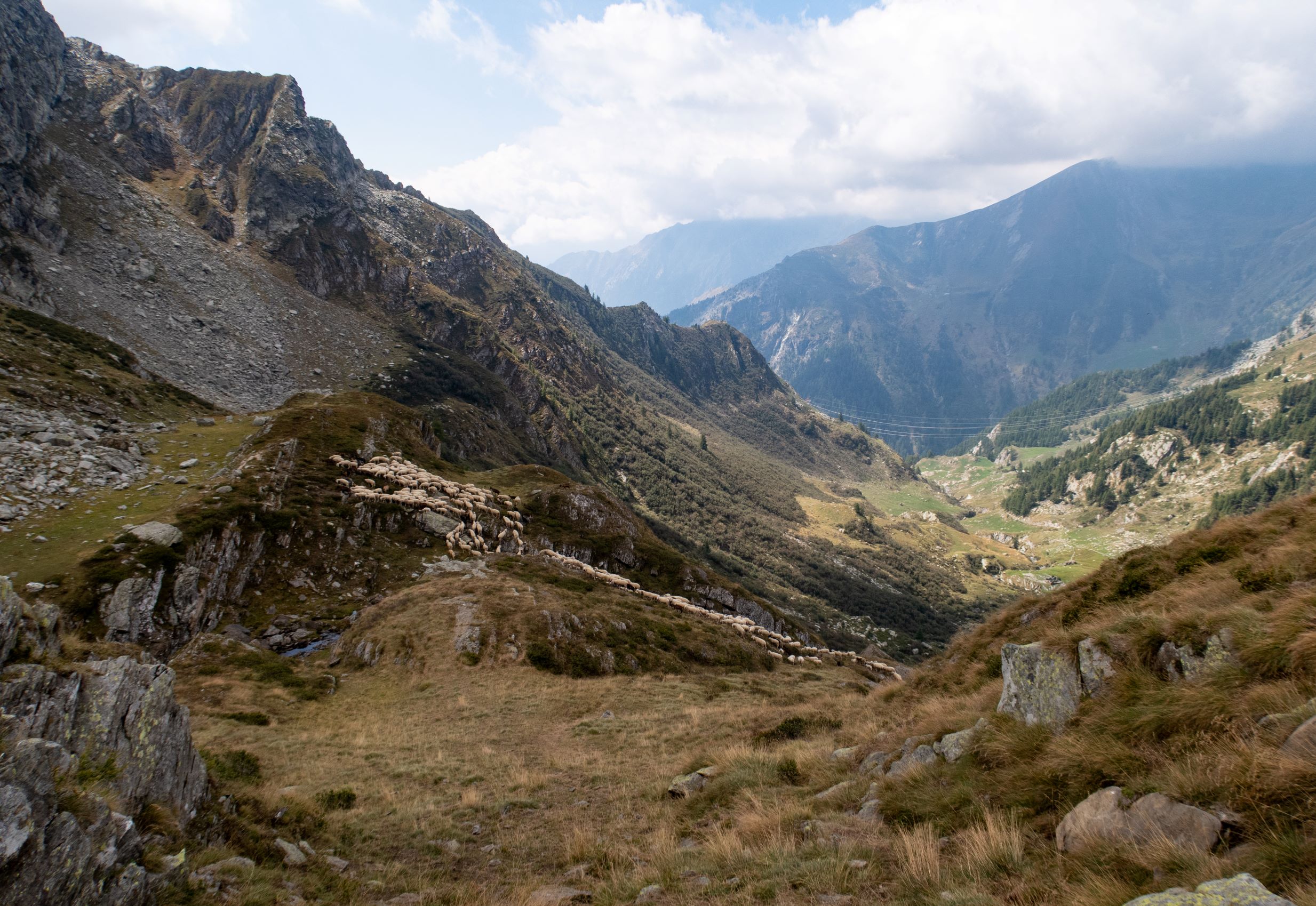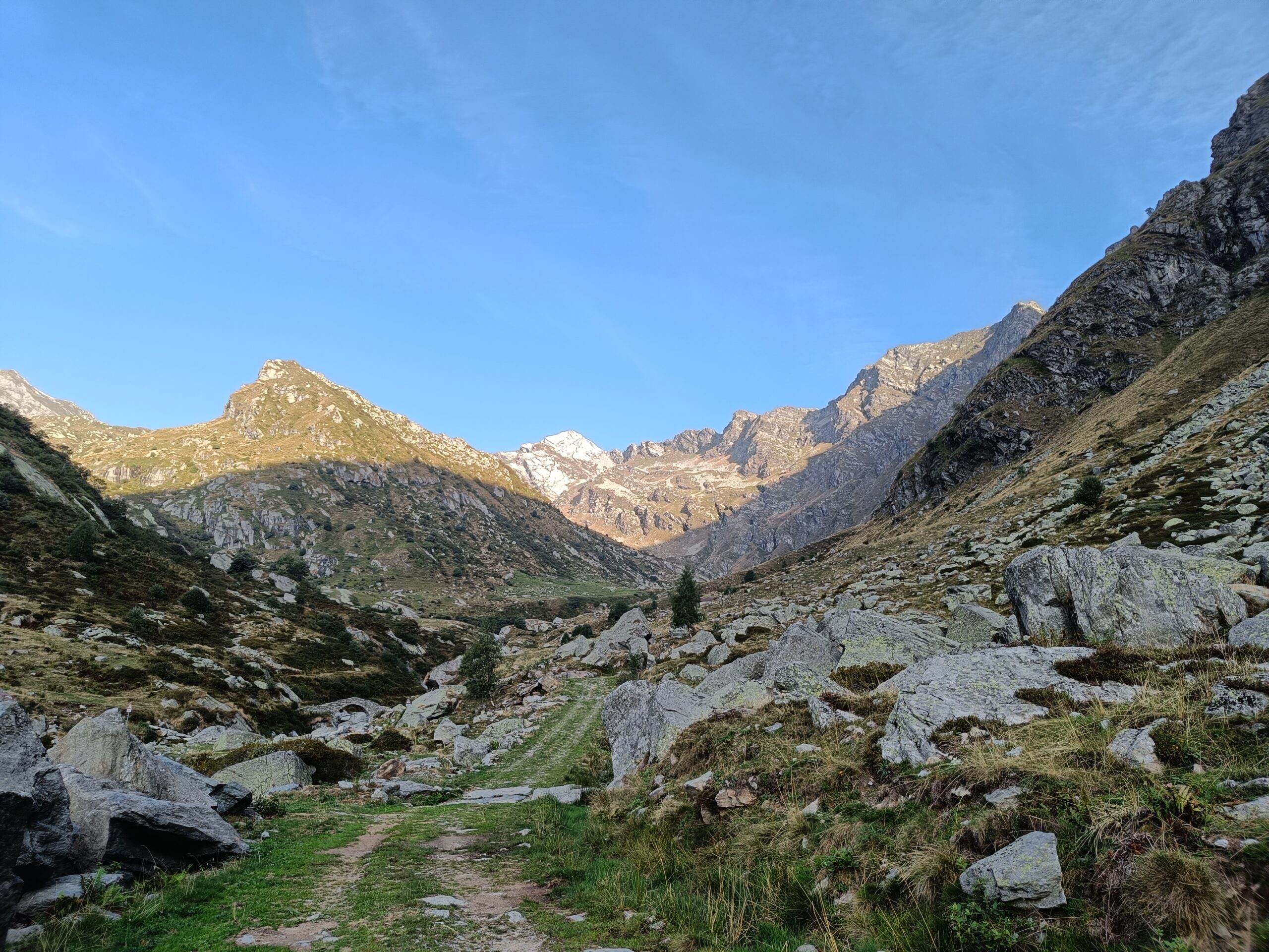 Si prosegue lungo la mulattiera molto piacevole alternando strappi a tratti più dolci sino a collegarsi per un tratto alla strada sterrata, poco dopo l’Alpe Pasquere 1406 m. Sa si segue per un breve tratto fino a ritrovare il sentiero che continua dopo l’Alpe la Nuova nei prati a destra, raggiungendo un gruppo di alpeggi più recenti Alpe Prà di Vico 1612 m (c’è un caratteristico baitello costruito sotto a enormi massi), per poi scendere al torrente che va attraversato (guado su pietre). Si riprende a salire ora più decisamente sul lato orografico sinistro, su un pendio di arbusti e pietrame toccando in successione alcuni ruderi (Lasetta Inferiore e Lasetta Superiore), per poi proseguire con semicerchio verso destra proprio sotto le pendici del Monte Marzo, raggiungendo l’Alpe Ghium 1943 m (dopo aver lasciato a destra l’Alpe Gheia.