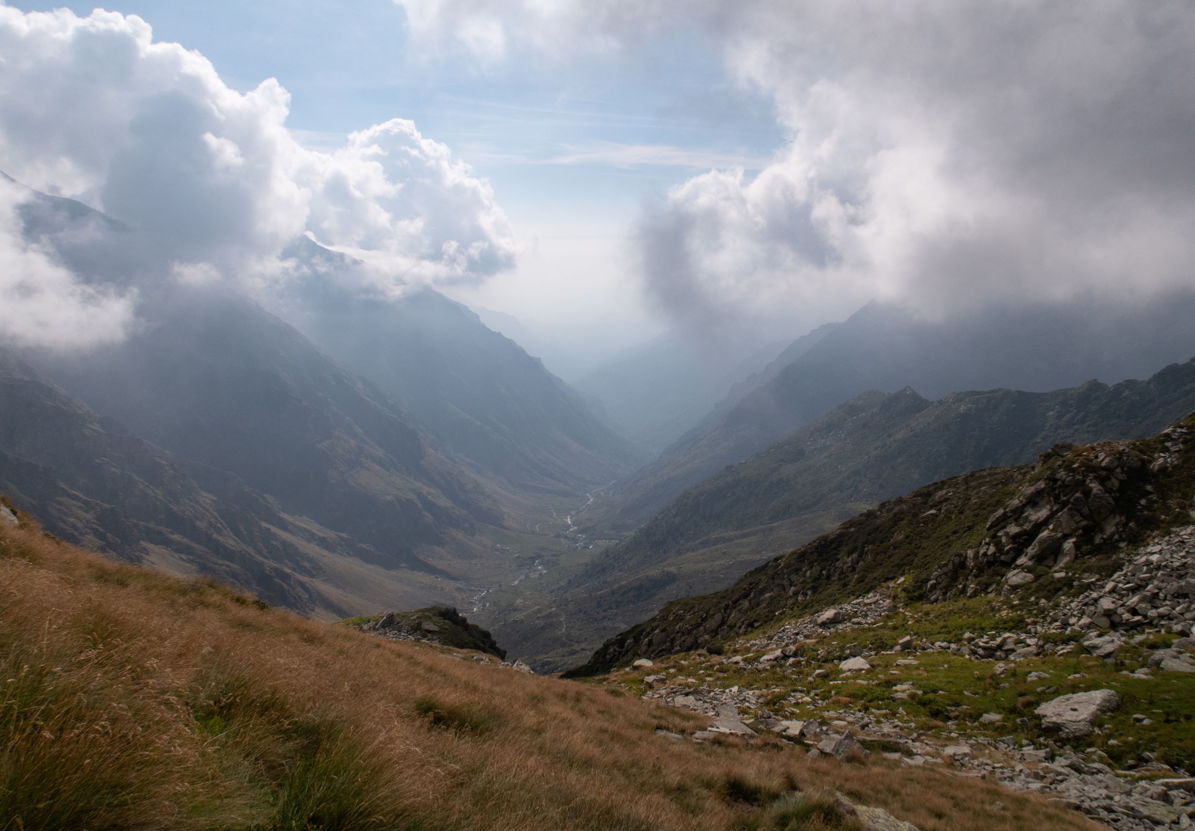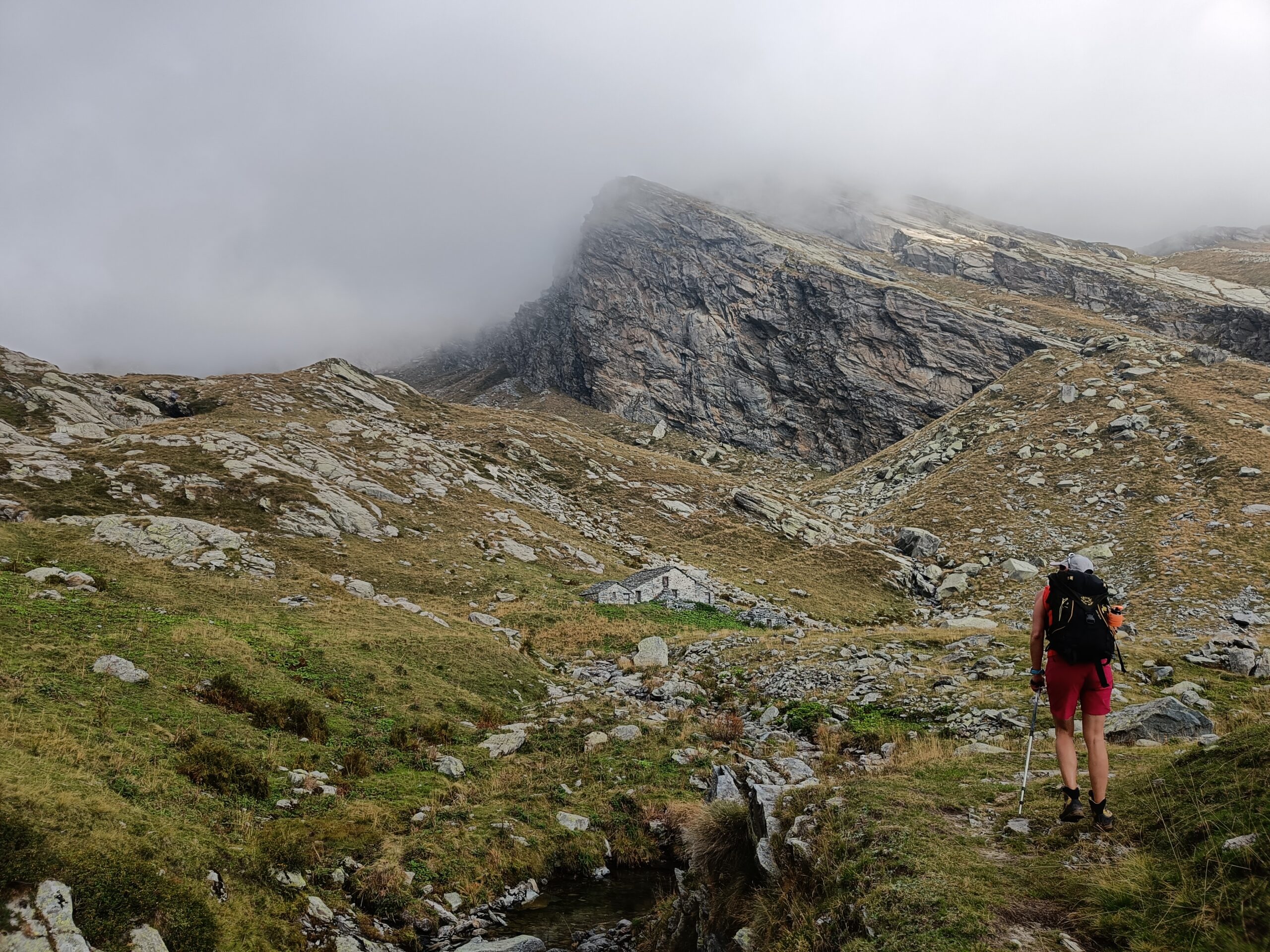 Si continua sempre sul gta sino all’’Alpe Oche Inferiore 2110 m, dove occorre prestare attenzione alla traccia (segnavia bianco/rossi) che si stacca proseguendo in piano a destra sul bordo del pianoro erboso sotto l’alpeggio stesso. Attenzione perché una scritta con freccia su un masso all’alpeggio indicante “Marzo” è un po’ ingannevole e sembra voler indicare di proseguire sul gta per il Colle delle Oche. Attraversato il ripiano erboso si prosegue in diagonale ascendente verso sinistra (tacche ben visibili) su una traccia non proprio marcata, iniziando a risalire un ripidissimo costone erboso a destra di un canale pietroso con ruscello.
