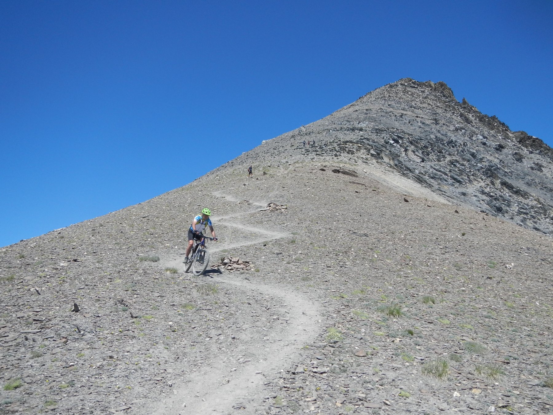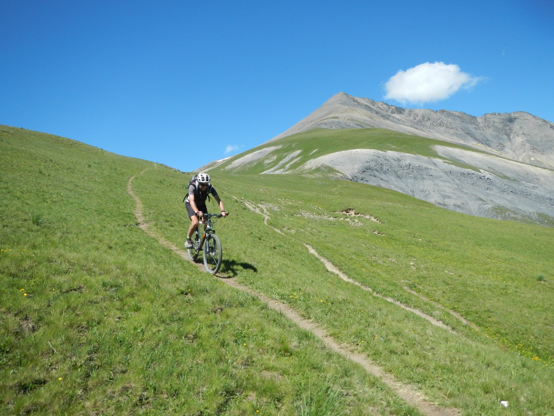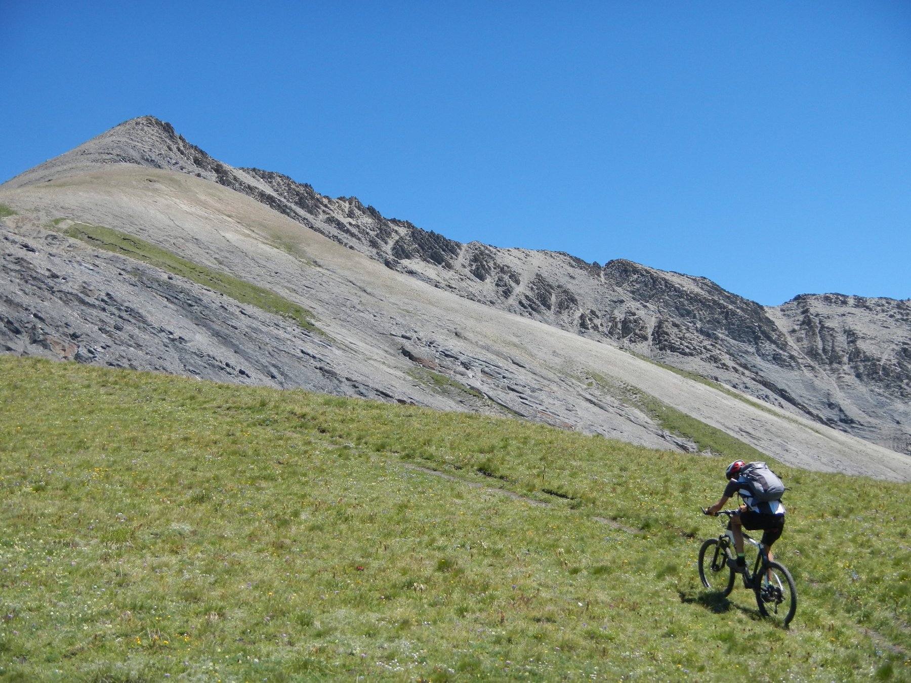 Discesa impegnativa e non sempre ciclabile fino all’ampia dorsale da cui inizia una lunga e bella discesa verso il Plateau d’Emparis su un sentiero per lo più stretto ma evidente che, indicativamente, segue le Rif Tort.