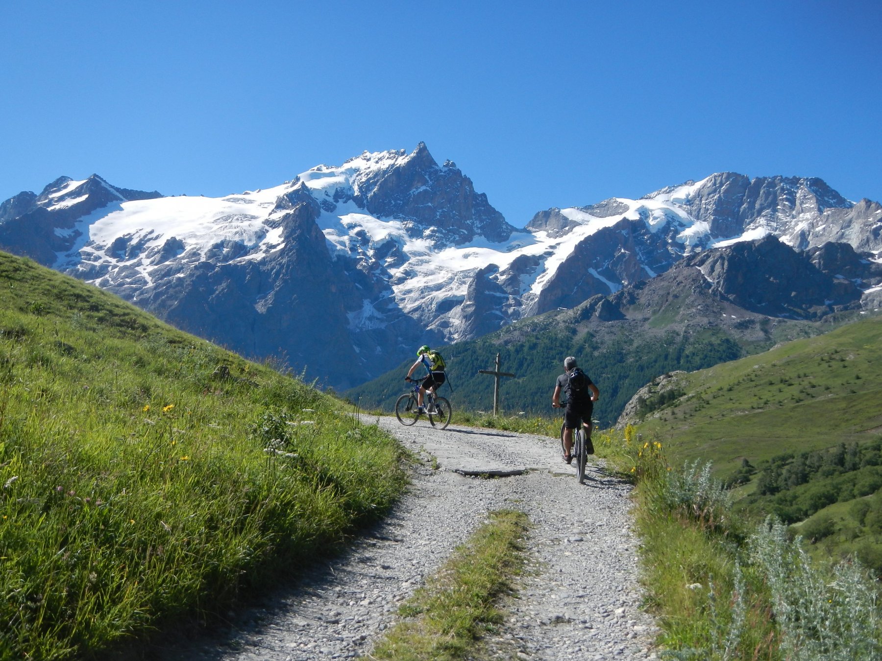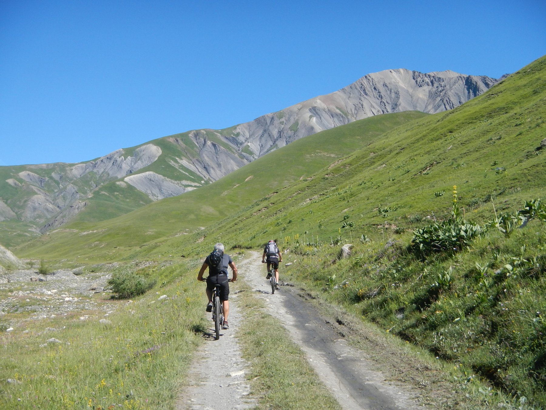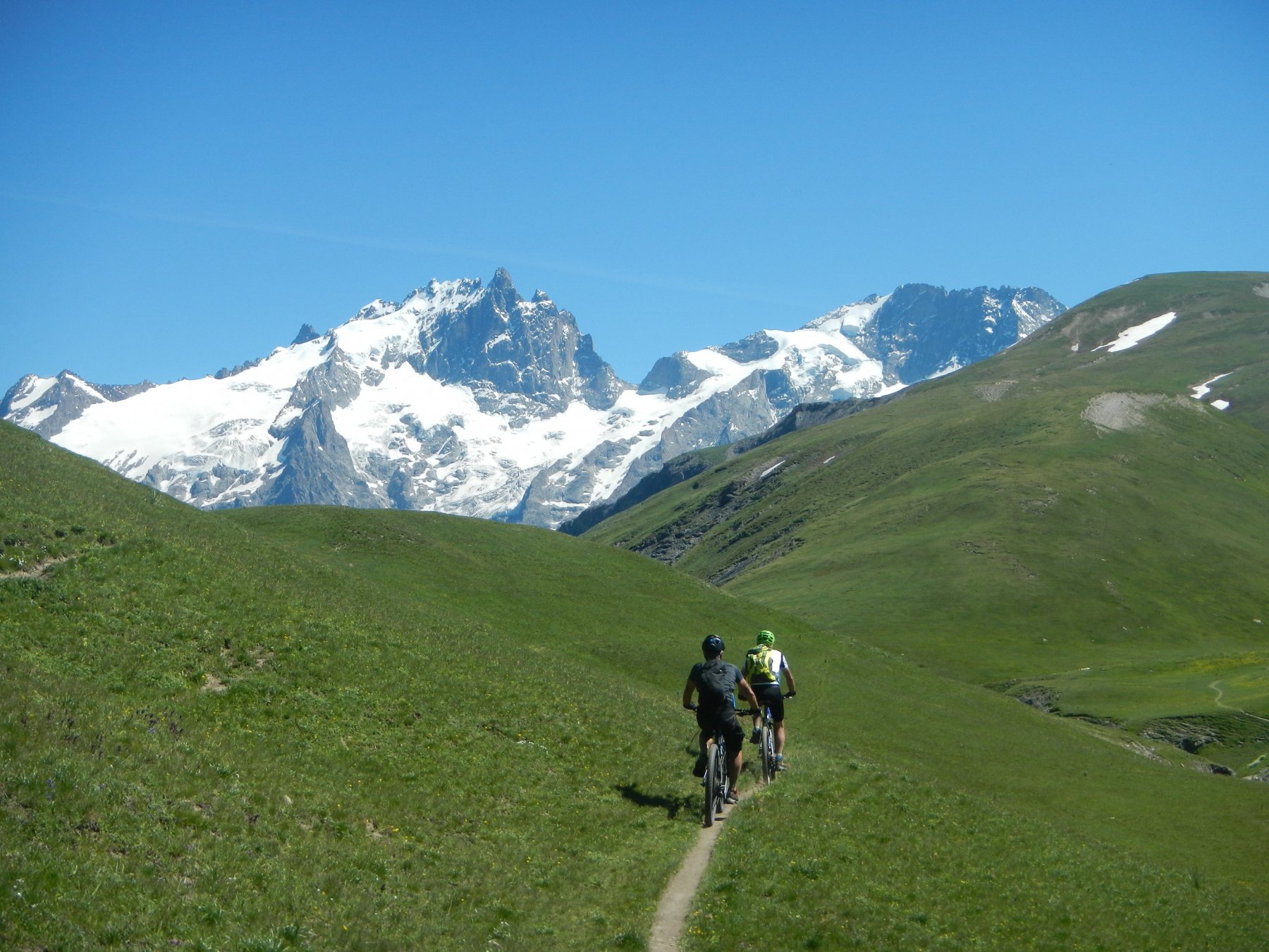 Discesa impegnativa e non sempre ciclabile fino all’ampia dorsale da cui inizia una lunga e bella discesa verso il Plateau d’Emparis su un sentiero per lo più stretto ma evidente che, indicativamente, segue le Rif Tort.