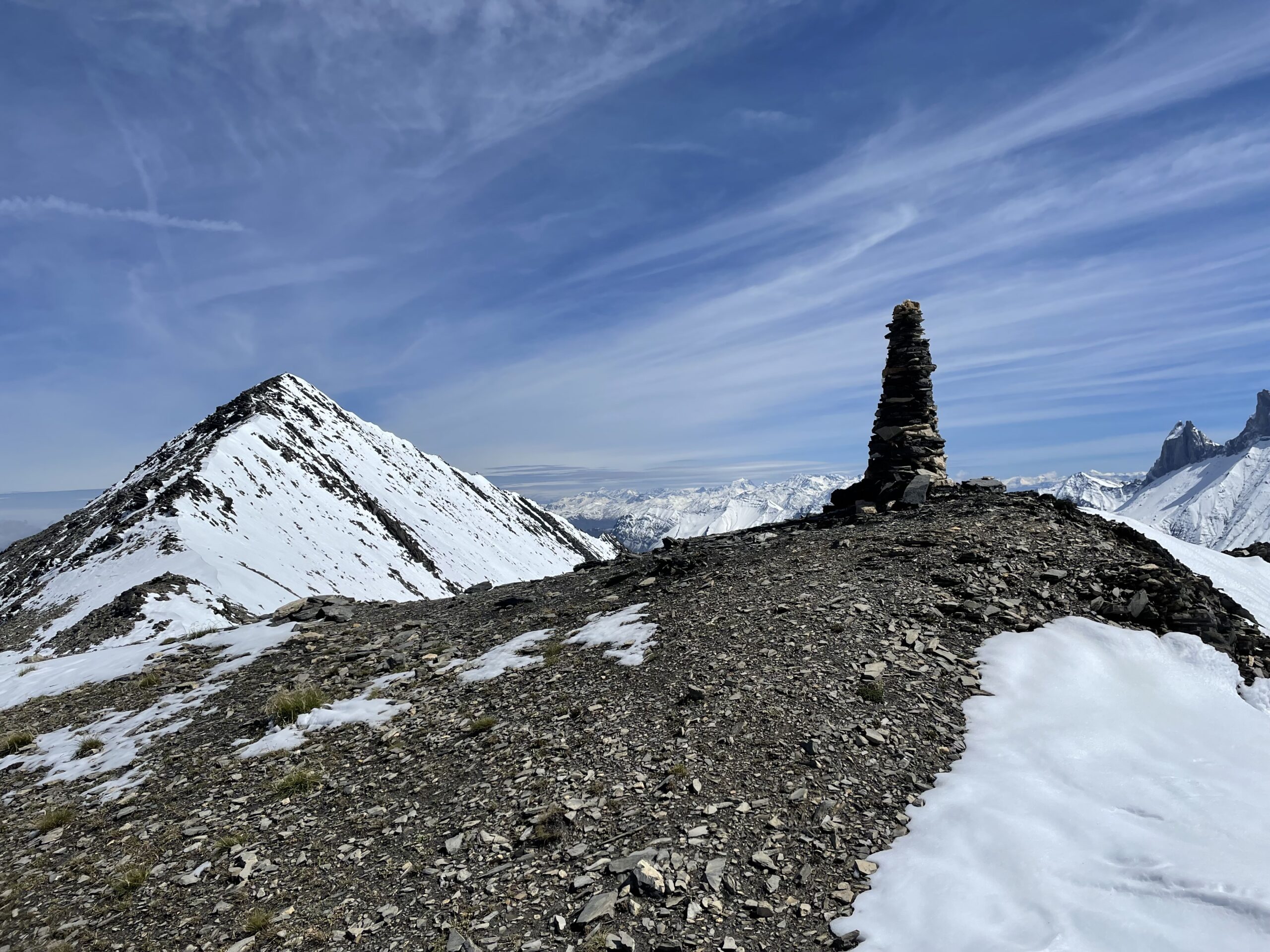 Sino a quota 2700 sono salito cercando di pestare meno neve possibile poi ho calzato i ramponcini che mi hanno agevolato sia in salita che in discesa anche nei tratti scoperti che erano di fanghiglia scivolosa. Arrivato all’anticima (ometto molto alto) ho poi proseguito sino a 40 metri dalla vetta dove ho trovato cornici di neve sul sentiero e non ho rischiato per i pochi metri rimanenti.