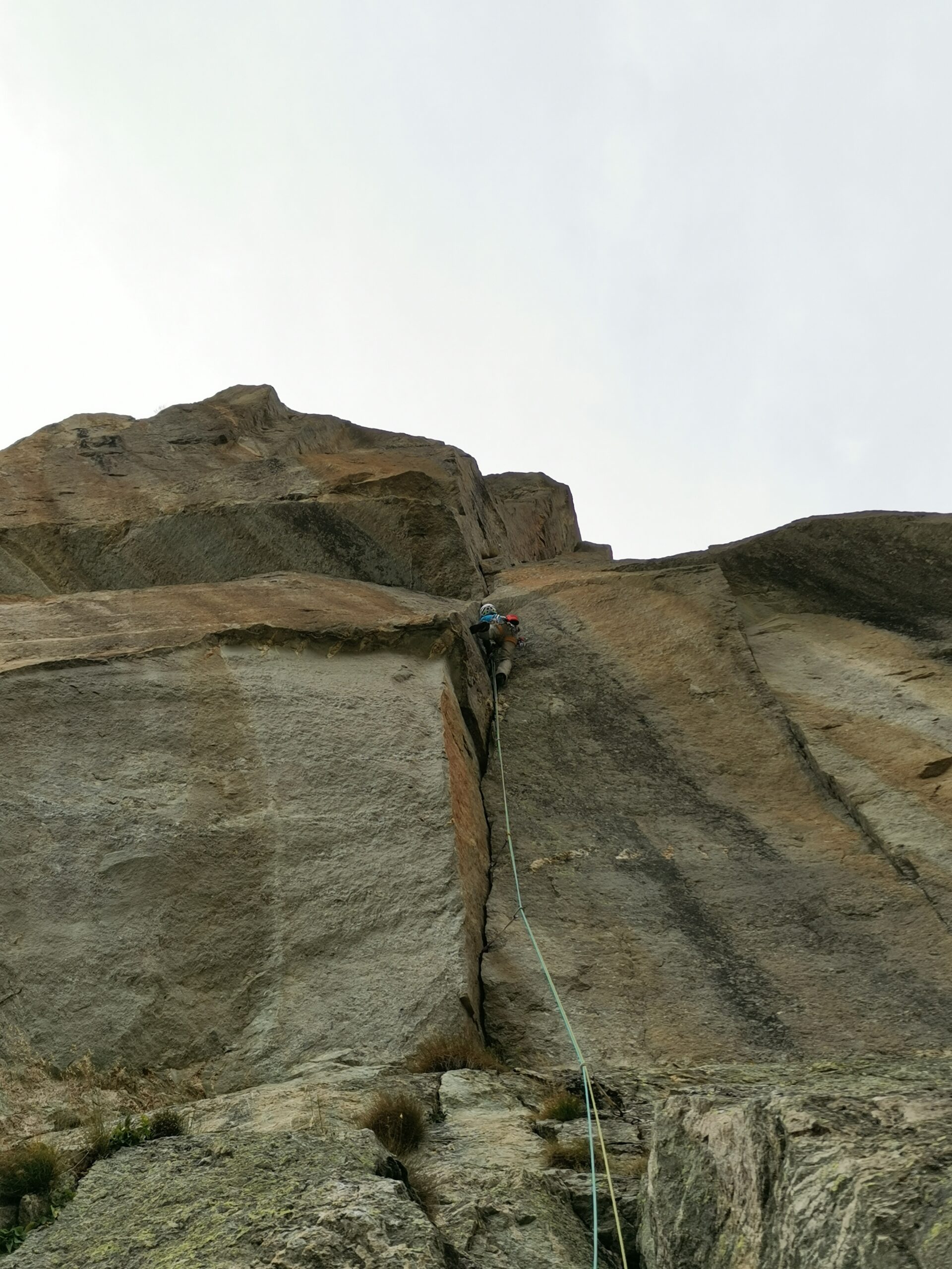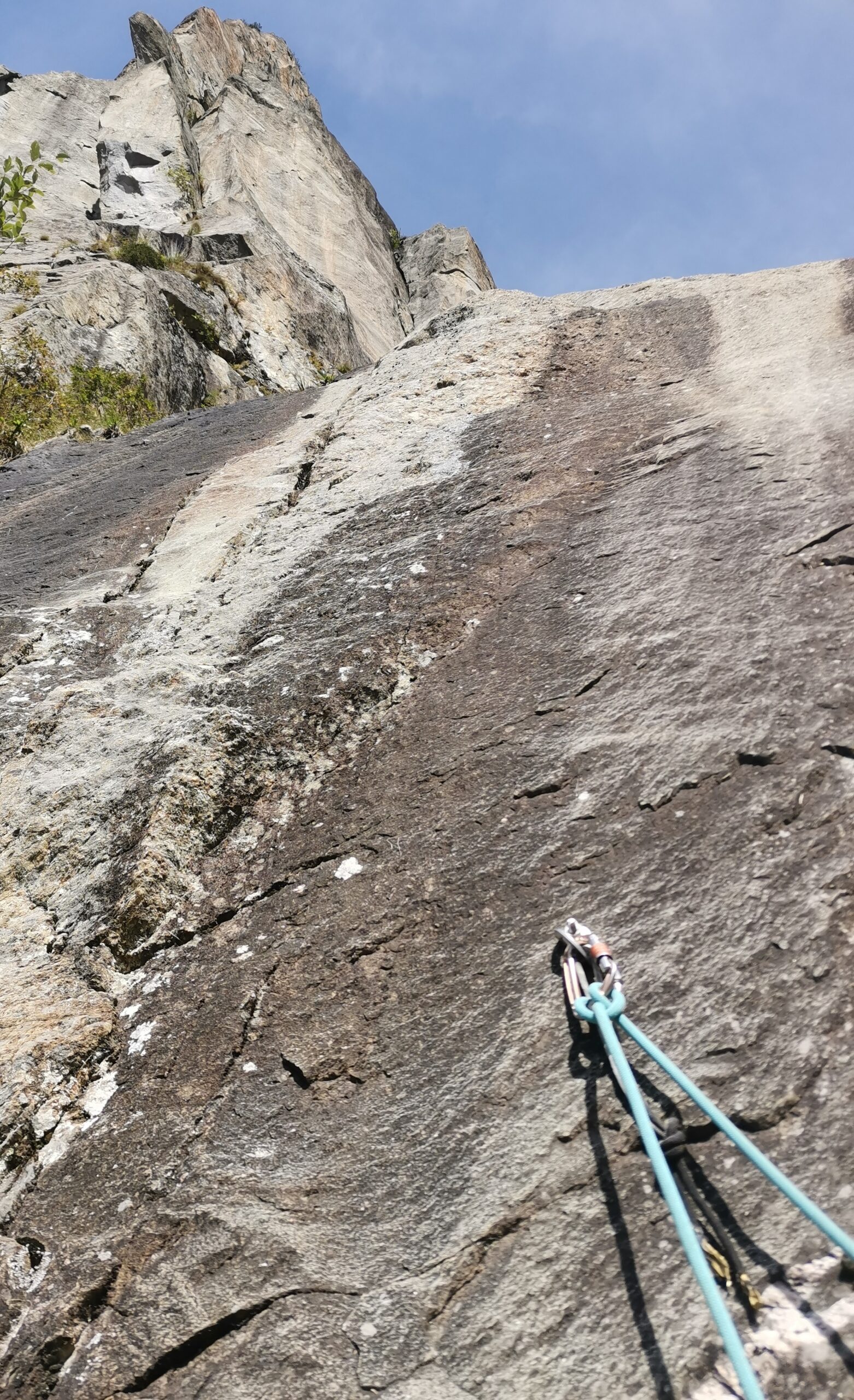 L2 è il tiro dove ho trovato l’ingaggio maggiore (leggi “stress”) perché il cervello non è ancora sintonizzato, perché il tiro è davvero lungo e le protezioni vanno centellinate, perché c’è un dannato blocco mobile nella sezione dura che forse rotola verso l’esterno addosso a chi arrampica, e perché per soprammercato c’è da metter su un bel pelo morbido sul finale in placca (seppur facile) che congela le ultime gocce di sudore sotto il casco.