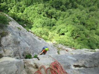 Via ancora da ripulire da terra e qualche sasso instabile. Ben chiodata, ad eccezione del tratto iniziale dell’ultimo tiro (attenzione !). Non servono protezioni mobili, se non cordini per diminuire gli attriti.