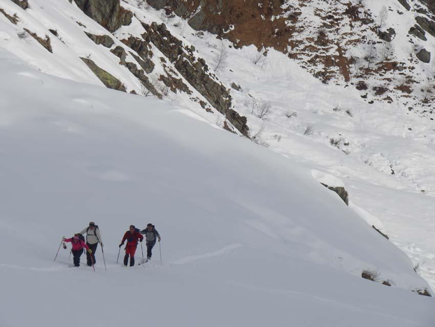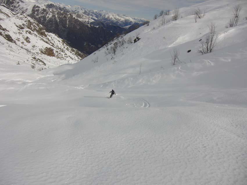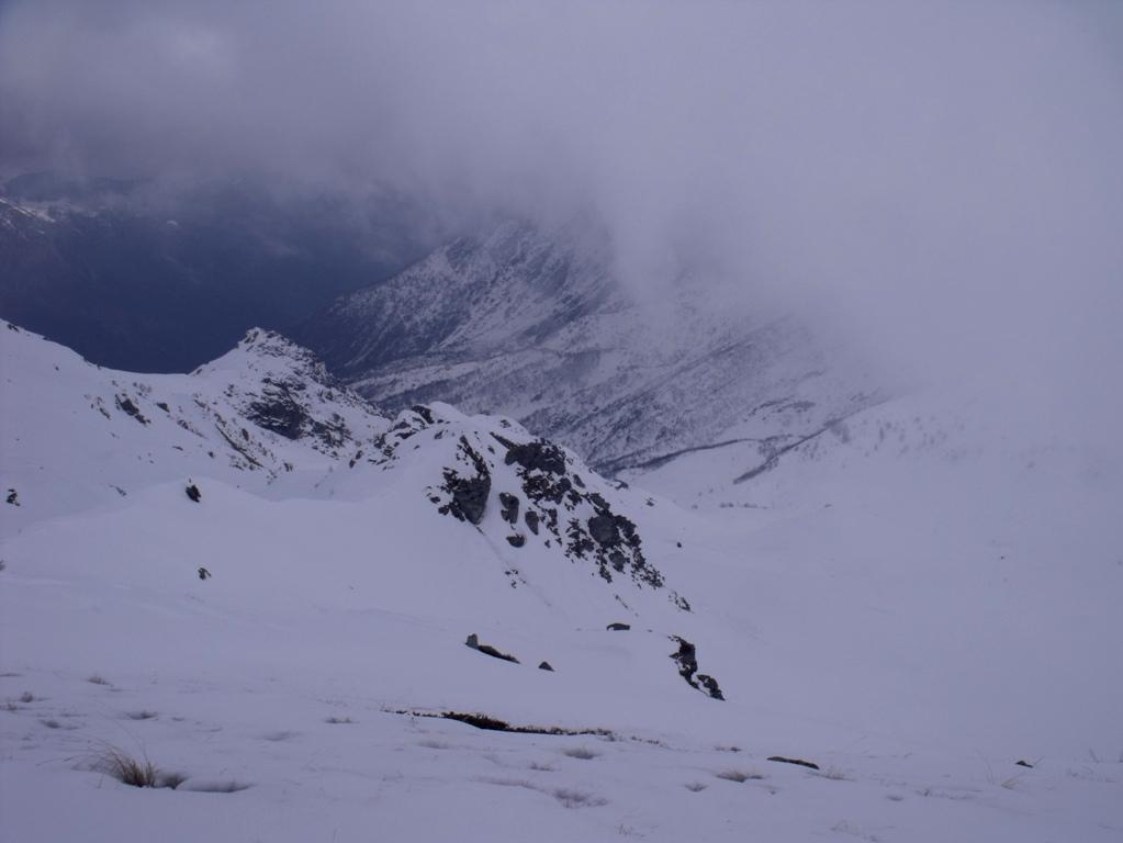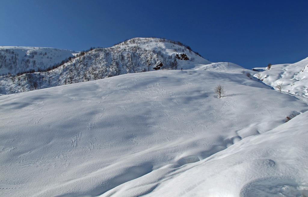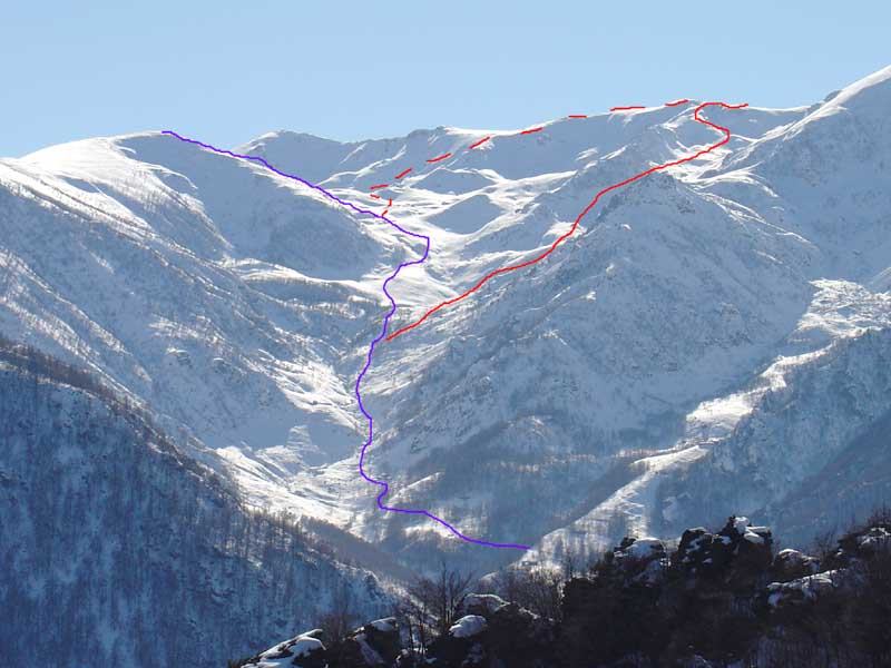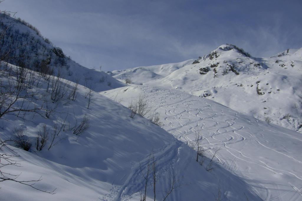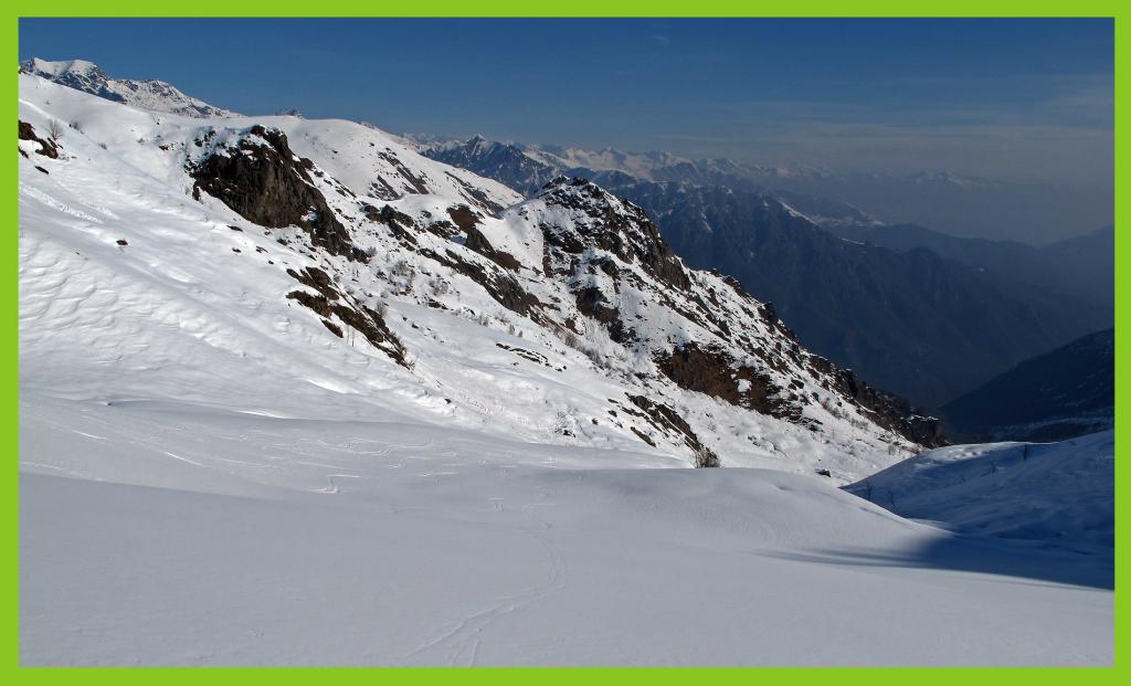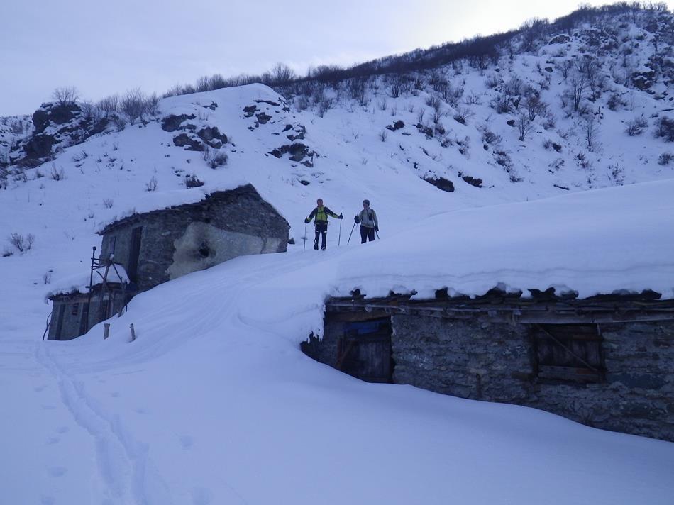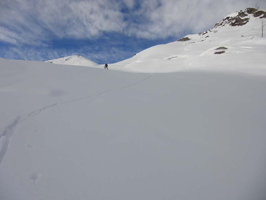 Variante: Invece di lasciare la sterrata per il Colle del Colombardo dove questa piega decisamente verso sinistra, e’ consiglibile proseguire lungo di essa per circa 50-60 metri per poi salire un ripido pendio molto piu’ aperto di quello indicato dalla relazione. Si prosegue quindi lungo il percorso del Rio di Nanta, sulla sua destra idrografica fino a ricongiungersi con il percorso originale nei prati sotto all’Alpe Pian del Luvas.