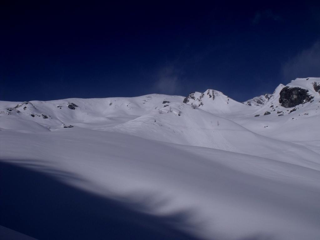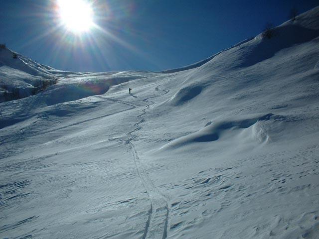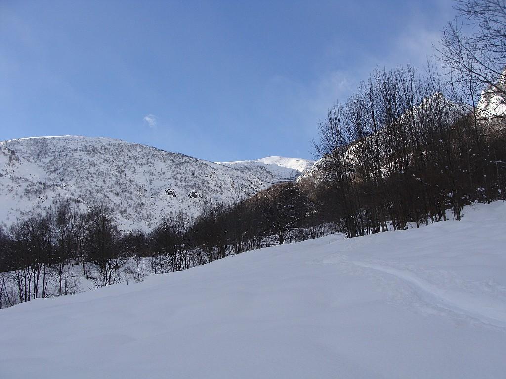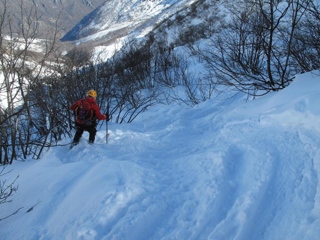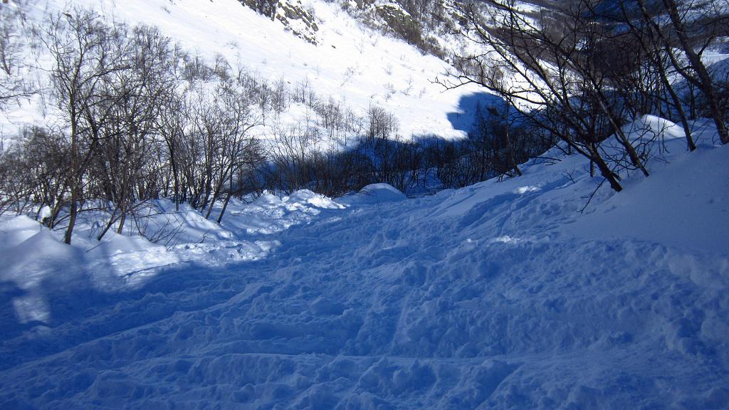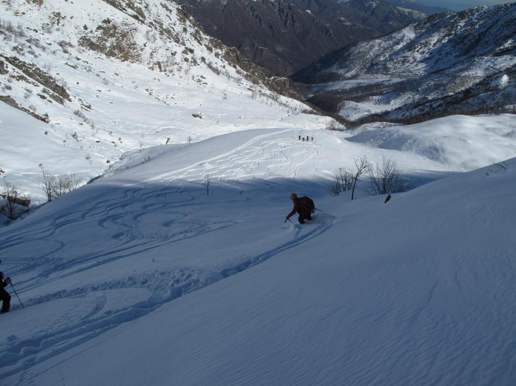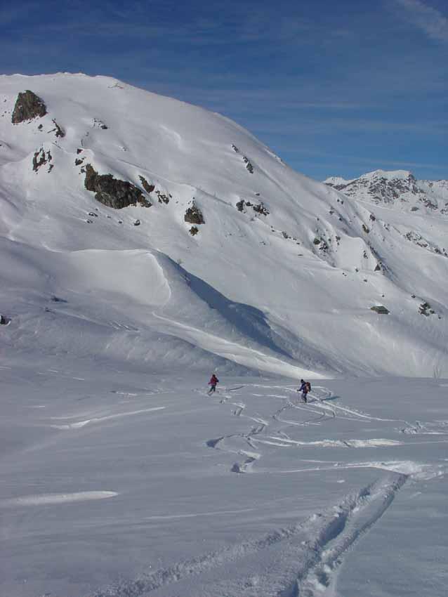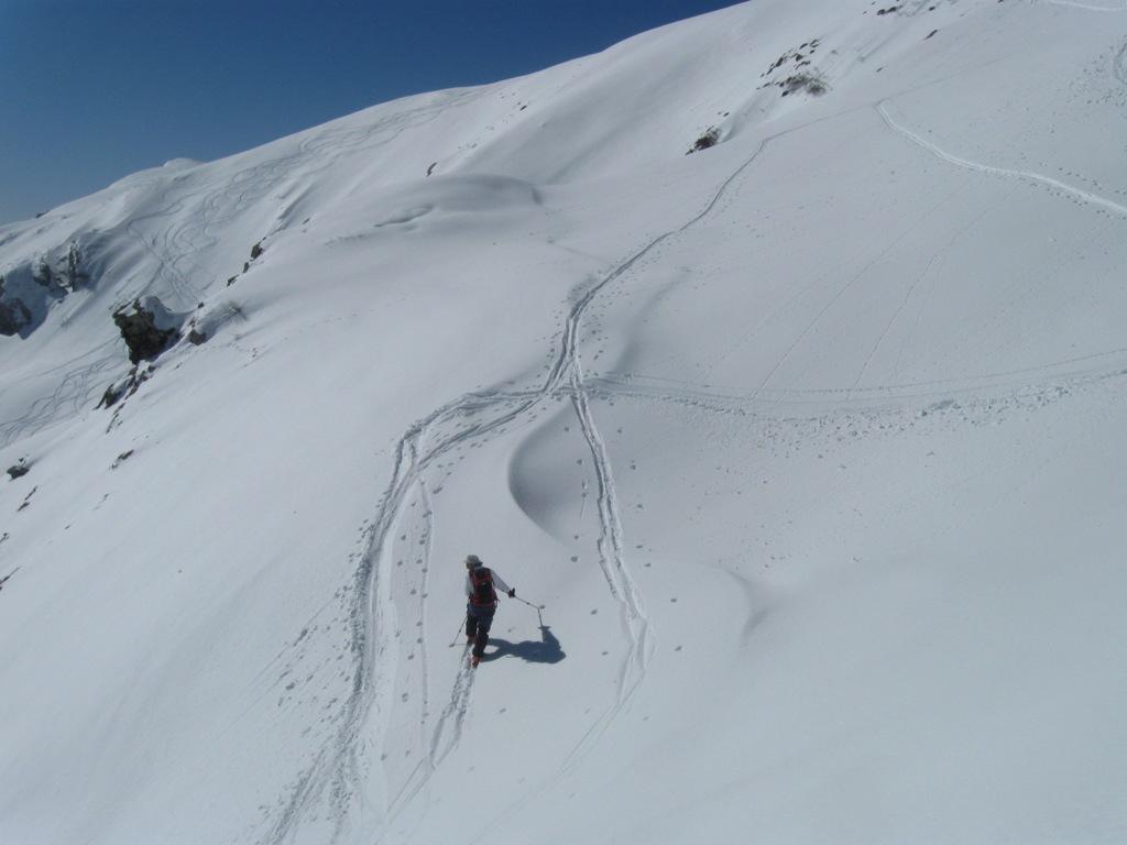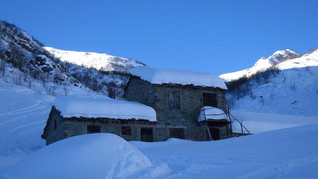 Variante: Invece di lasciare la sterrata per il Colle del Colombardo dove questa piega decisamente verso sinistra, e’ consiglibile proseguire lungo di essa per circa 50-60 metri per poi salire un ripido pendio molto piu’ aperto di quello indicato dalla relazione. Si prosegue quindi lungo il percorso del Rio di Nanta, sulla sua destra idrografica fino a ricongiungersi con il percorso originale nei prati sotto all’Alpe Pian del Luvas.