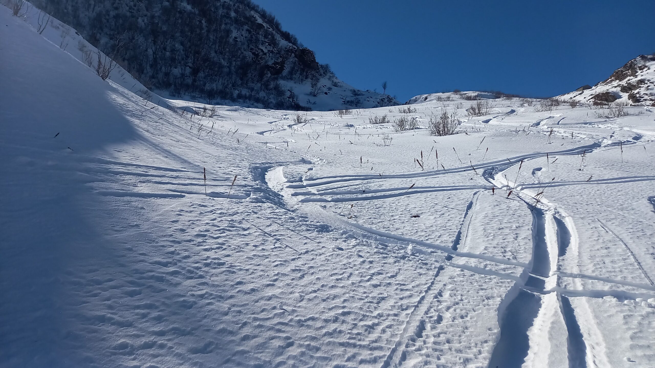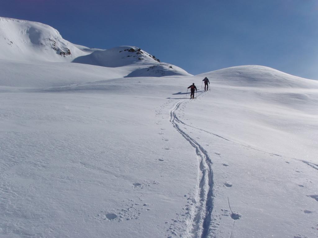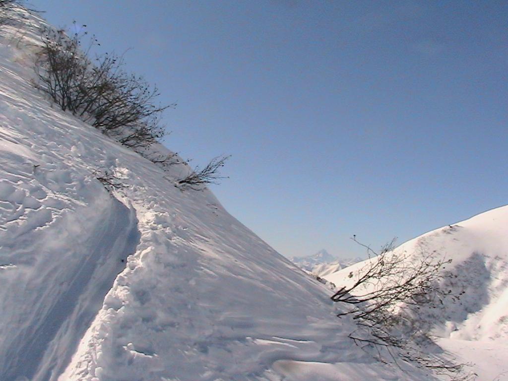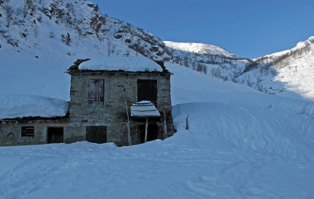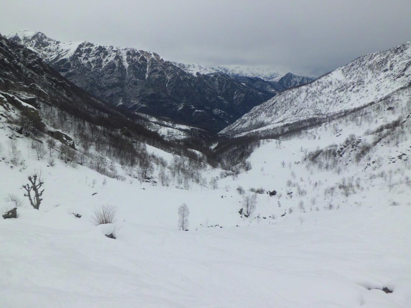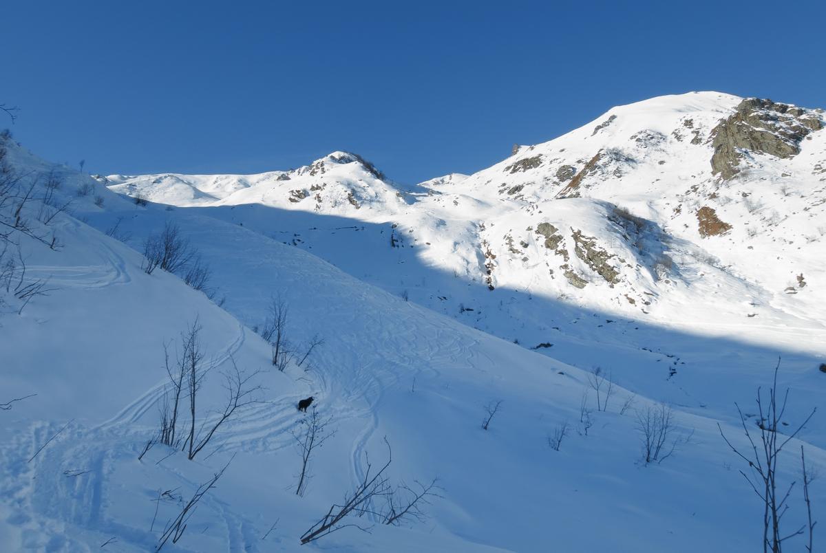 Variante: Invece di lasciare la sterrata per il Colle del Colombardo dove questa piega decisamente verso sinistra, e’ consiglibile proseguire lungo di essa per circa 50-60 metri per poi salire un ripido pendio molto piu’ aperto di quello indicato dalla relazione. Si prosegue quindi lungo il percorso del Rio di Nanta, sulla sua destra idrografica fino a ricongiungersi con il percorso originale nei prati sotto all’Alpe Pian del Luvas.
