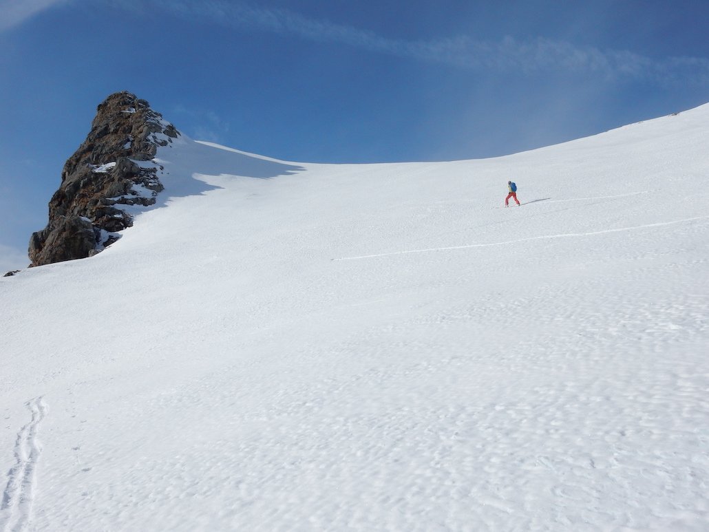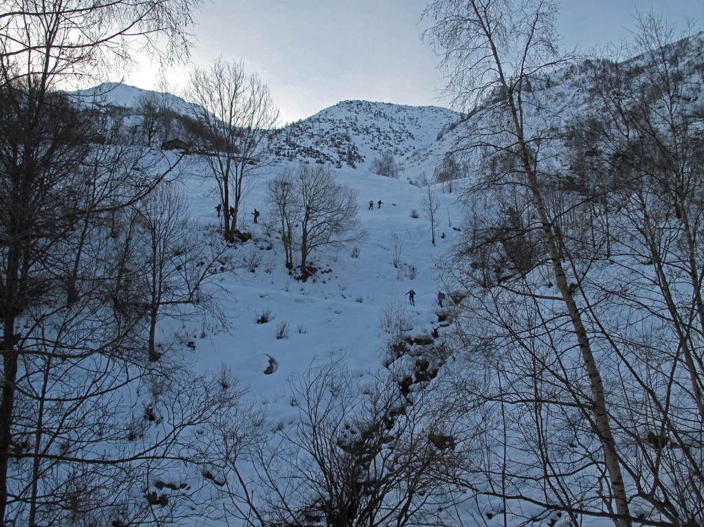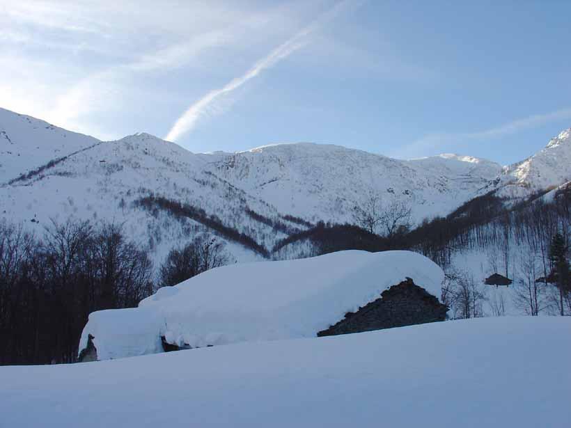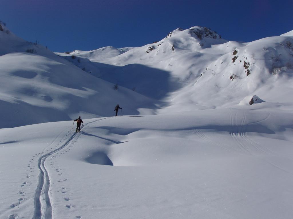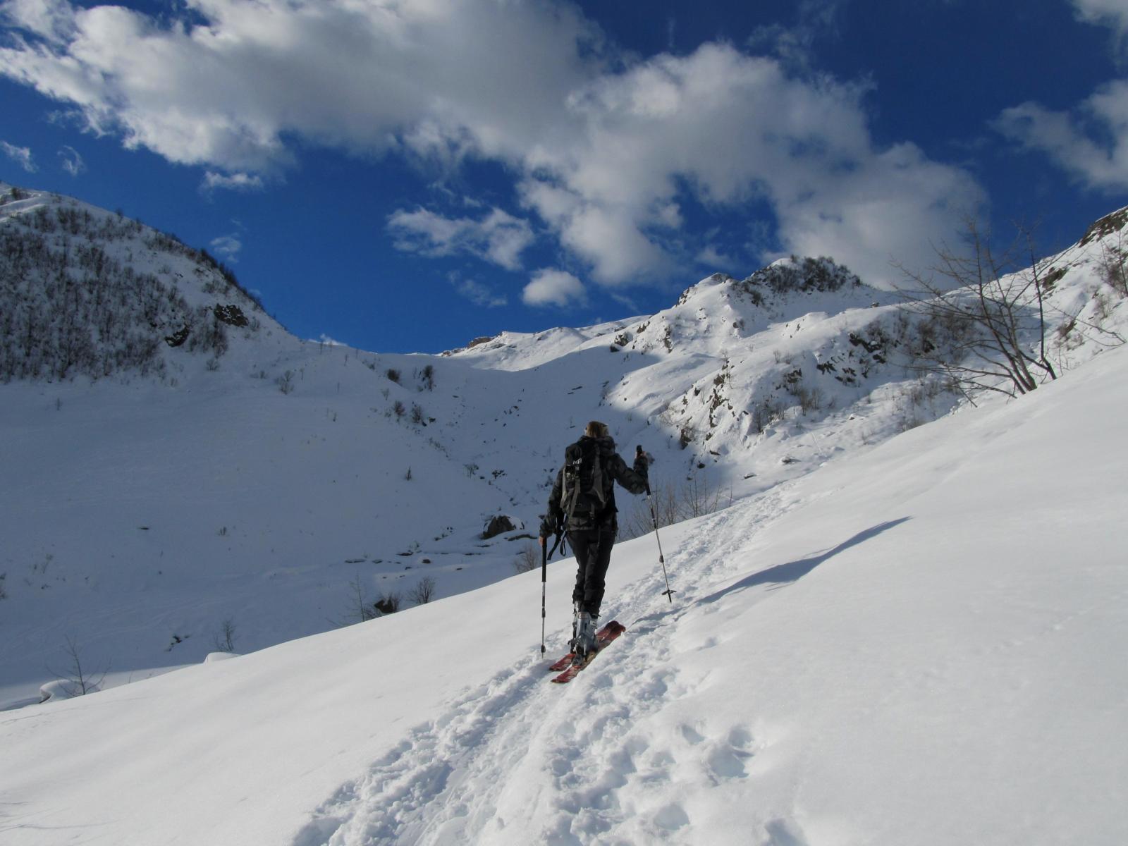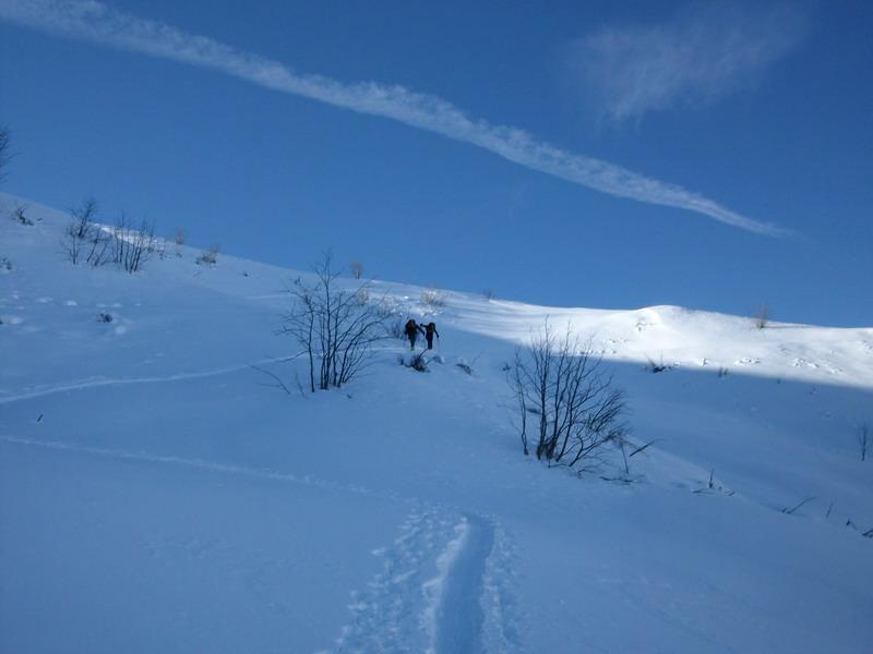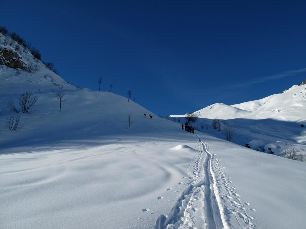 Variante: Invece di lasciare la sterrata per il Colle del Colombardo dove questa piega decisamente verso sinistra, e’ consiglibile proseguire lungo di essa per circa 50-60 metri per poi salire un ripido pendio molto piu’ aperto di quello indicato dalla relazione. Si prosegue quindi lungo il percorso del Rio di Nanta, sulla sua destra idrografica fino a ricongiungersi con il percorso originale nei prati sotto all’Alpe Pian del Luvas.