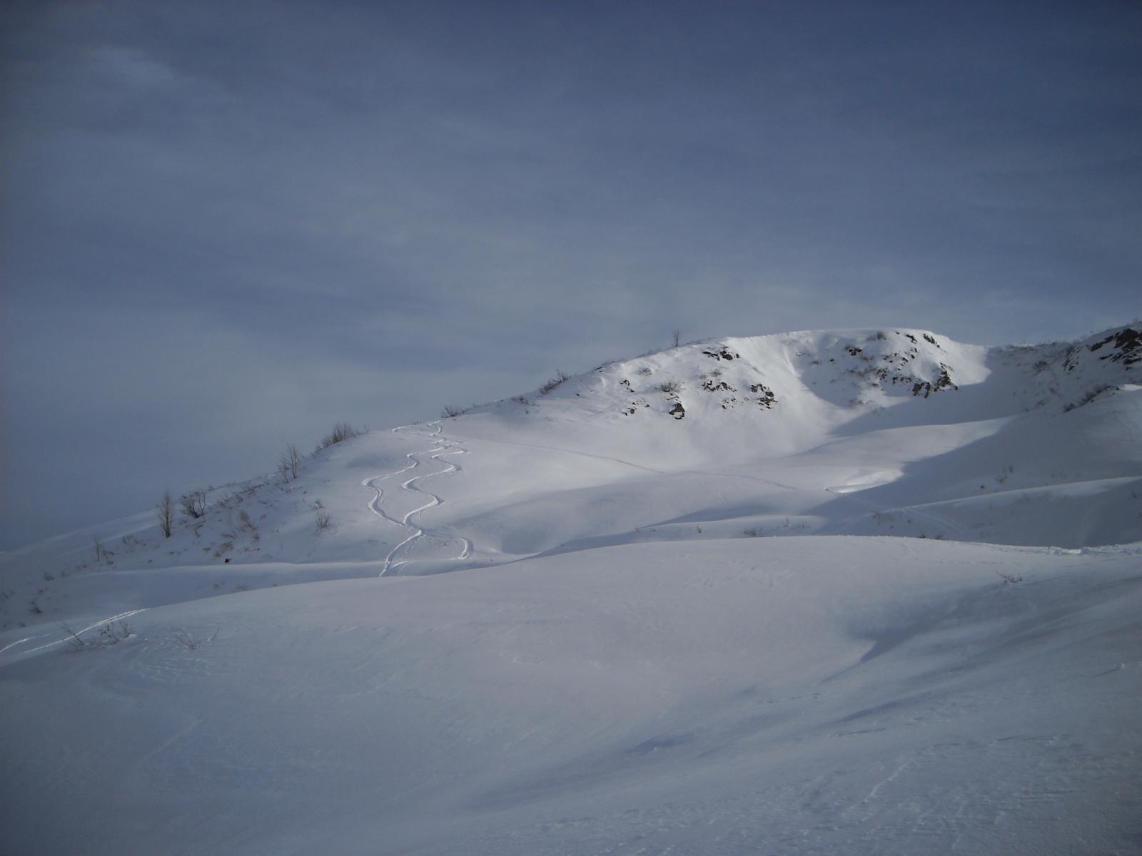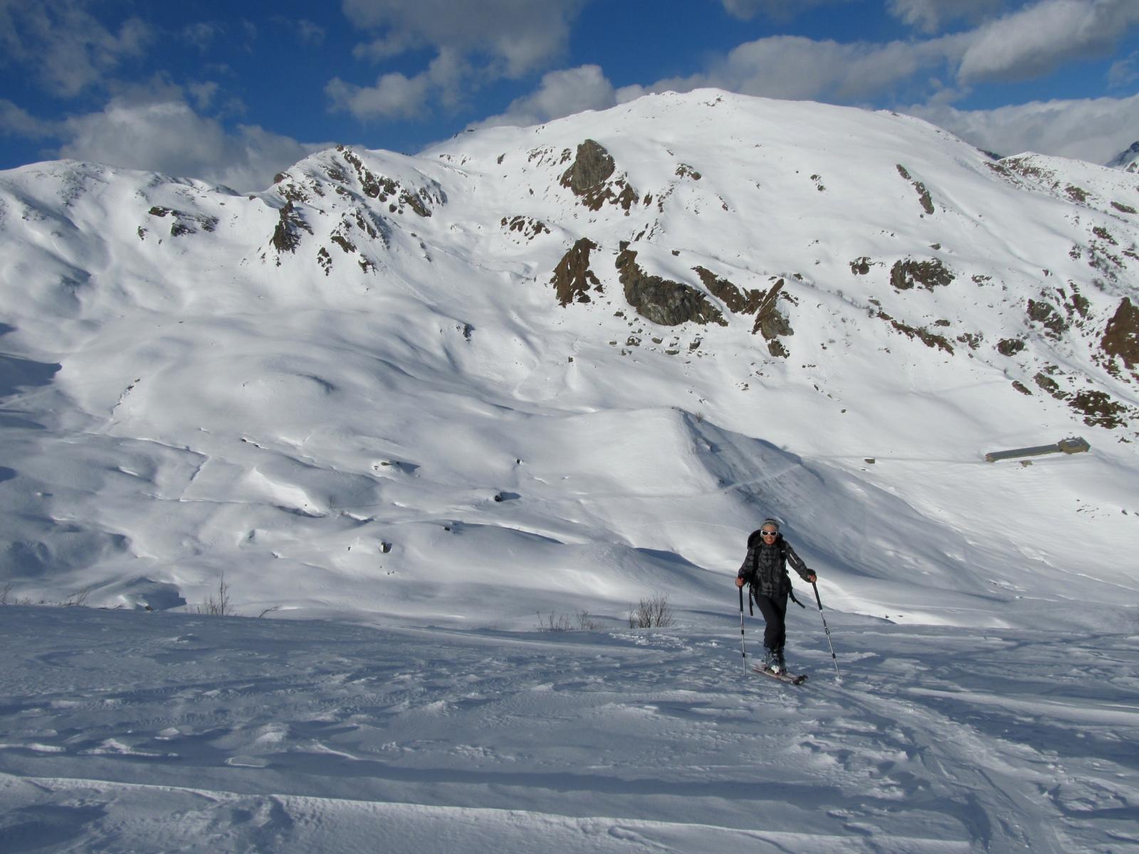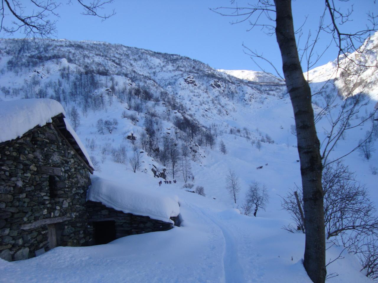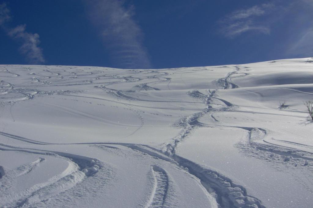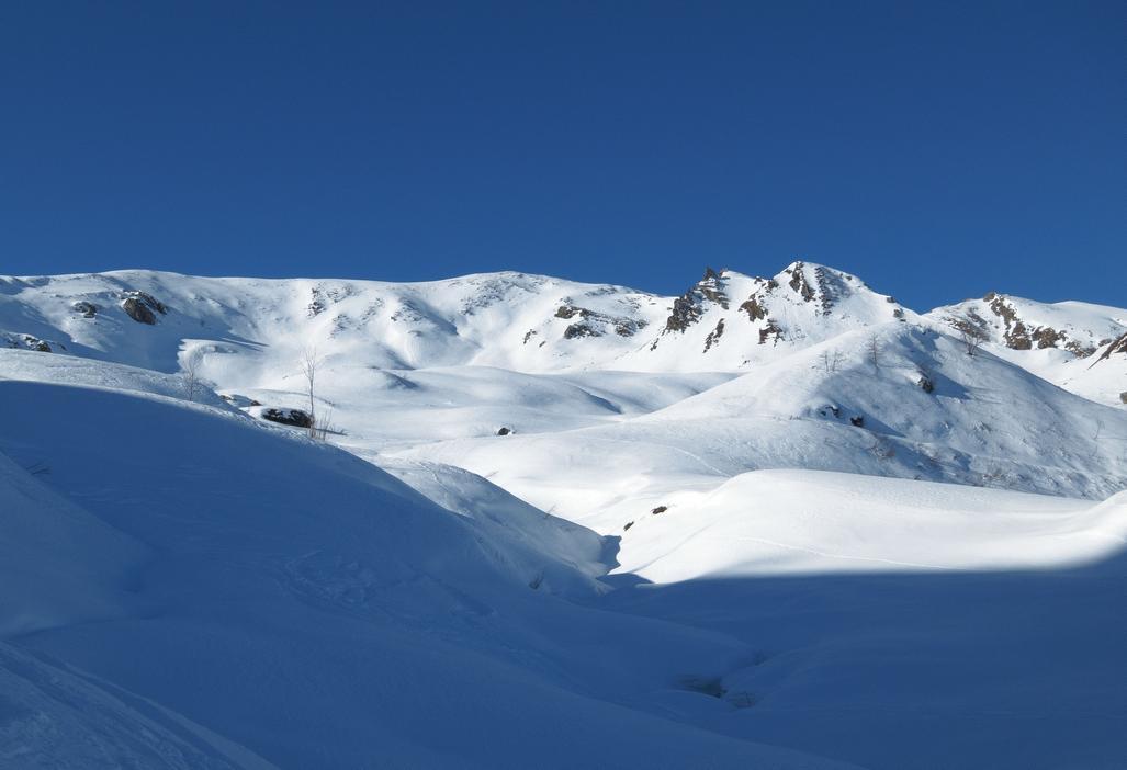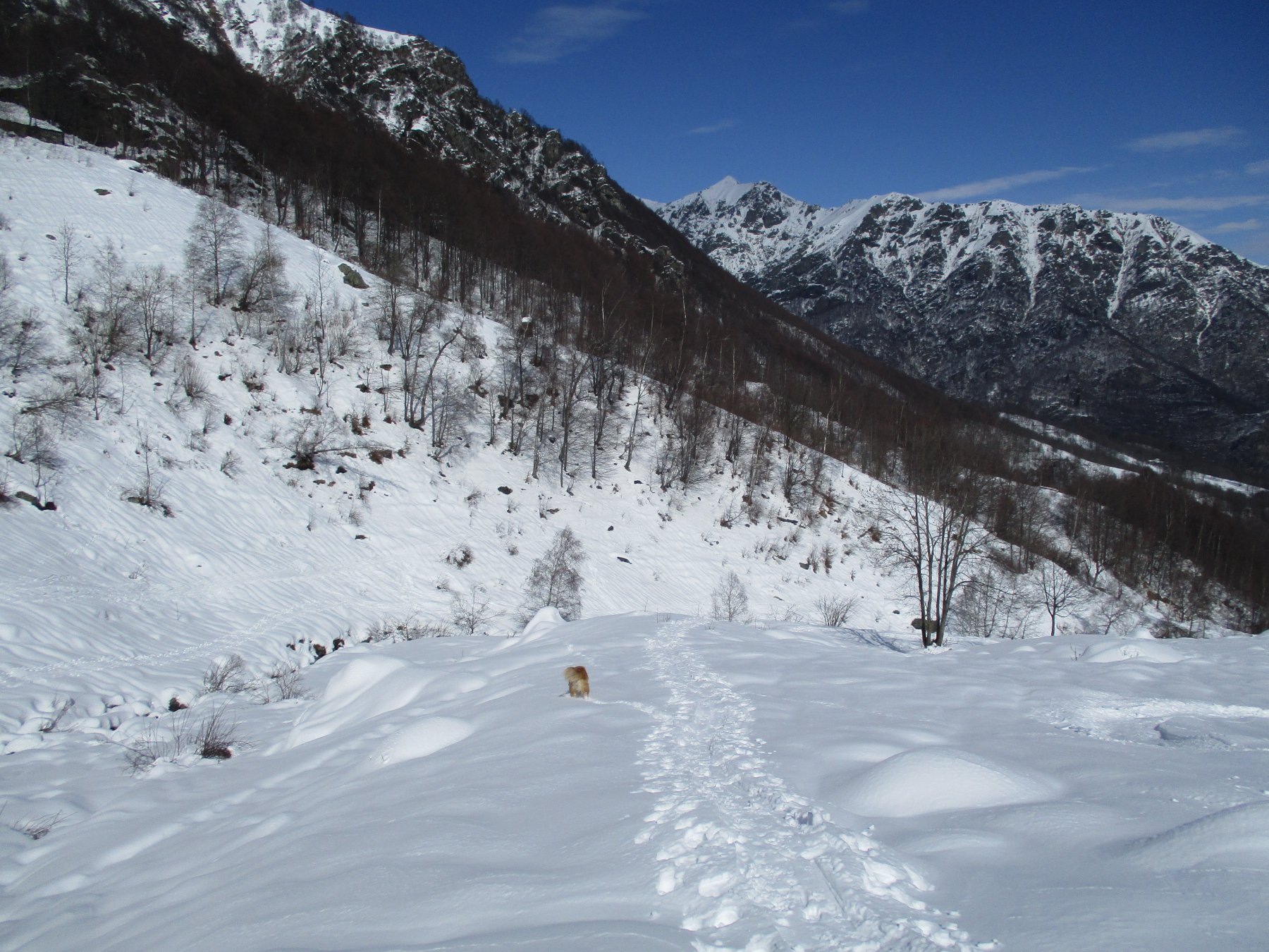 Variante: Invece di lasciare la sterrata per il Colle del Colombardo dove questa piega decisamente verso sinistra, e’ consiglibile proseguire lungo di essa per circa 50-60 metri per poi salire un ripido pendio molto piu’ aperto di quello indicato dalla relazione. Si prosegue quindi lungo il percorso del Rio di Nanta, sulla sua destra idrografica fino a ricongiungersi con il percorso originale nei prati sotto all’Alpe Pian del Luvas.