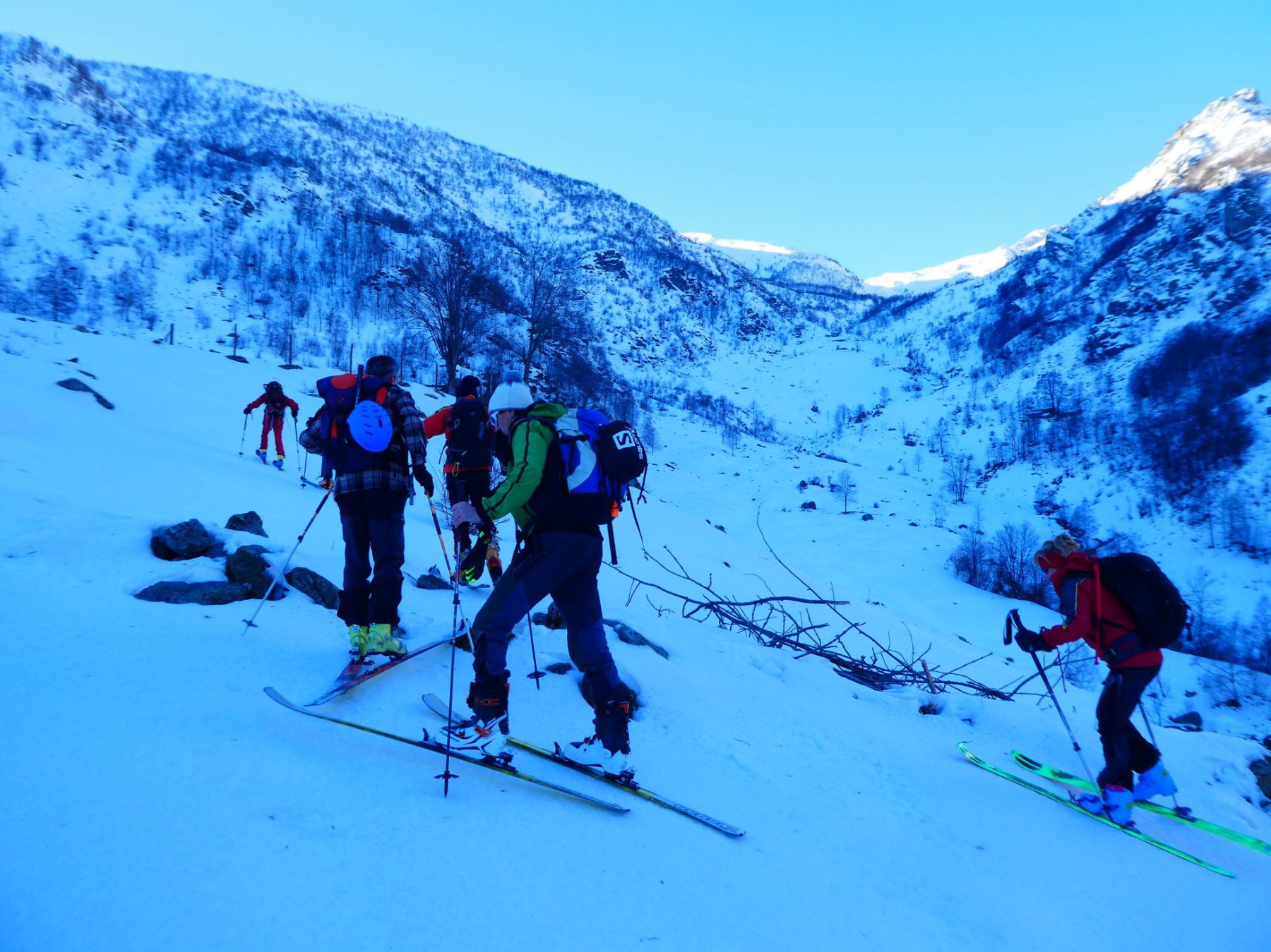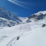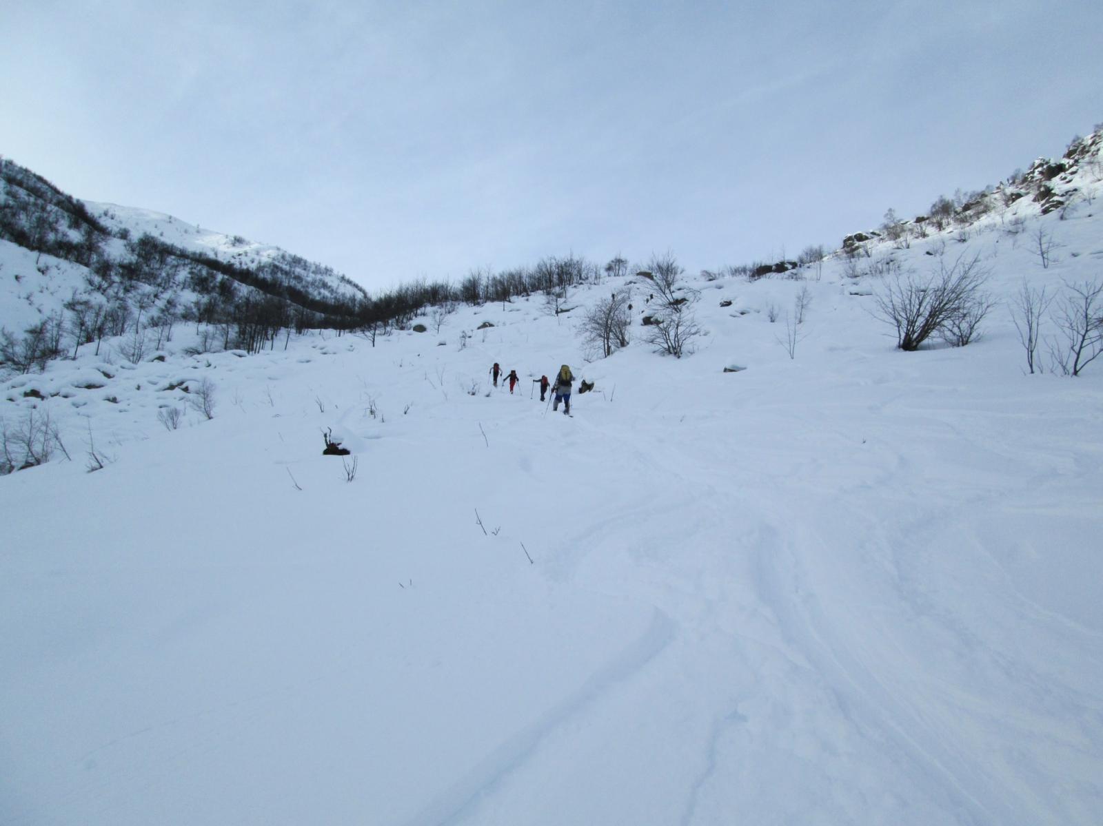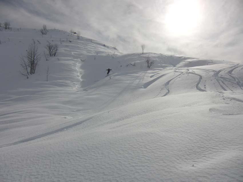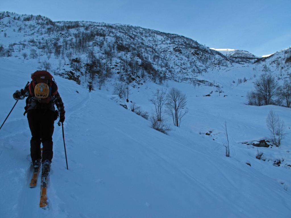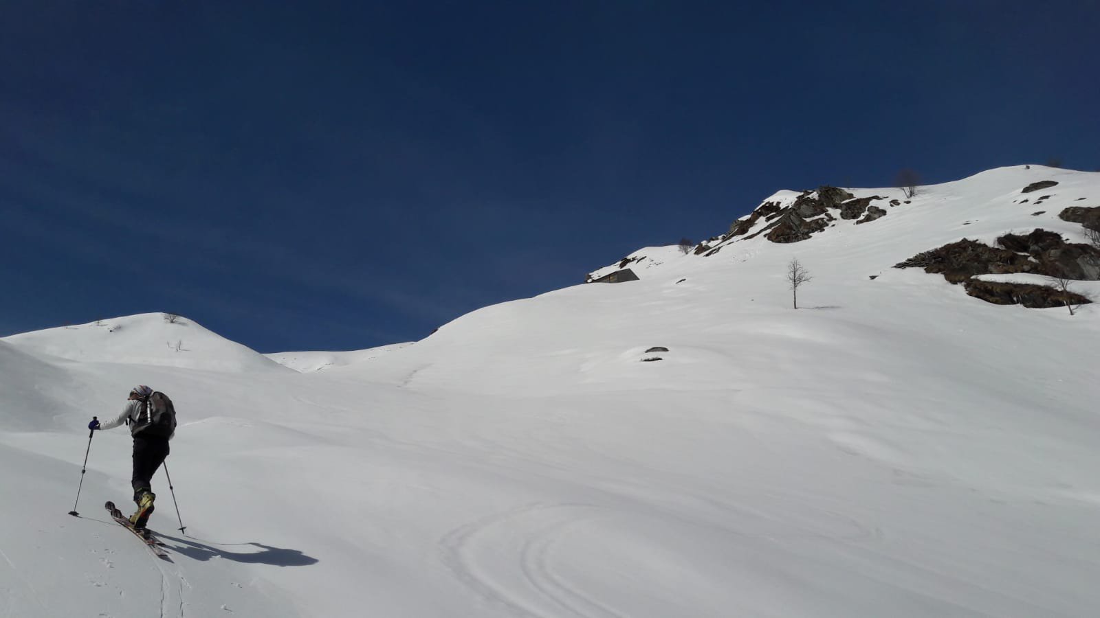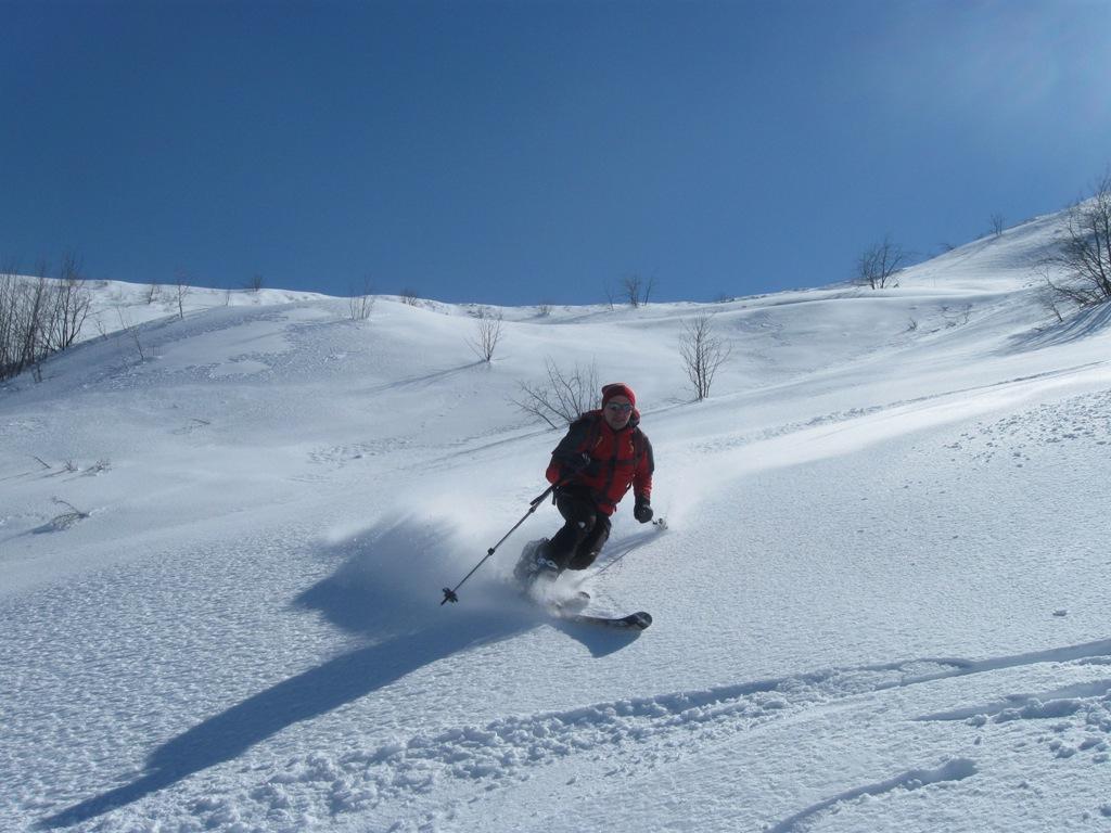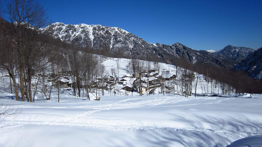 Variante: Invece di lasciare la sterrata per il Colle del Colombardo dove questa piega decisamente verso sinistra, e’ consiglibile proseguire lungo di essa per circa 50-60 metri per poi salire un ripido pendio molto piu’ aperto di quello indicato dalla relazione. Si prosegue quindi lungo il percorso del Rio di Nanta, sulla sua destra idrografica fino a ricongiungersi con il percorso originale nei prati sotto all’Alpe Pian del Luvas.