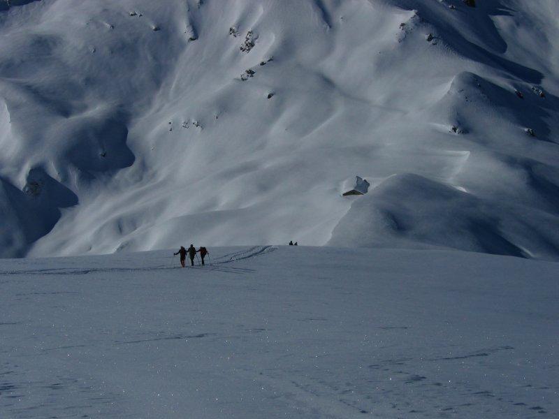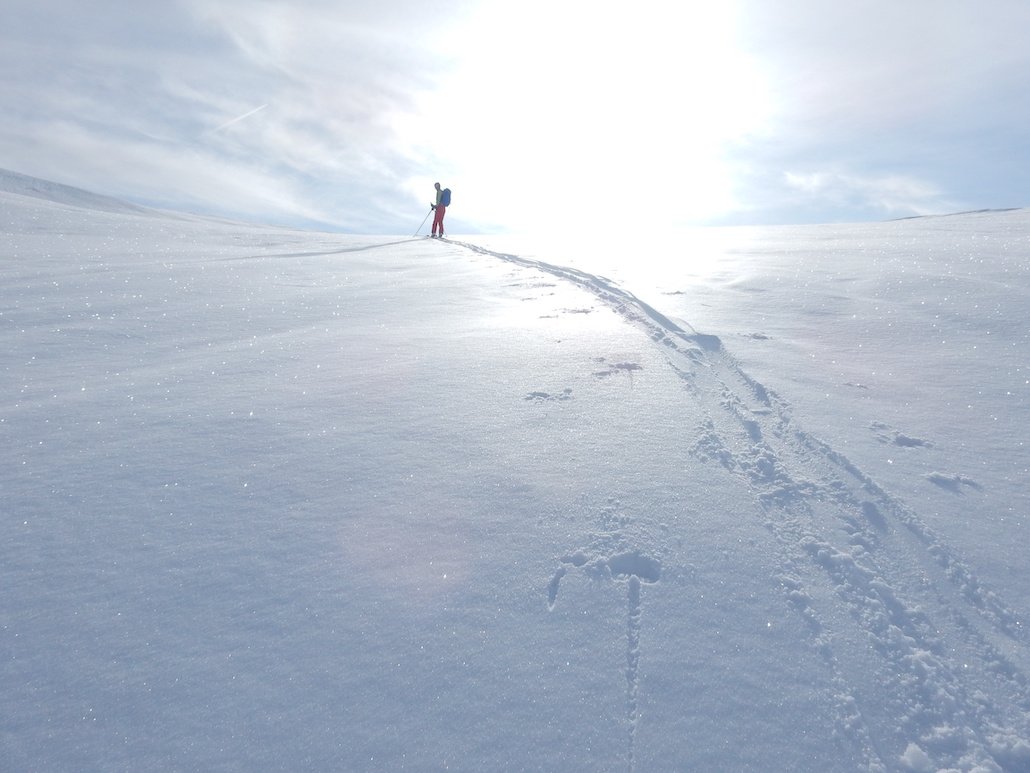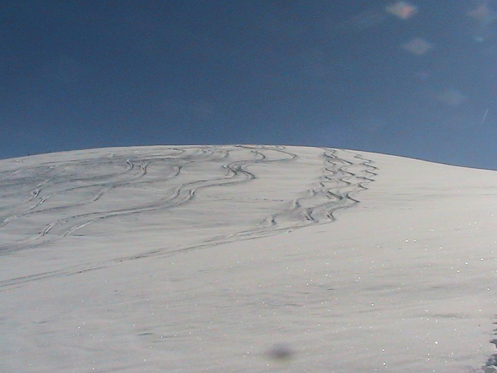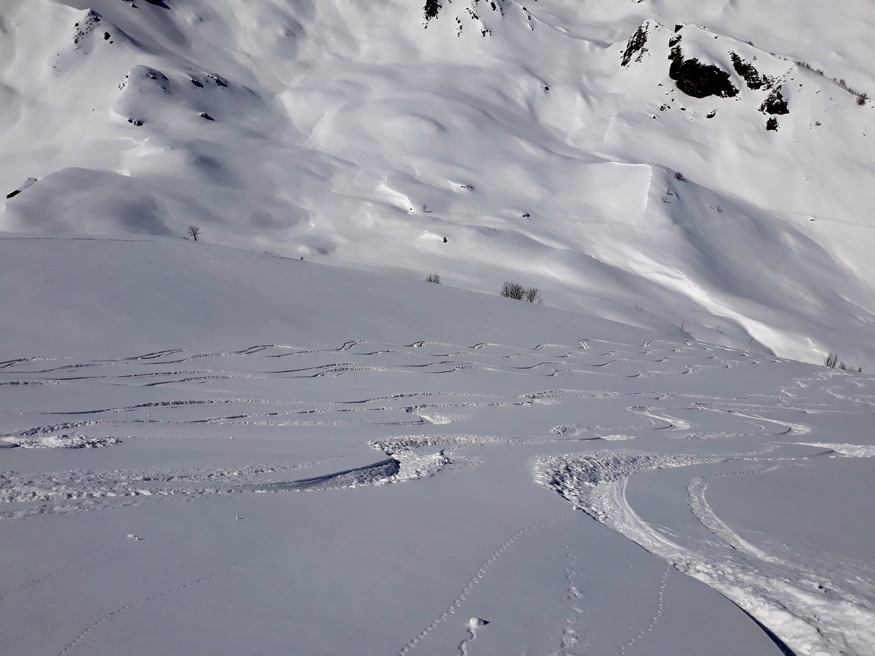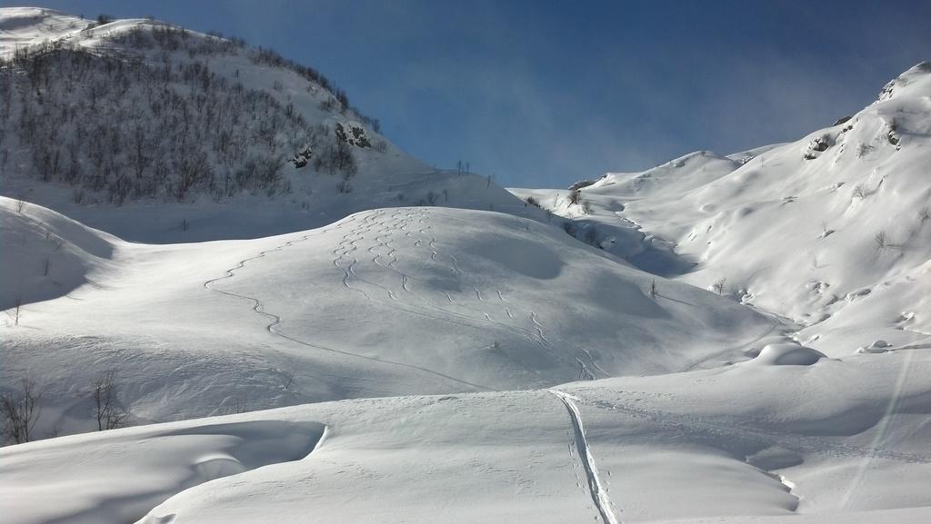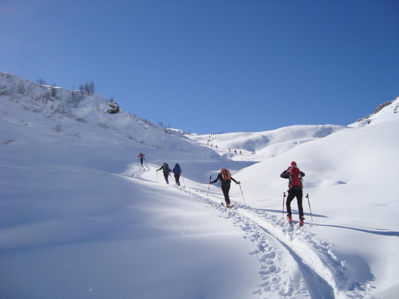 Variante: Invece di lasciare la sterrata per il Colle del Colombardo dove questa piega decisamente verso sinistra, e’ consiglibile proseguire lungo di essa per circa 50-60 metri per poi salire un ripido pendio molto piu’ aperto di quello indicato dalla relazione. Si prosegue quindi lungo il percorso del Rio di Nanta, sulla sua destra idrografica fino a ricongiungersi con il percorso originale nei prati sotto all’Alpe Pian del Luvas.