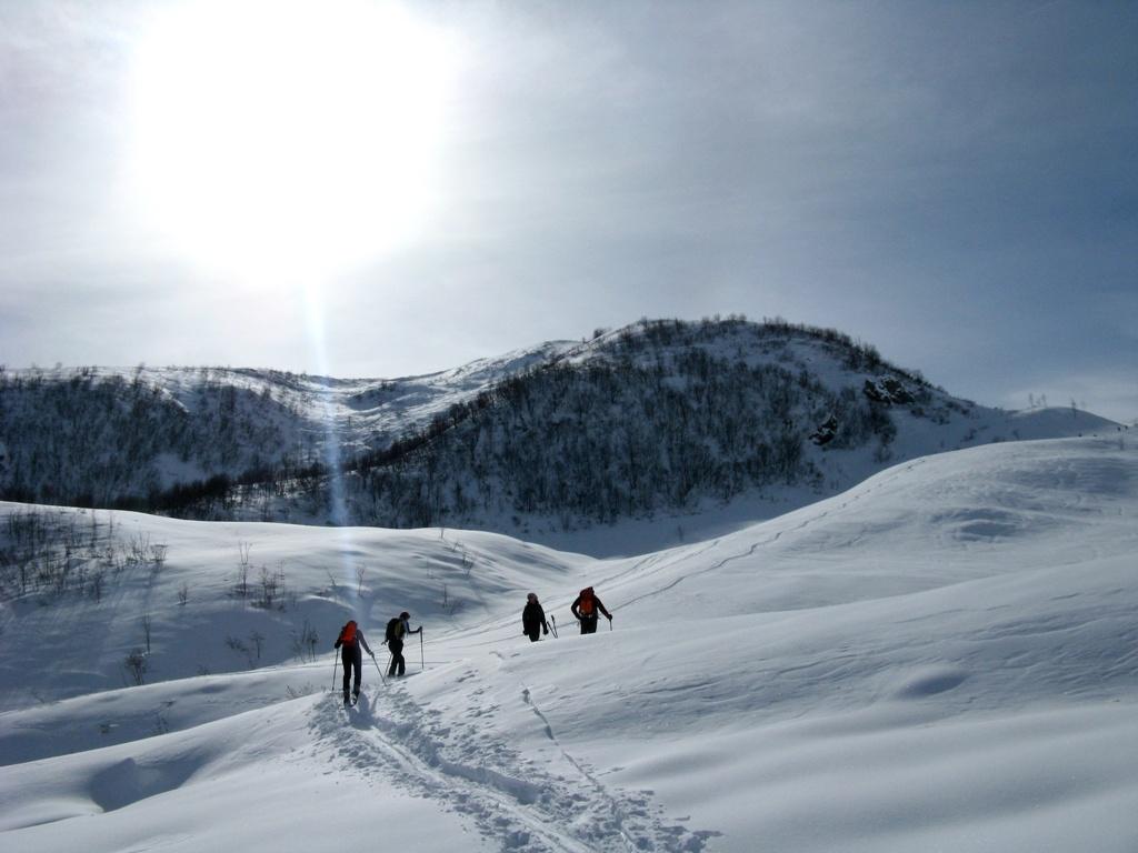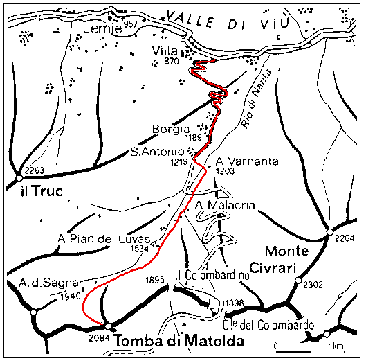 Da S.Antonio proseguire lungo il tracciato della sterrata per il Colle del Collombardo fino a che questa piega decisamente verso sinistra, in direzione del Monte Civrari. Si prosegue invece sulla destra lungo il percorso del Rio di Nanta, sulla sua destra idrografica. Con tratti di falsopiano intervallati ad altri piu’ ripidi ci si porta sotto alla Rocca di Toro, quindi con un traverso verso sx si raggiunge una zona pianeggiante. Si attraversa il torrente e si sale sul panettone di sinistra sotto le propaggini della Tomba di Matolda, proseguendo per dolci pendii sempre sopra il corso del Rio; quando sul versante opposto del vallone appare l’Alpe della Sagna, si e’ ormai in prossimita’ dello spartiaque con la Val di Susa. Continuando a sinistra si risale il dosso nevoso, raggiungendo la la spianata sommitale della Tomba di Matolda.