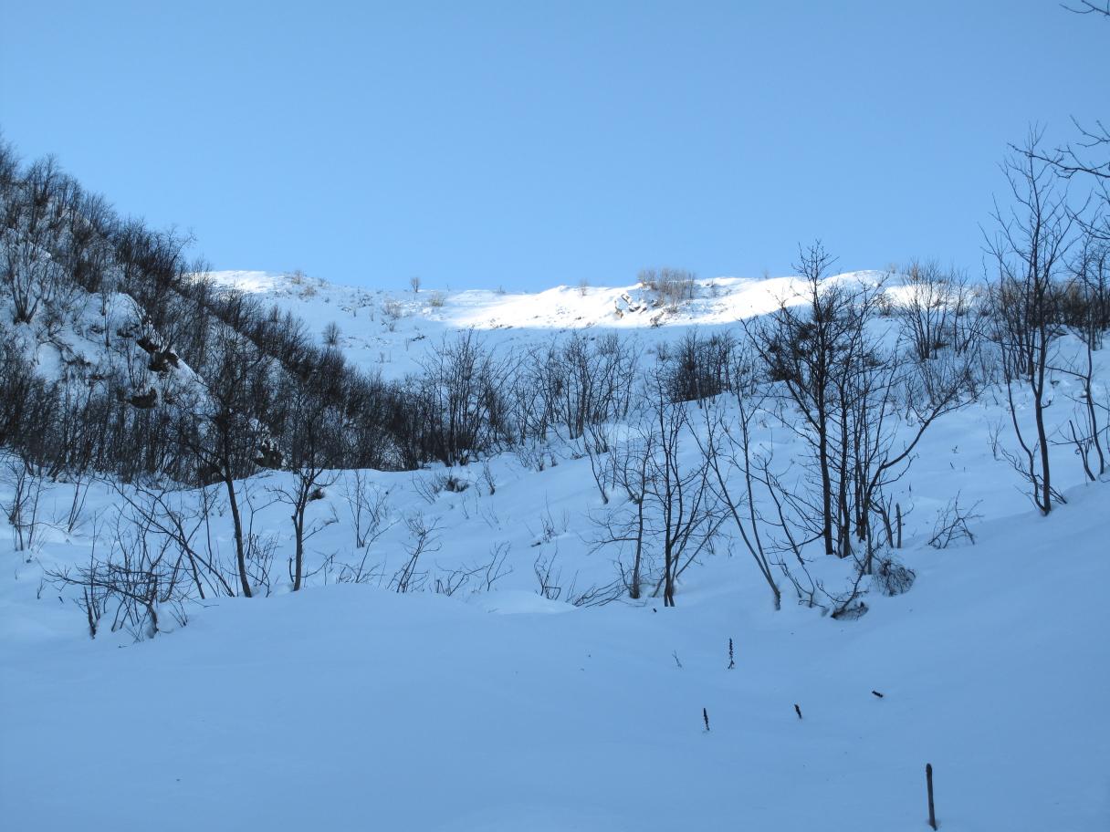 L’esposizione a nord ha mantenuto discrete condizioni di neve, dai 15 cm in basso ai 50 cm in alto. Percorso tutto in ombra.