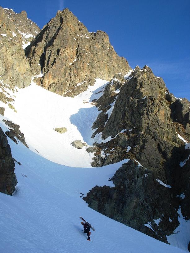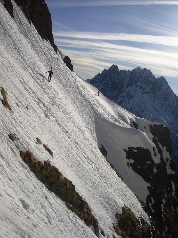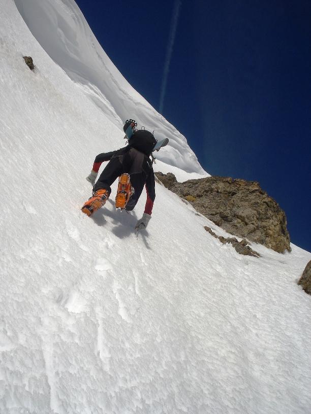 Superare una goulotte ghiacciata (evitabile in discesa) e aggirando i grandi torrioni puntare verso la cima est.