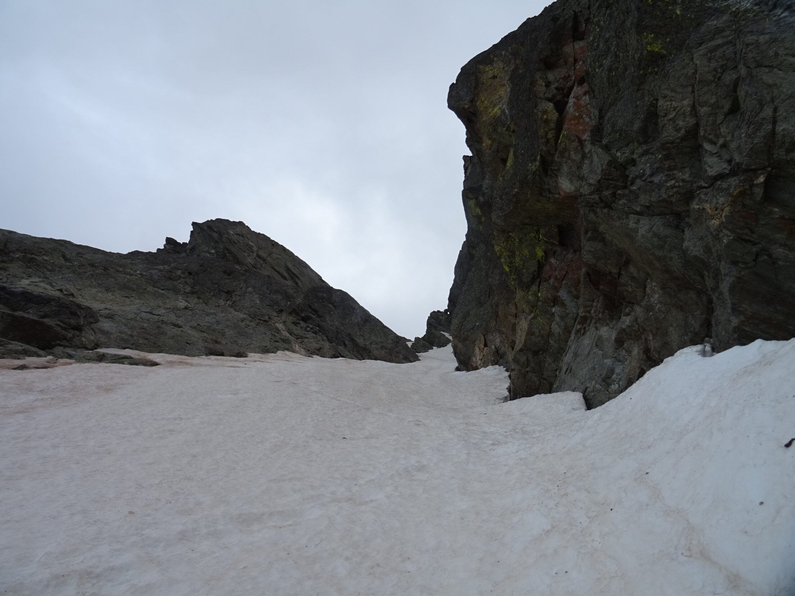 Risalire il canale per intero: 150m a 35-40°, via via più stretto e incassato, 200m a 45° con uscita a 50°.