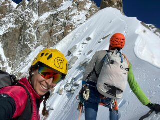 Salita a mio giudizio in condizioni spettacolari, cresta interamente ricoperta di neve , alcuni tratti brevi di roccia dall’ androsance in su!! Tutta perfettamente tracciata, saliti dall’attacco diretto’ terminale presso che inesistente’, tratto di ghiaccio vivo a 30 metri dal colle finale che richiede un po di dimestichezza con l’attrezzatura.
