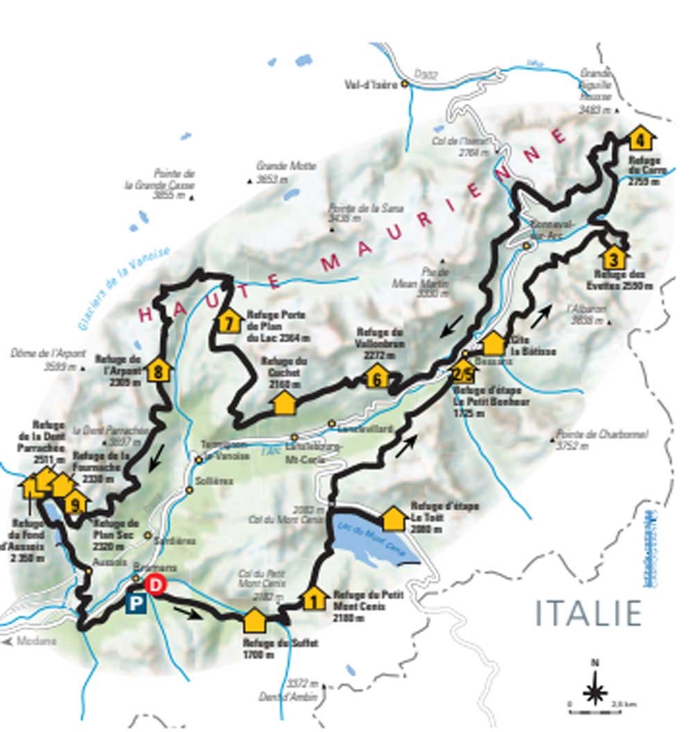 Sentiero GR5, Plan de la Cha (possibile deviazione per visitare il sito di incisioni Pierre aux Pieds), Rifugio Cuchet (non gestito – per pernottare informarsi delle chiavi) , Pré Vaillant, salita a La Turra de Termignon, Bercheren, La Femma, Les Arcelles, Bellecombe e breve risalita al Rifugio Porte du Plan du Lac.