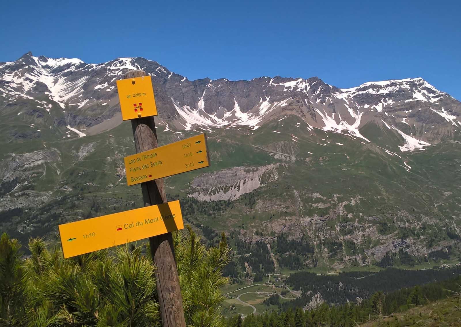Prendere il sentiero balcone che passa a Le Reys, Plan des Eaux e giunge al Pont de l’Oulietta. Scendere a Pied Montet, Pra Bouvier, salire il dosso Les Druges, imboccare il GR5 nella gola del Grand Coin, proseguire per il Pont du Vallon, Le Mollard, Le Villaron e Bessans.