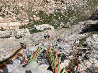 Primi due tiri intensi ma ben protetti, terzo con passo ancora ostico alla seconda protezione.